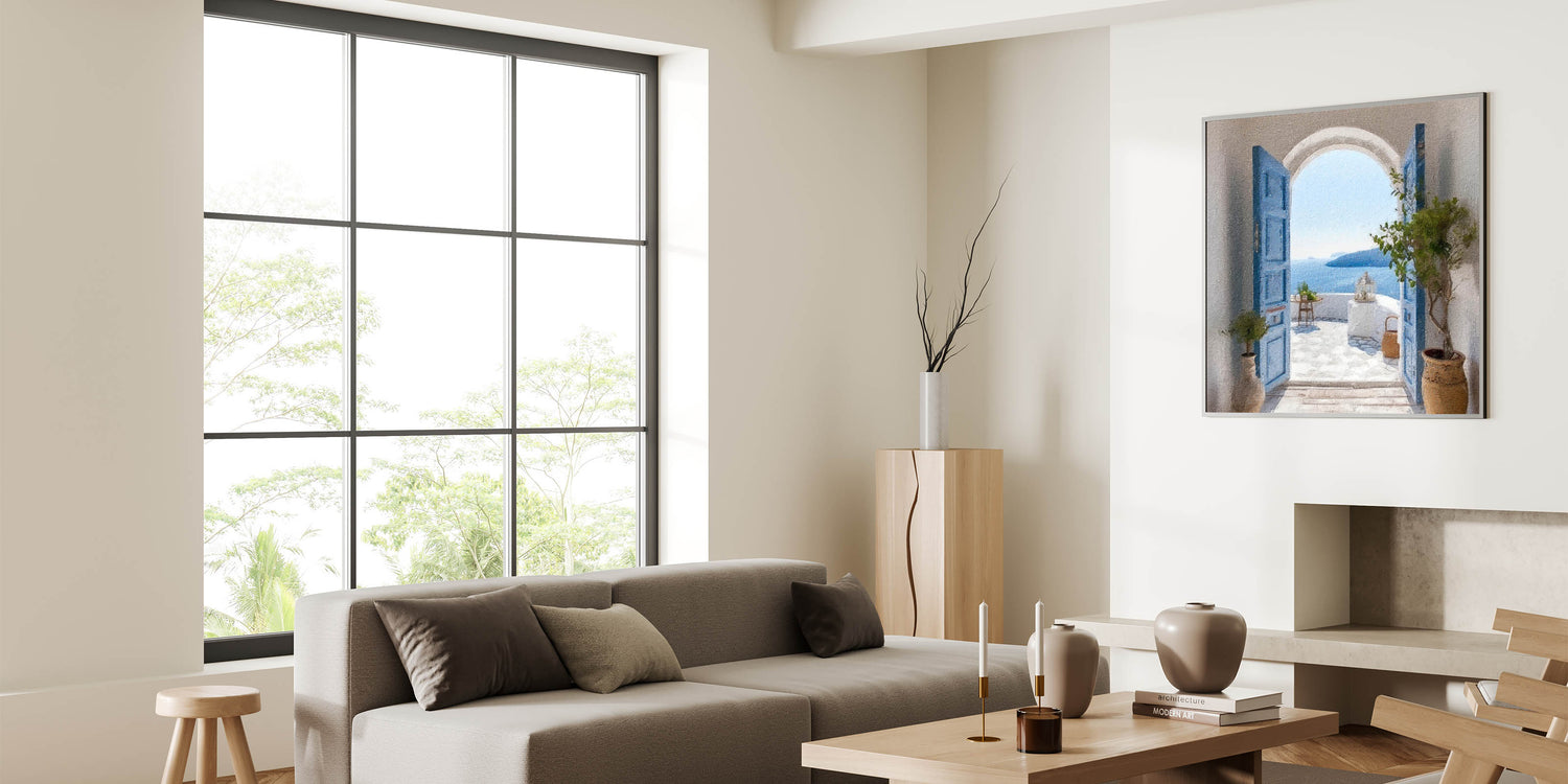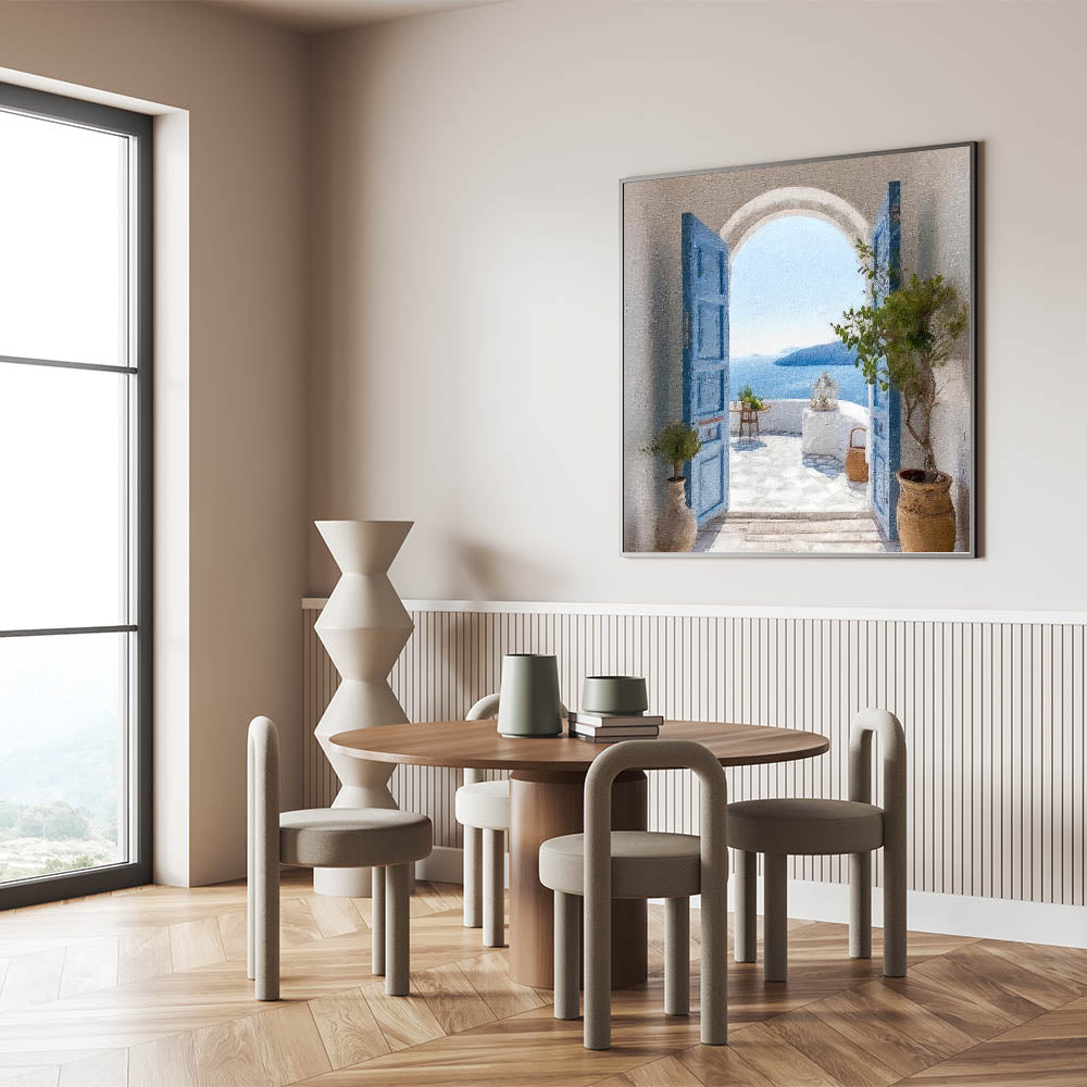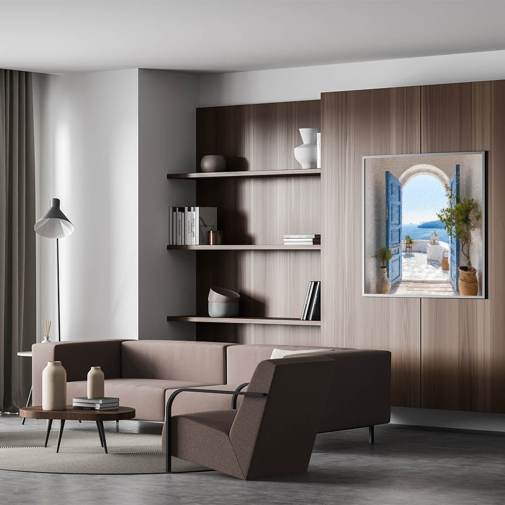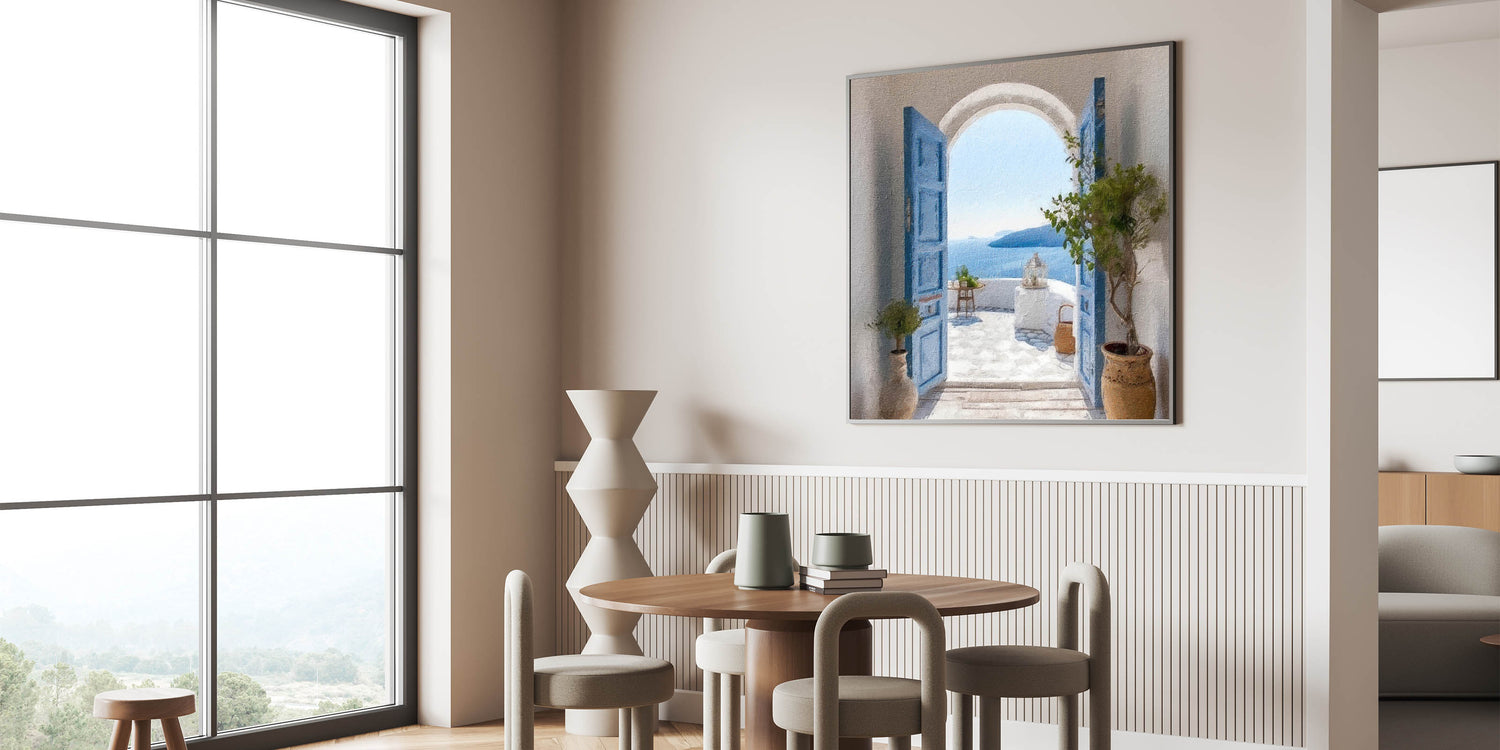 - High-quality Santorini open door prints, available in materials like Stretched Canvas, Framed Canvas, and Acrylic Glass.