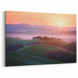 Bring the timeless beauty of the countryside to your walls with this Scenic Fields Framed Art. This artwork captures a tranquil view of rolling green hills bathed in the soft glow of a golden sunrise. The layered mist and distant cypress trees create a dreamy and peaceful atmosphere, perfect for elevating any room's decor.
