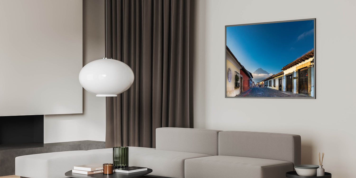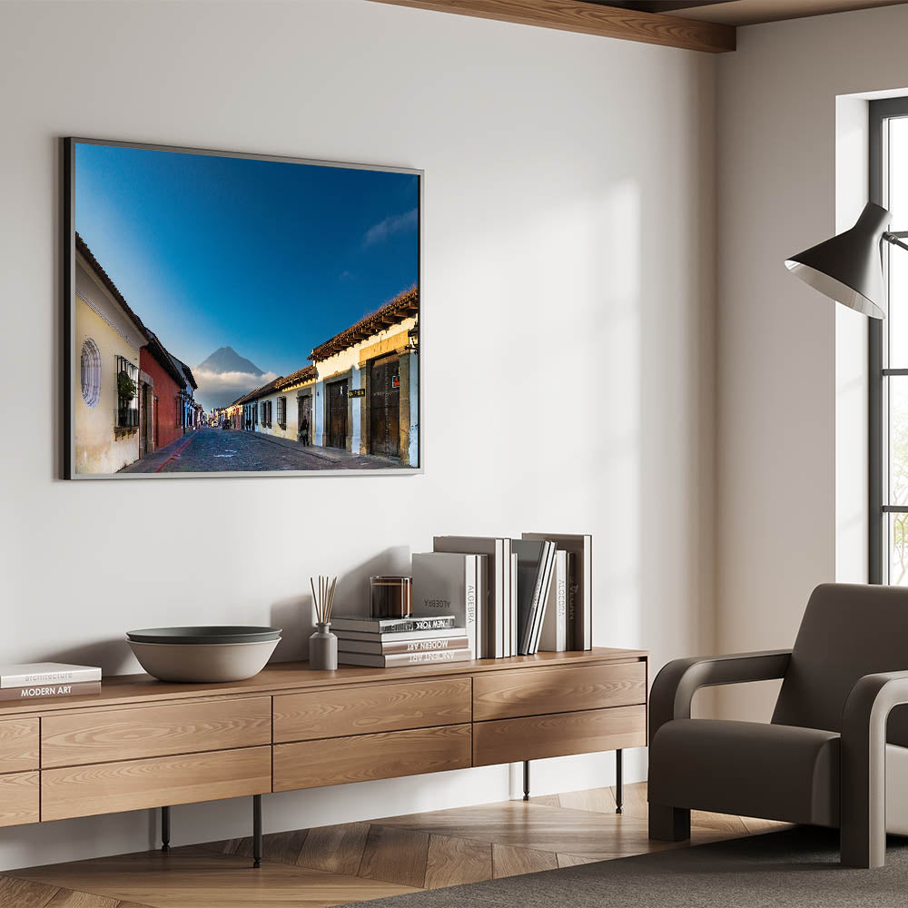 Our "Cobblestone Street View" from the Antigua Guatemala Art collection offers a captivating portrayal of Antigua's charming streets with the magnificent Volcano Agua as the backdrop. This piece reflects the timeless allure of one of Guatemala's most picturesque towns.
