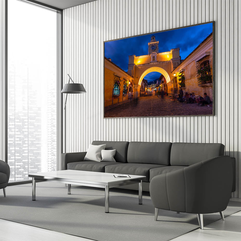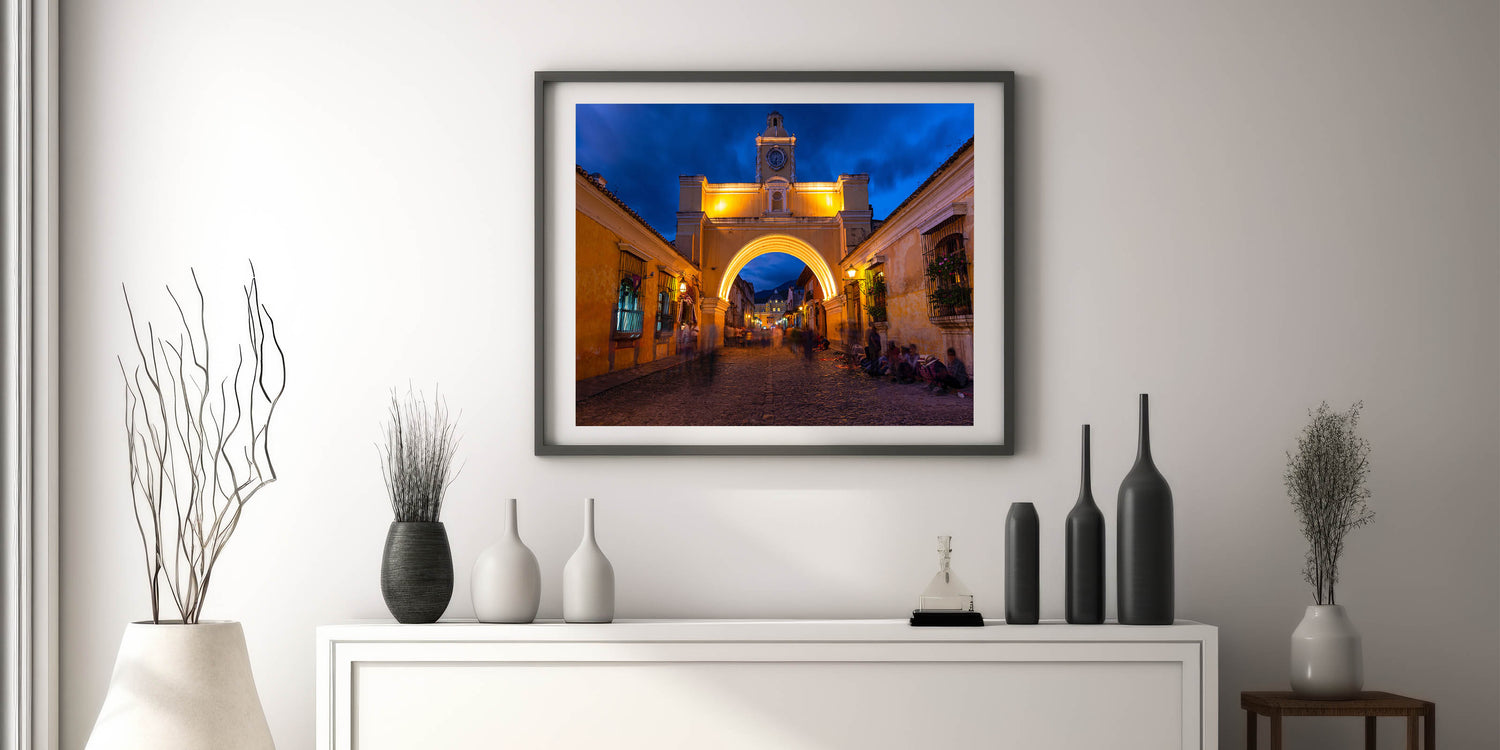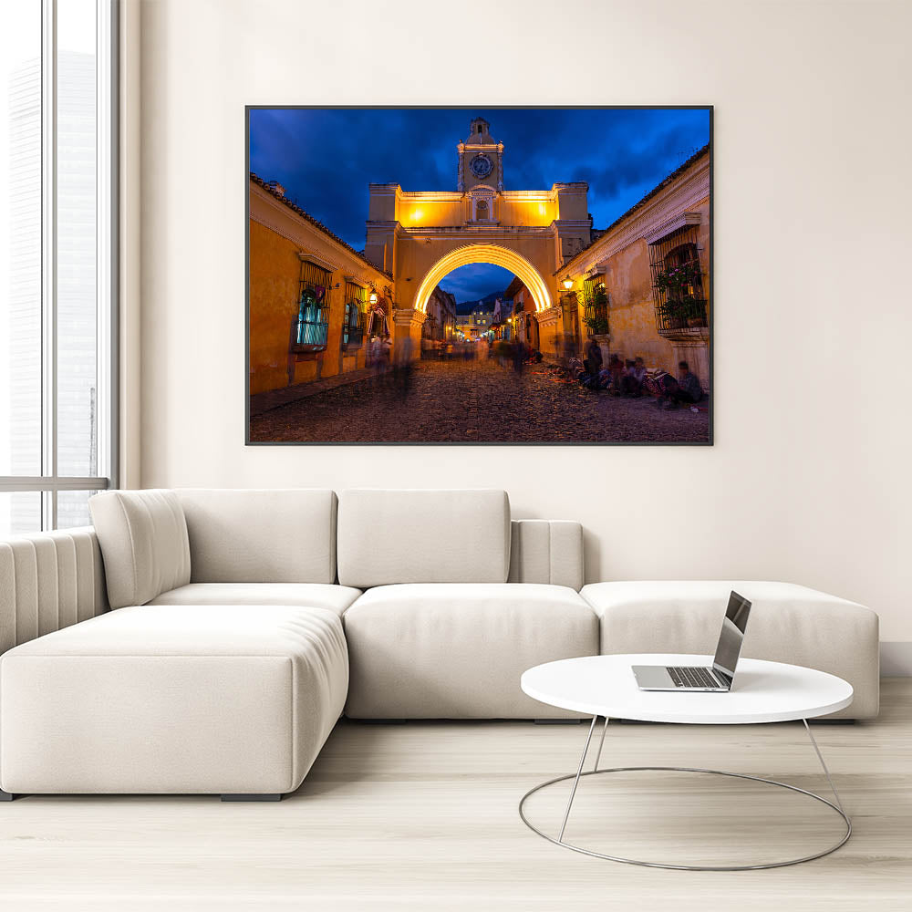 is a breathtaking addition to our Antigua Guatemala Art collection, showcasing the famous archway illuminated under the evening sky. This image captures the vibrant life of Antigua as people move through this historic passageway with the ancient clock tower looming in the background.