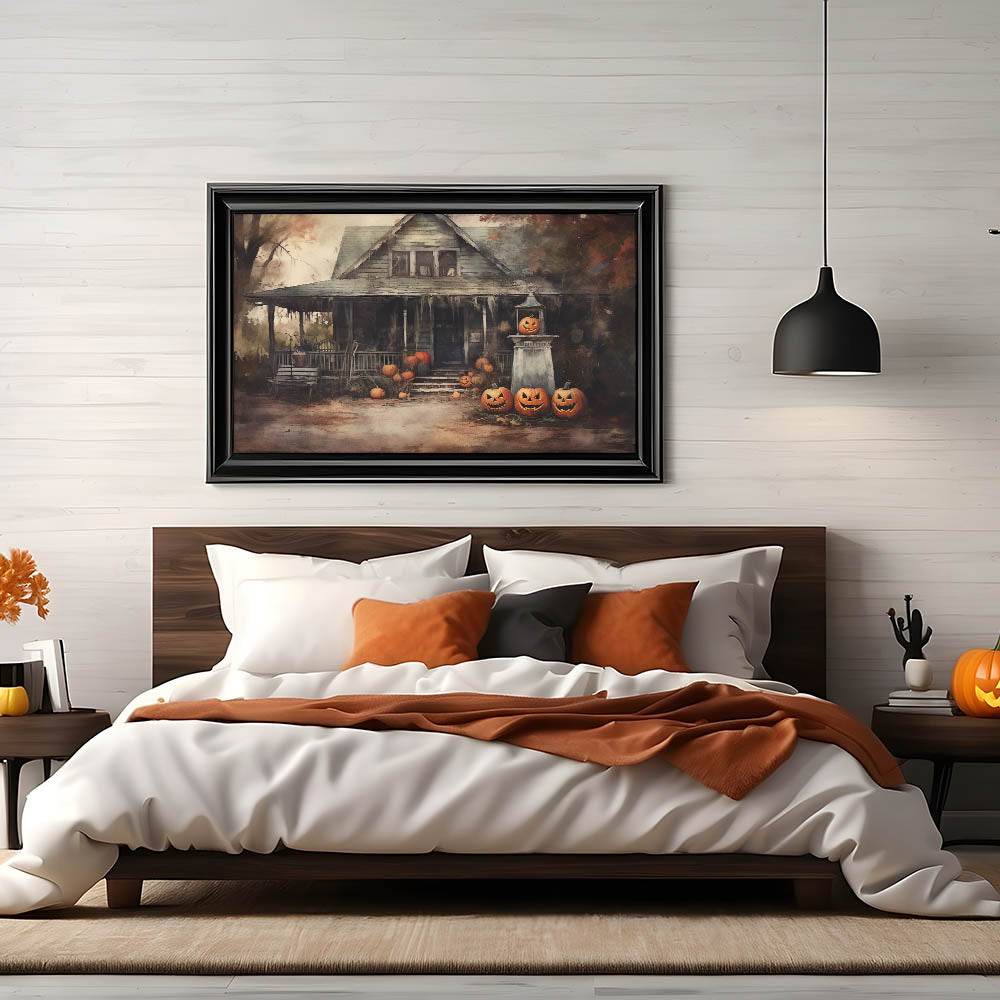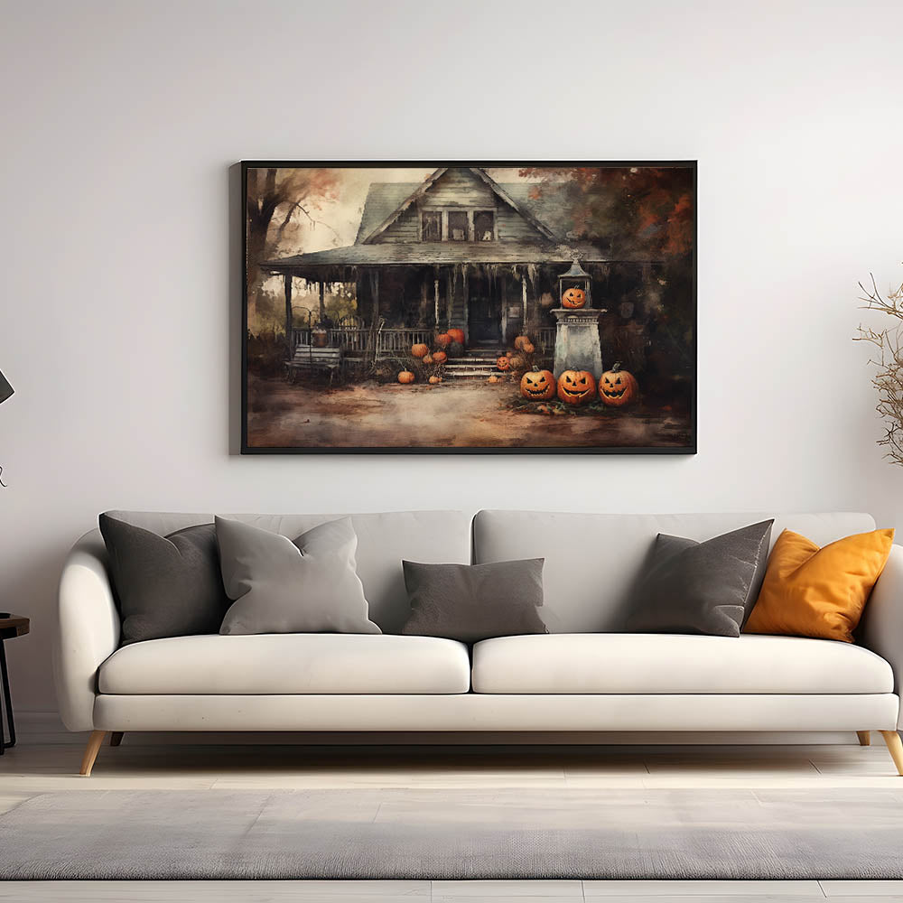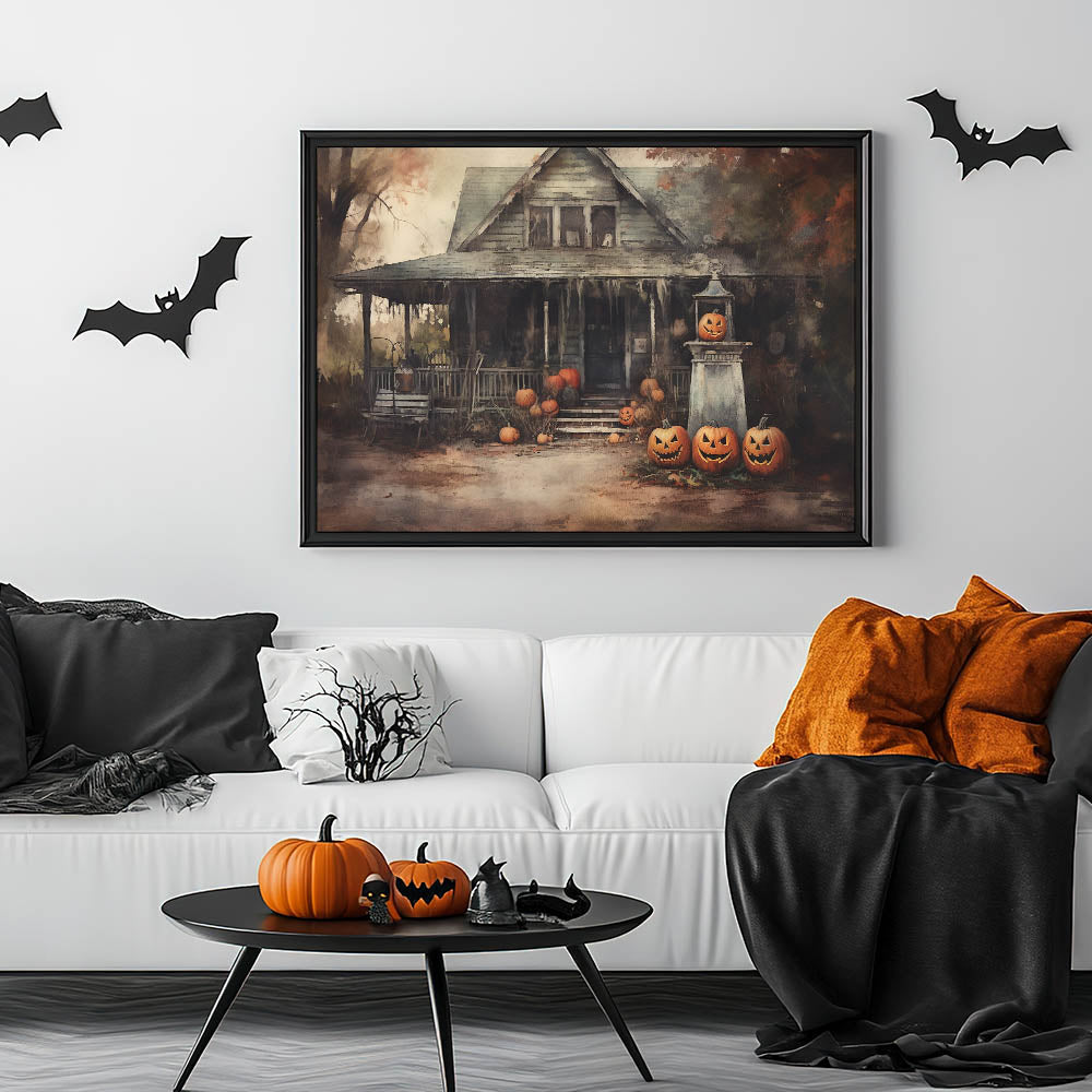 Step into the eerie atmosphere of Halloween with this hauntingly beautiful Halloween art print. Featuring an abandoned, moss-covered house surrounded by glowing jack-o’-lanterns, this artwork captures the perfect mix of mystery and seasonal charm. The muted greens, browns, and deep oranges create a ghostly yet inviting ambiance, making it a captivating piece for Halloween wall hangings.