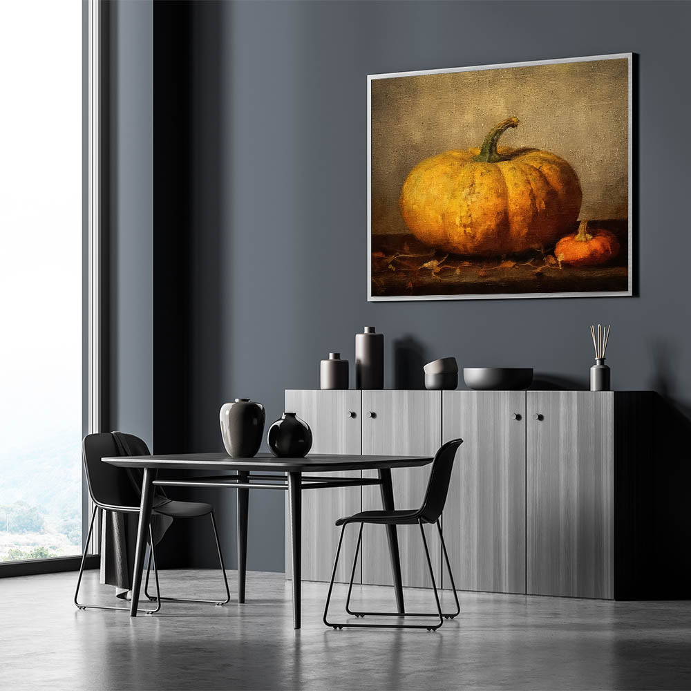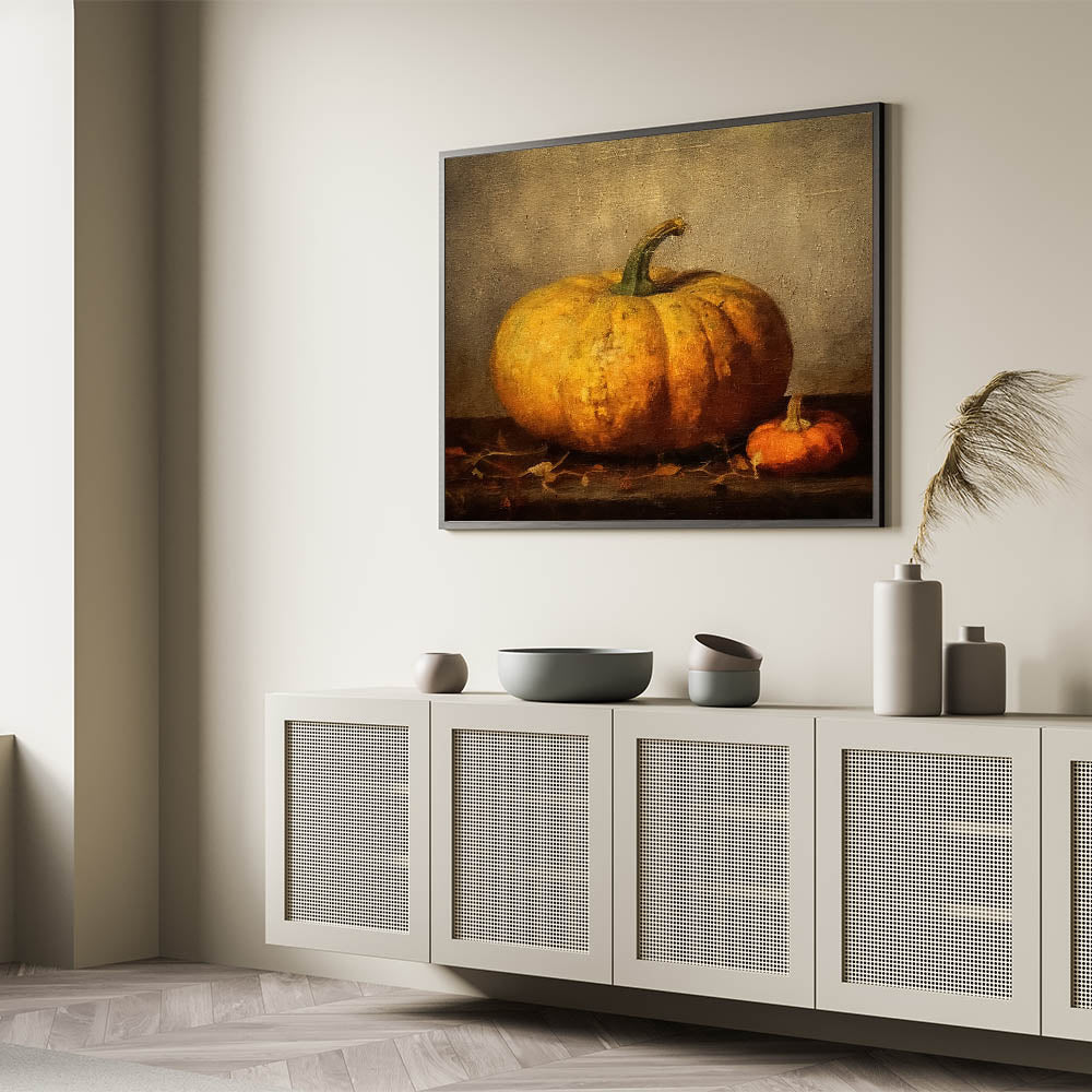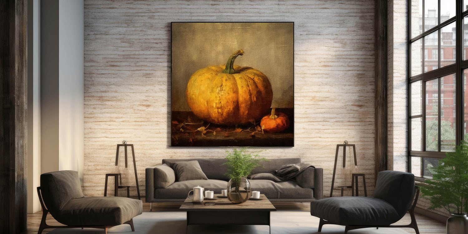 Celebrate the warmth of autumn with this rustic pumpkin painting, a perfect blend of vintage charm and seasonal elegance. The rich golden hues and textured brushstrokes create a cozy atmosphere, making this artwork an excellent addition to your Halloween wall decor or fall-themed home styling.