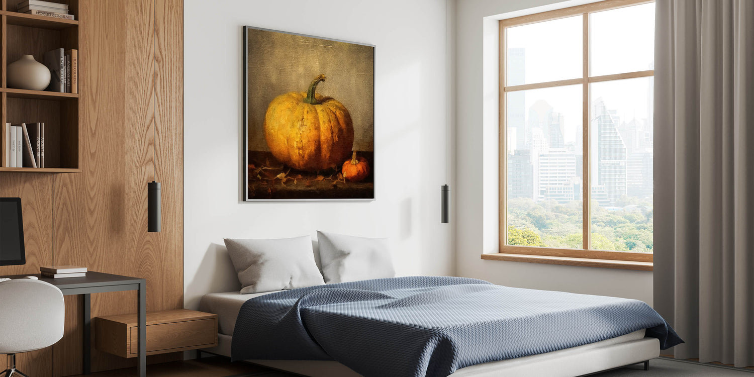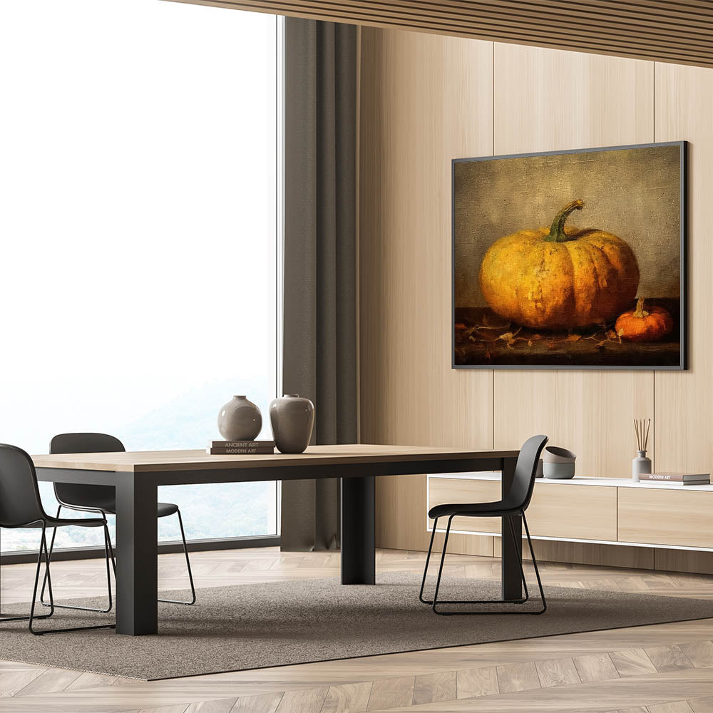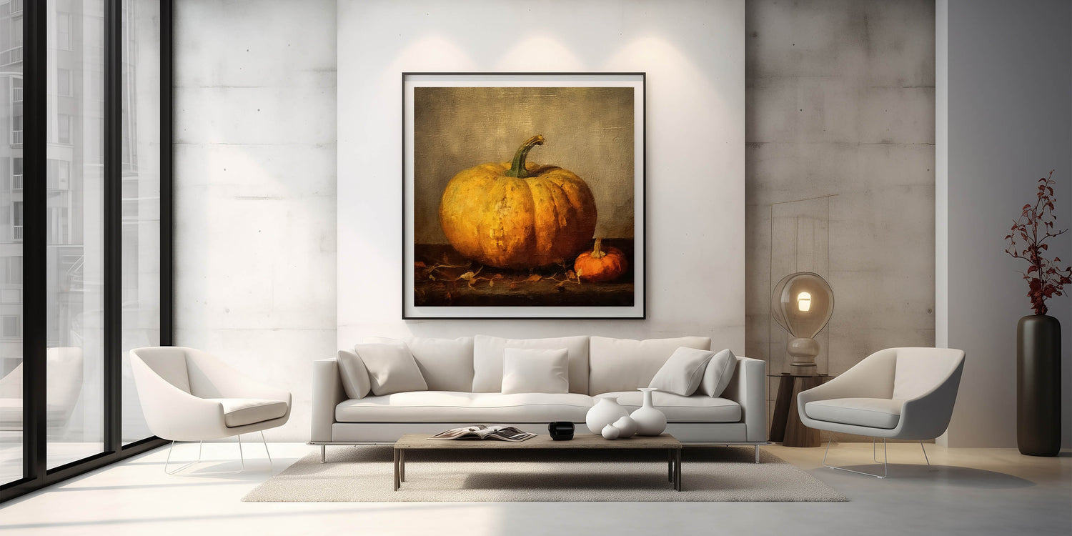 Celebrate the warmth of autumn with this rustic pumpkin painting, a perfect blend of vintage charm and seasonal elegance. The rich golden hues and textured brushstrokes create a cozy atmosphere, making this artwork an excellent addition to your Halloween wall decor or fall-themed home styling.