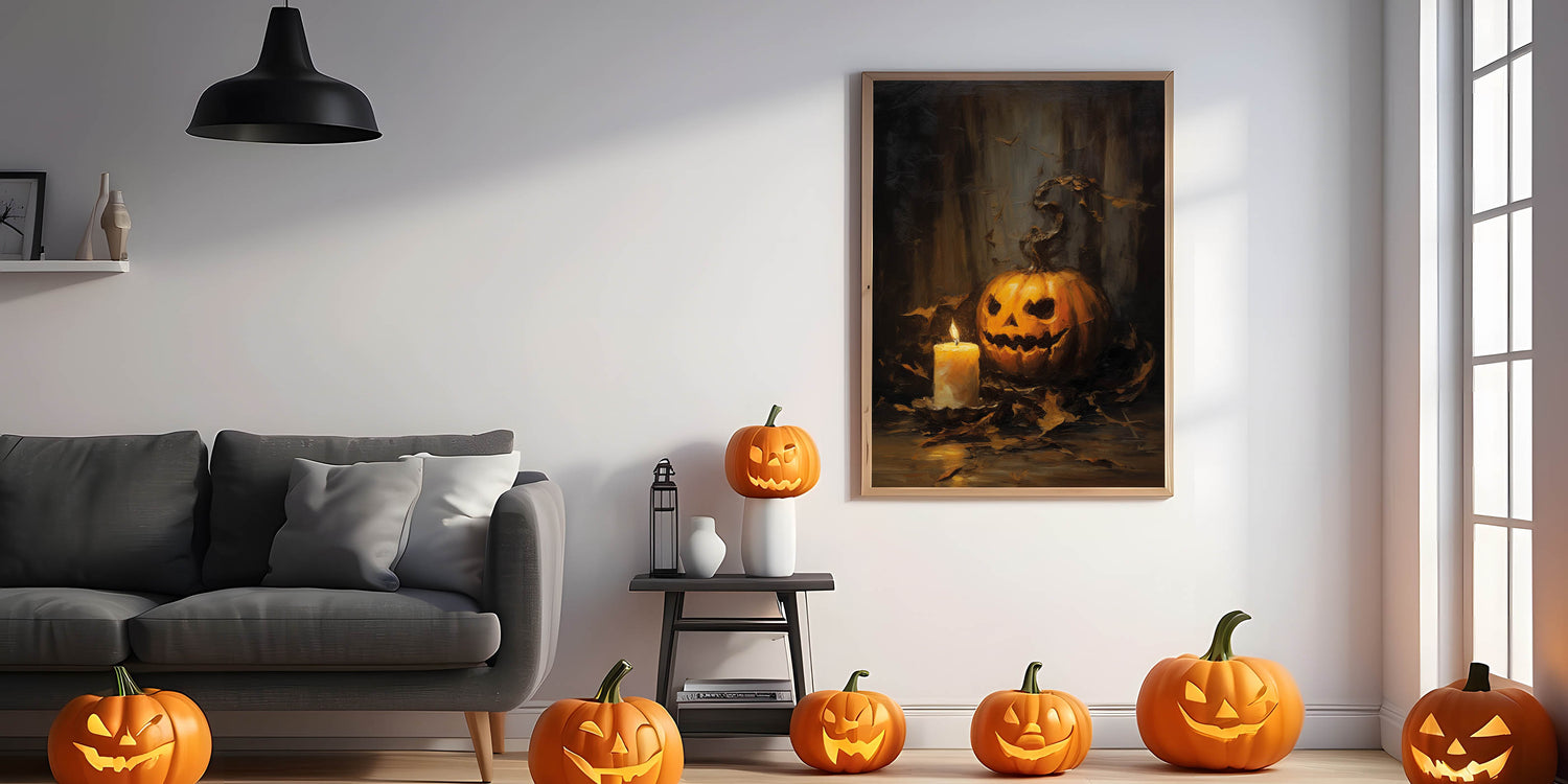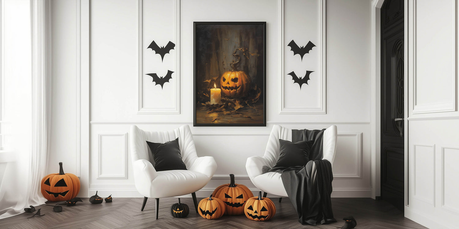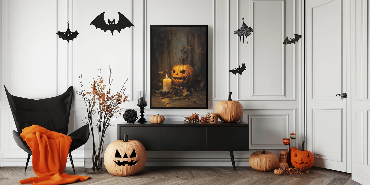- Dark, moody tones and glowing highlights enhance Halloween wall decorations