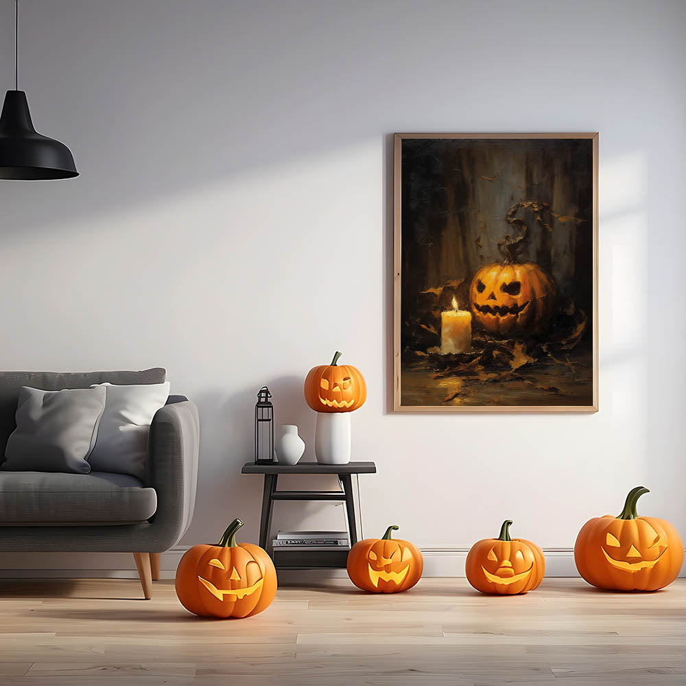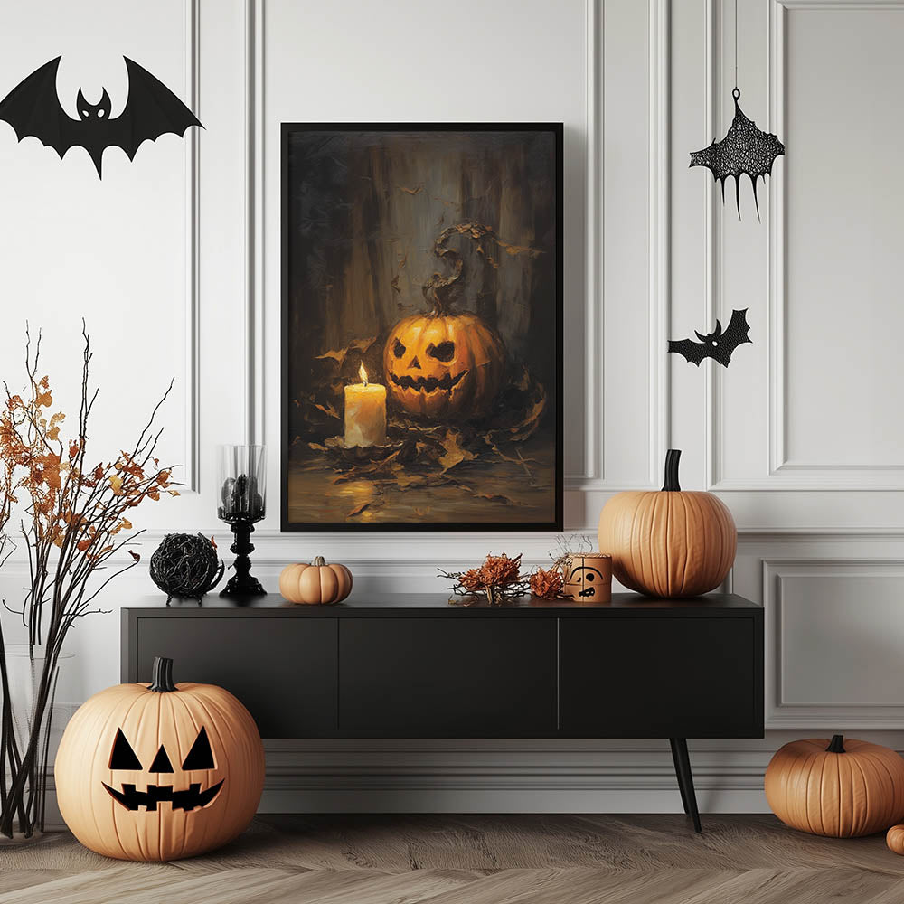 Bring a hauntingly beautiful glow to your space with this Jack-O'-Lantern Candlelight Halloween Wall Art. This mesmerizing oil painting features a sinisterly grinning pumpkin illuminated by the soft glow of a candle, surrounded by fallen autumn leaves in a dark, moody setting. The rich brushstrokes and warm, eerie lighting make this piece perfect for gothic and Halloween-inspired decor.
