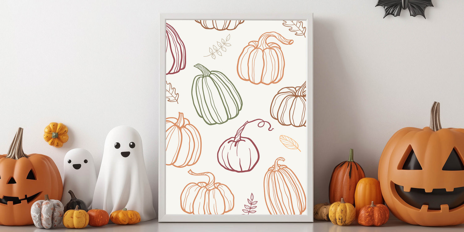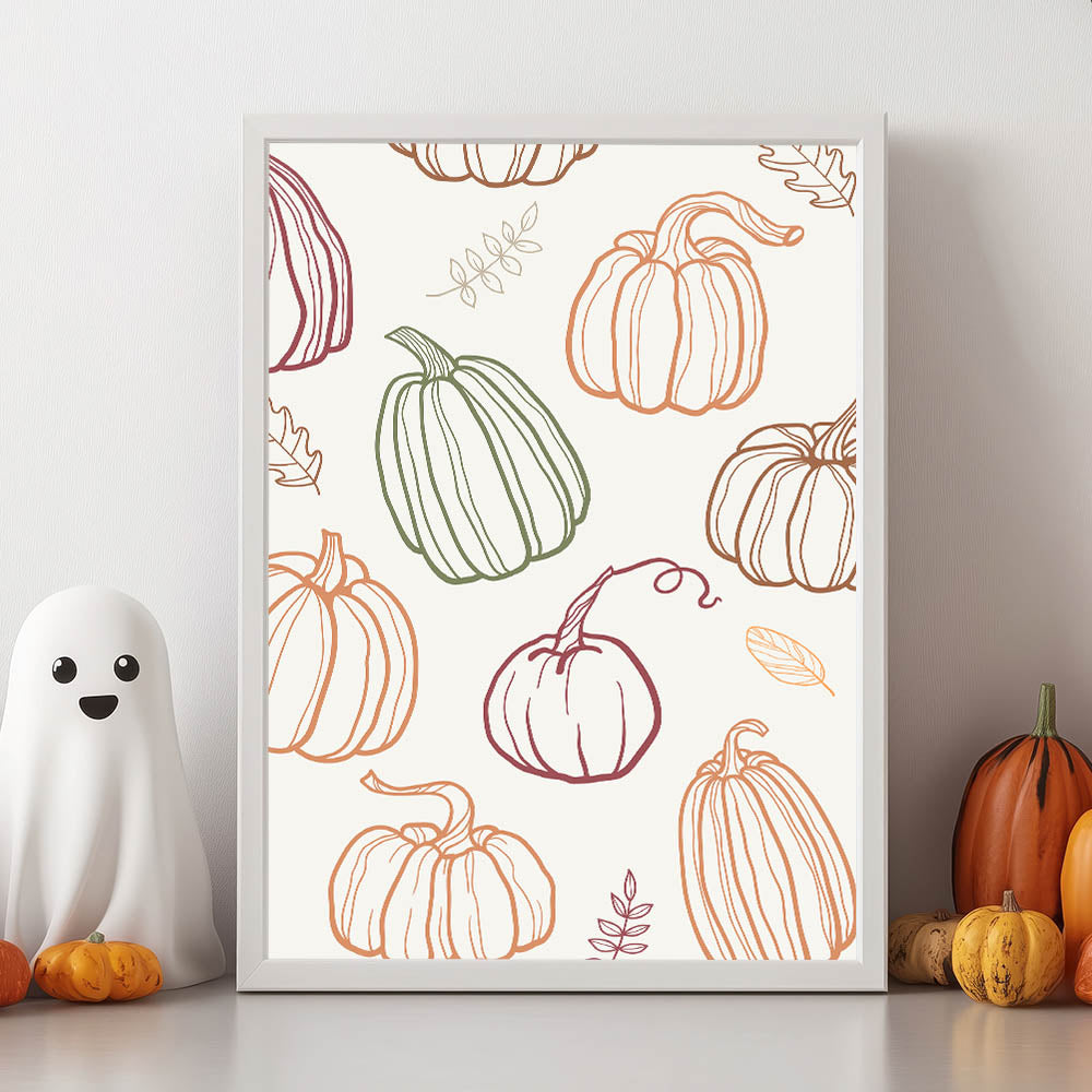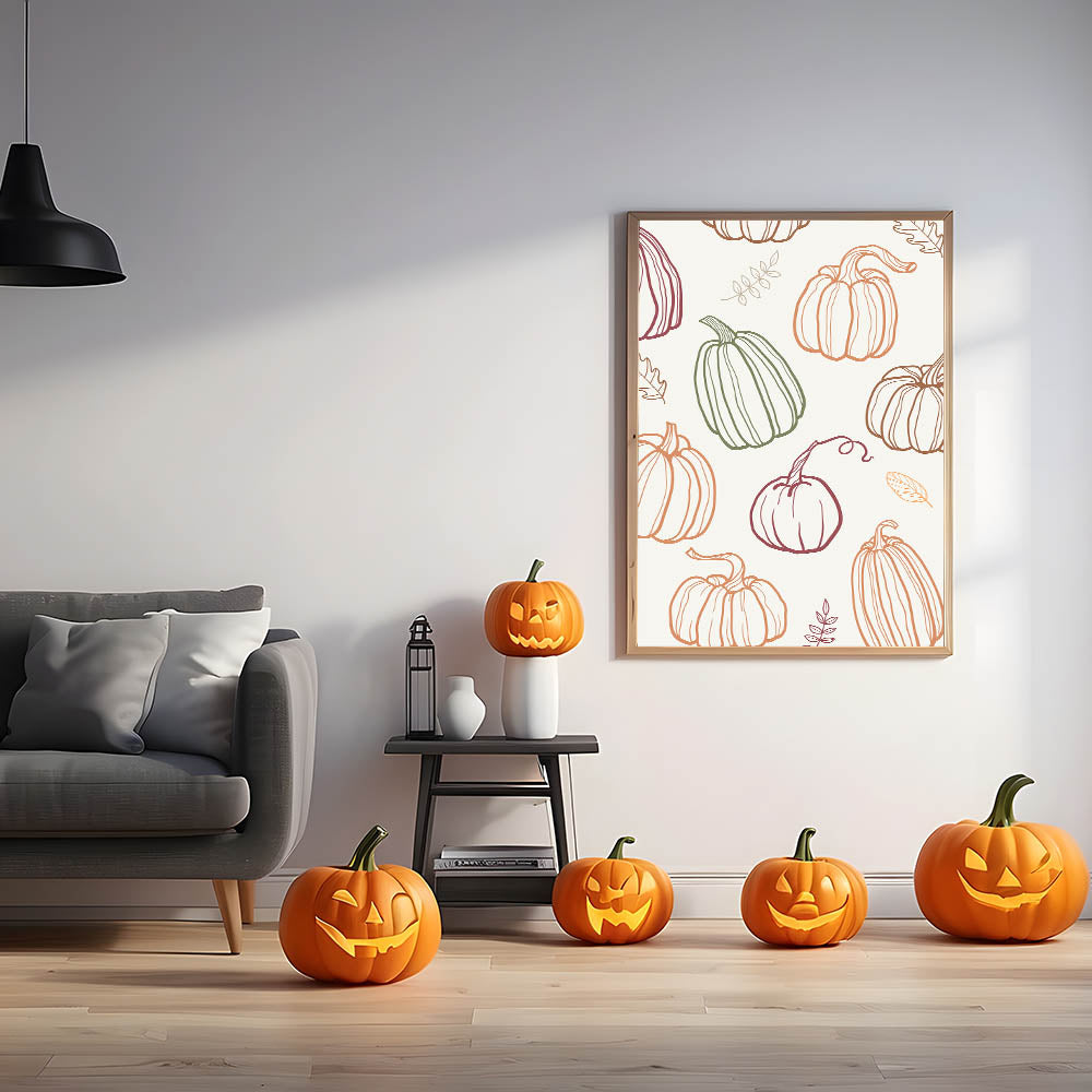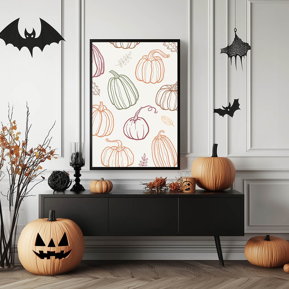 Celebrate the spirit of autumn and Halloween with this Pumpkin Pattern Halloween Wall Art. Featuring hand-drawn pumpkins in warm seasonal hues of orange, green, and burgundy, this minimalist yet festive design adds a rustic charm to your space. Perfect for those who love understated yet stylish Halloween decorations.