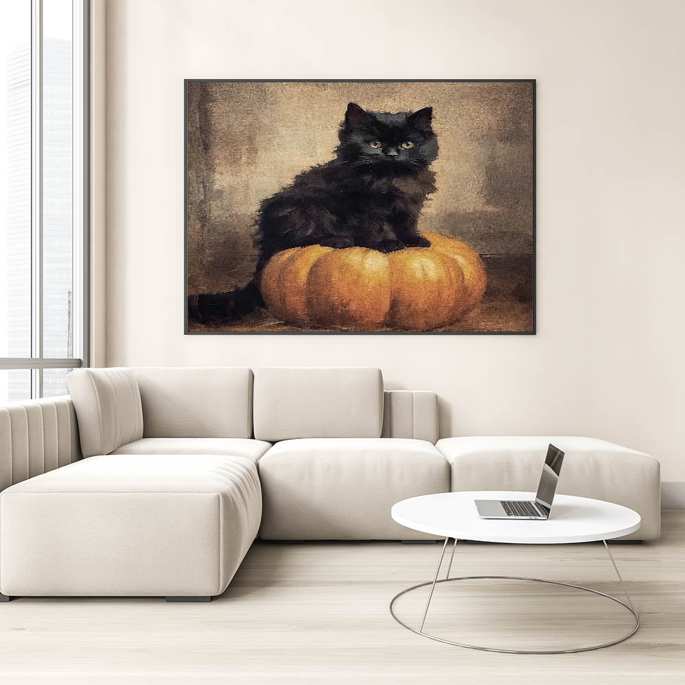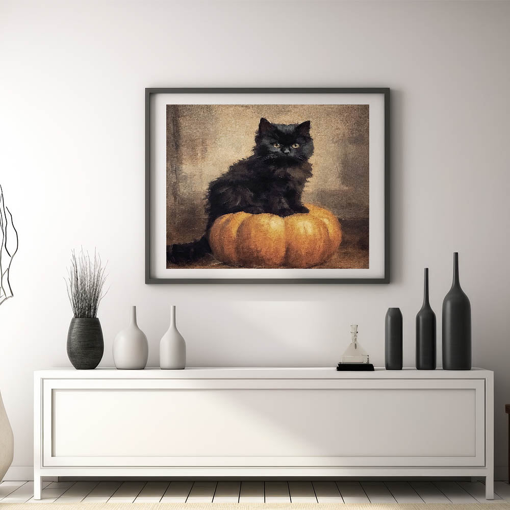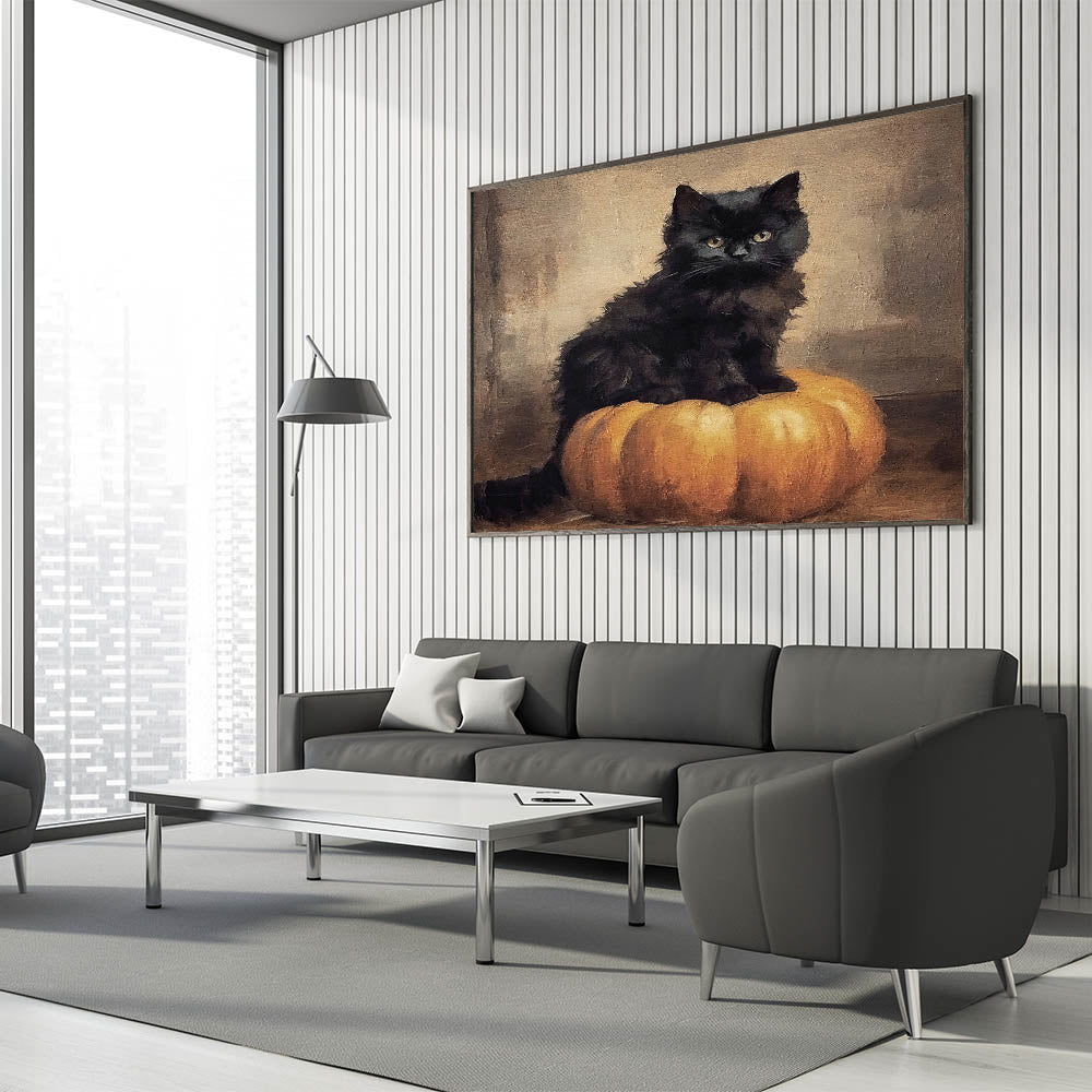 This black cat and pumpkin artwork is a must-have for Halloween lovers, combining an elegant, old-world aesthetic with a festive yet refined seasonal theme.