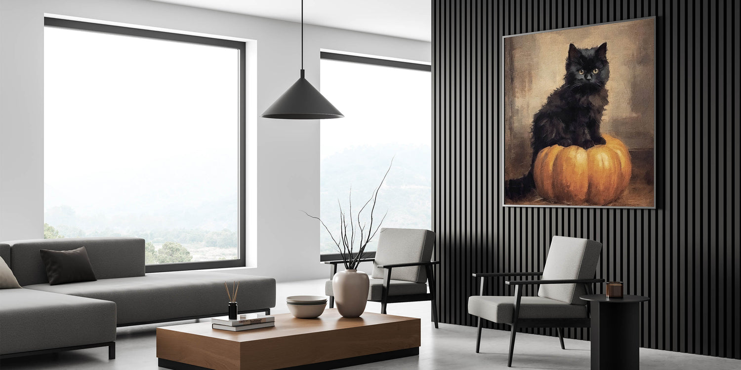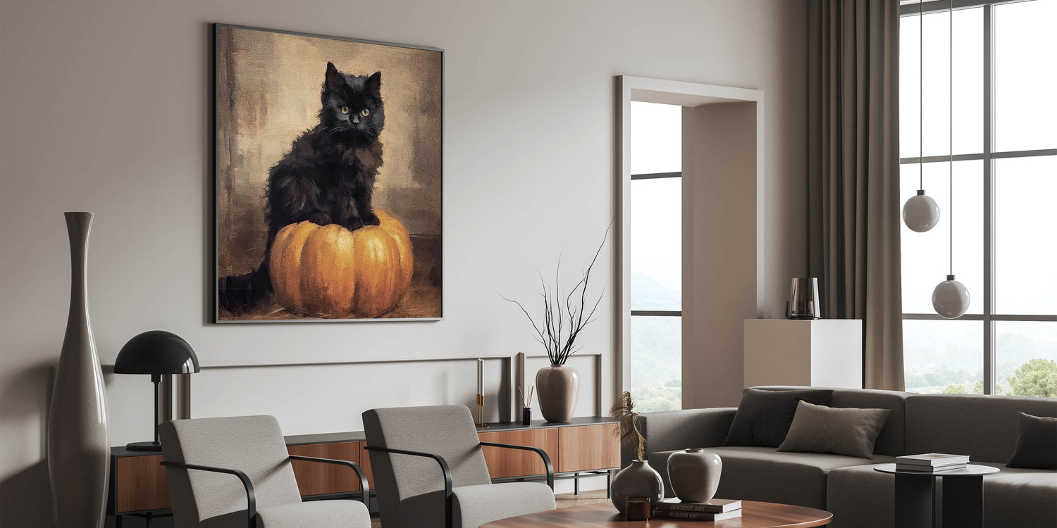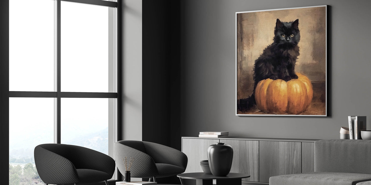 This black cat and pumpkin artwork is a must-have for Halloween lovers, combining an elegant, old-world aesthetic with a festive yet refined seasonal theme.