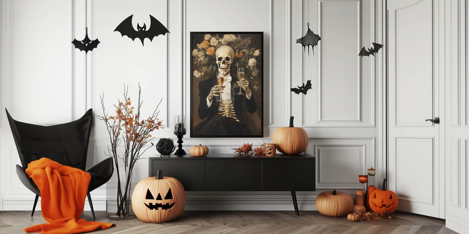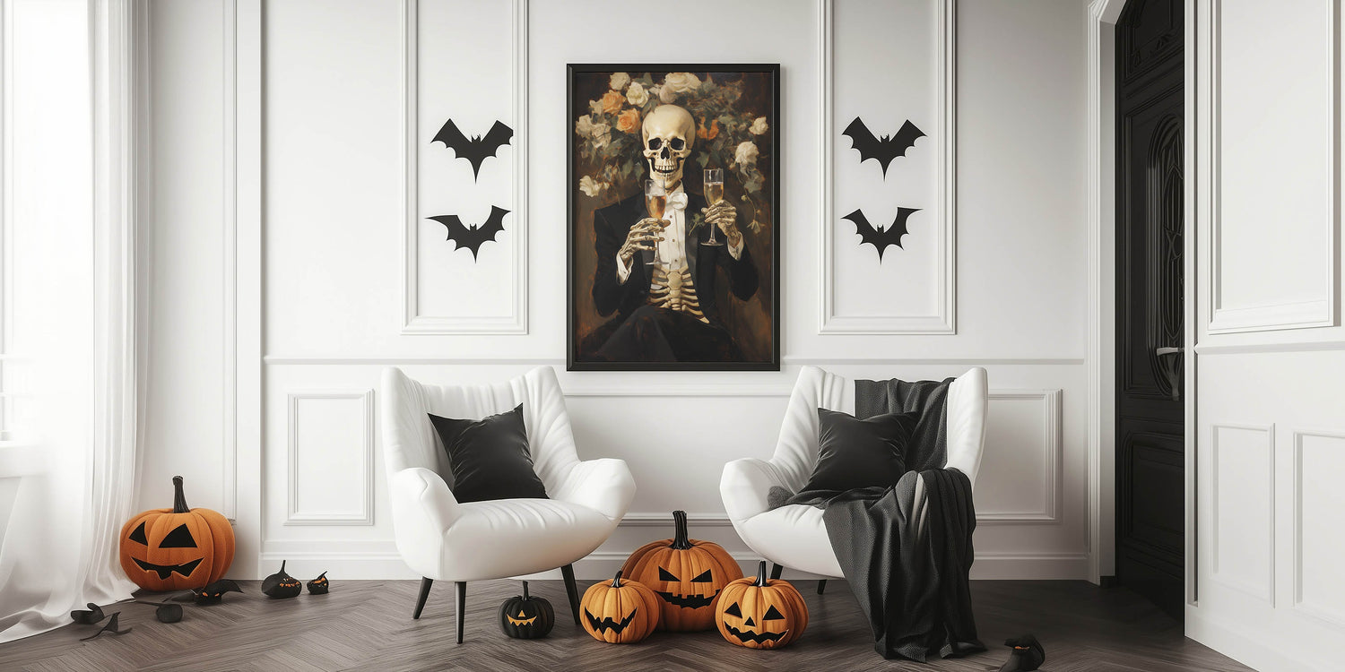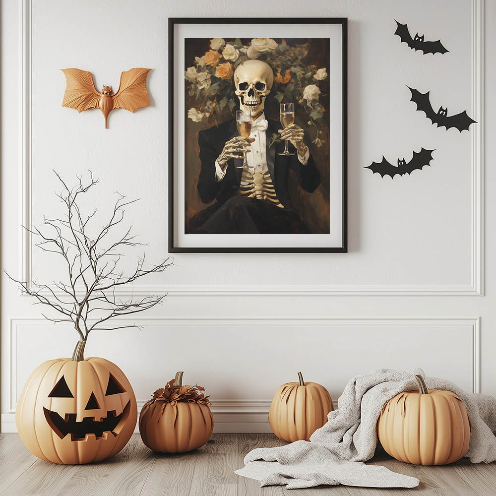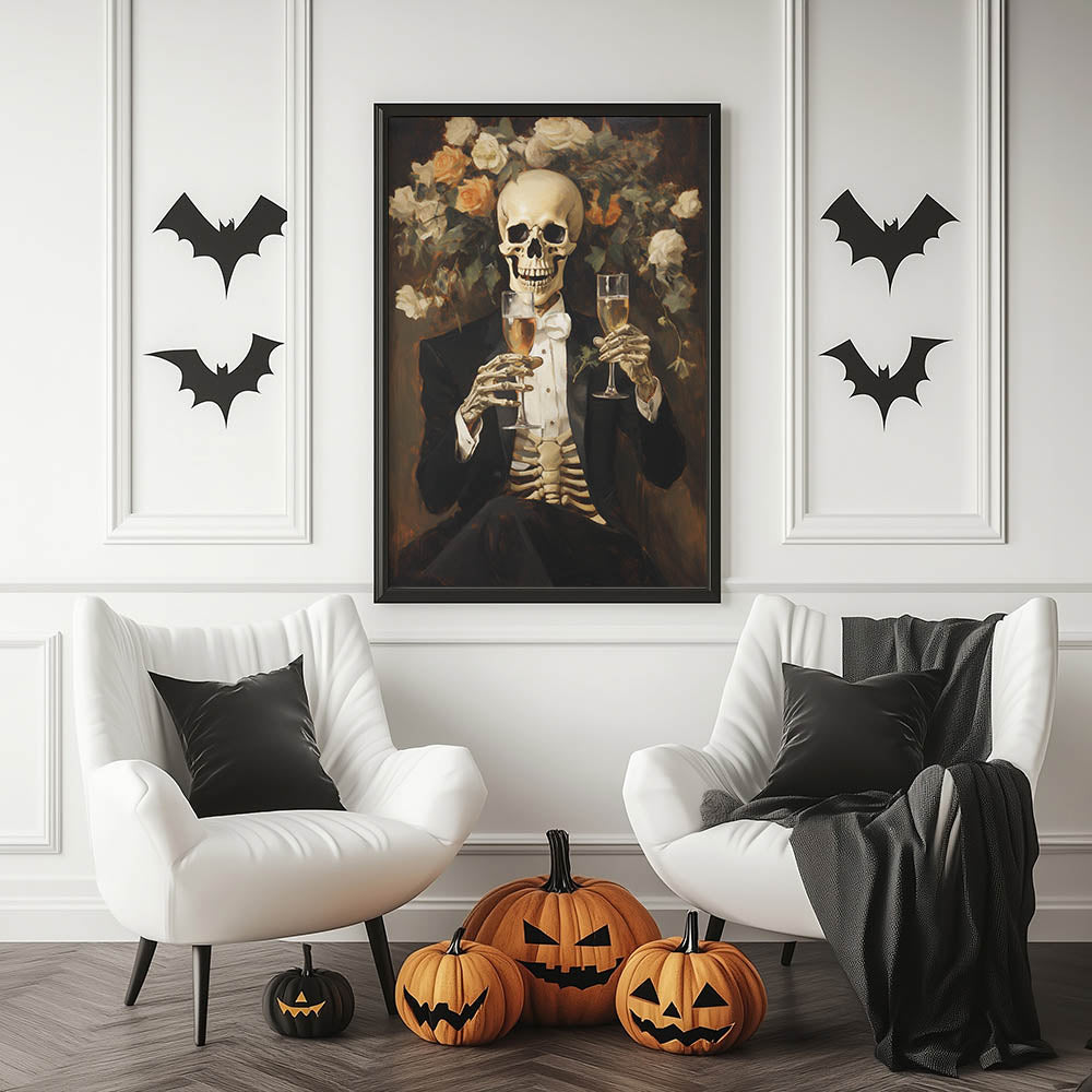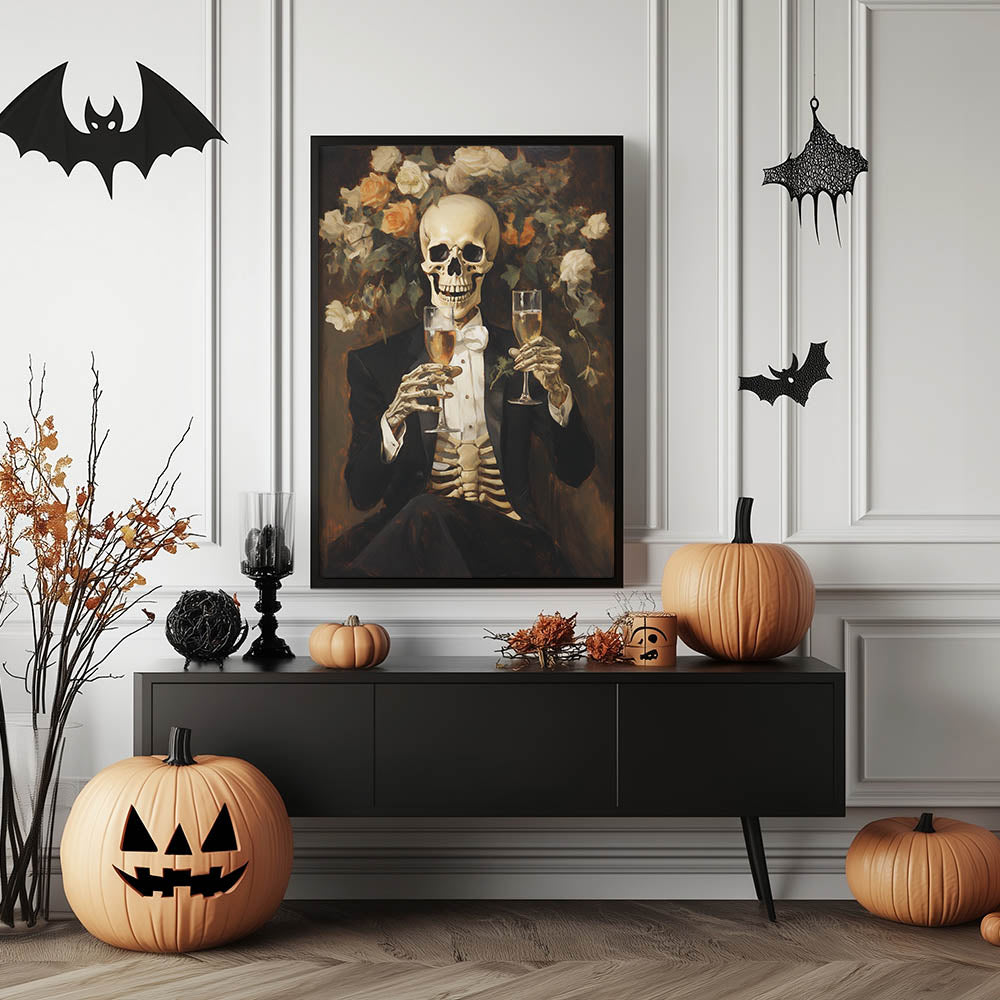 Make a bold statement with this Spooky Wall Art featuring a dapper skeleton raising a toast with two champagne glasses. This gothic-inspired painting blends eerie charm with sophistication, making it a perfect addition to your Halloween canvas art collection. The vintage-style roses and warm, golden hues enhance the hauntingly elegant atmosphere, ideal for those who love dark romance and macabre aesthetics.