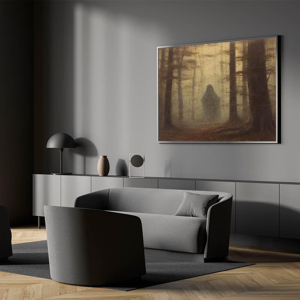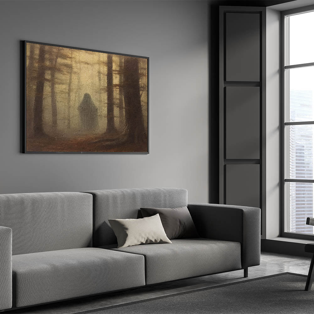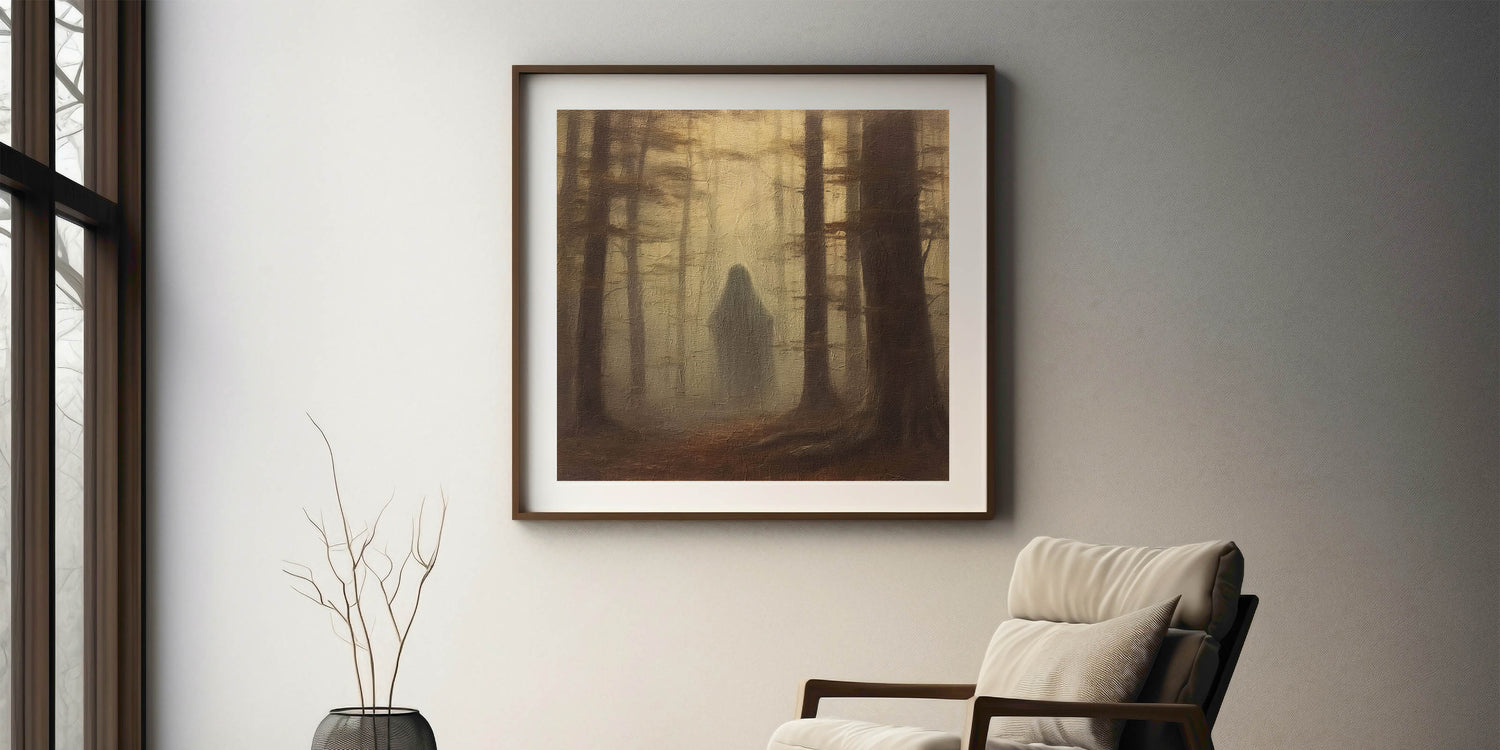 Immerse yourself in the eerie beauty of this haunting forest painting, where a shadowy ghostly figure emerges from the mist. This chilling yet artistic piece captures the mystery of the supernatural, making it an unforgettable addition to your spooky wall art collection. Perfect for those who appreciate subtle but powerful Halloween wall decorations.