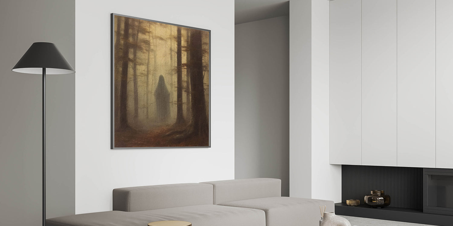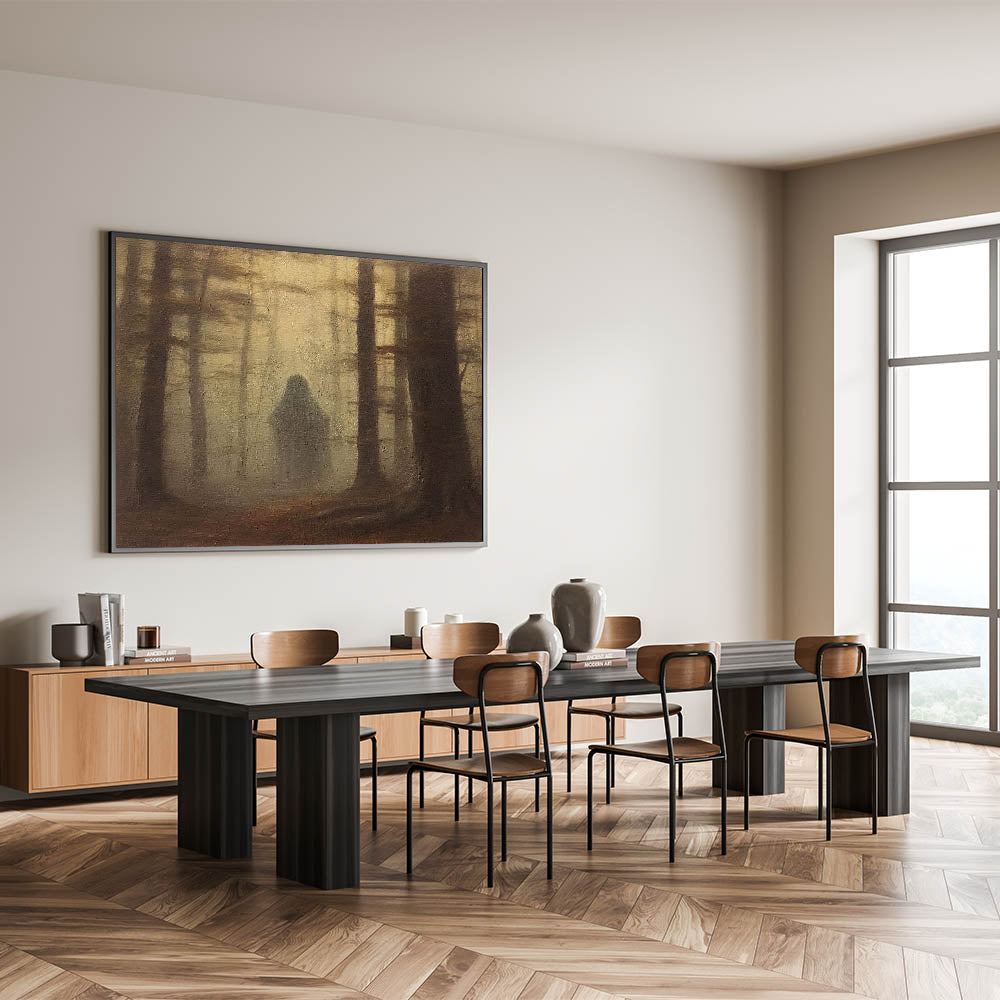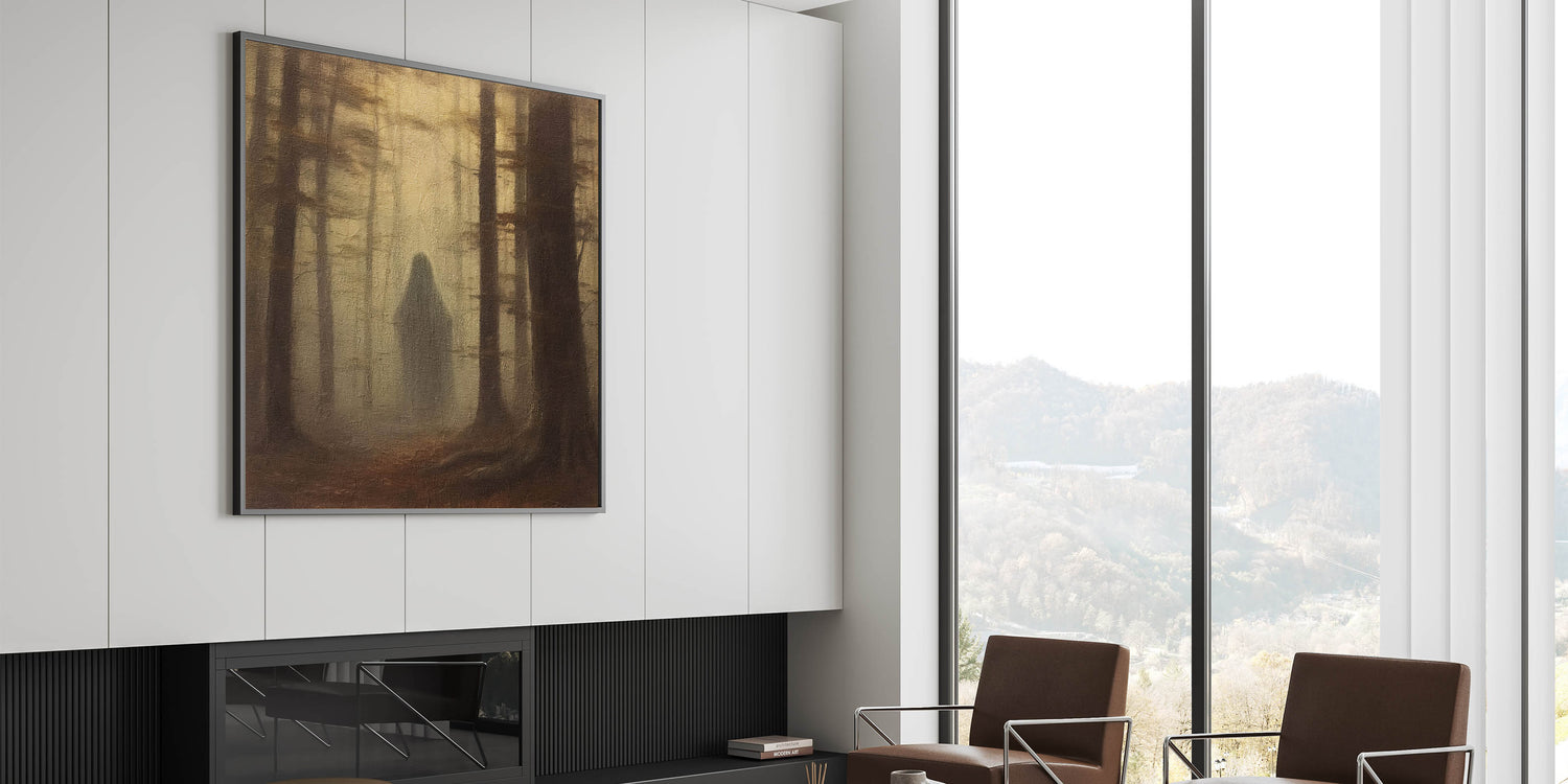 Immerse yourself in the eerie beauty of this haunting forest painting, where a shadowy ghostly figure emerges from the mist. This chilling yet artistic piece captures the mystery of the supernatural, making it an unforgettable addition to your spooky wall art collection. Perfect for those who appreciate subtle but powerful Halloween wall decorations.