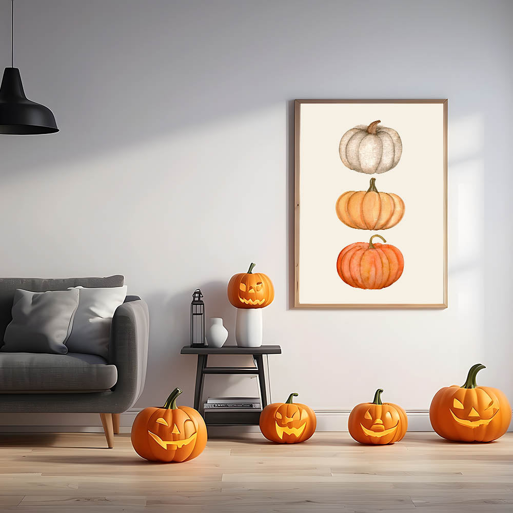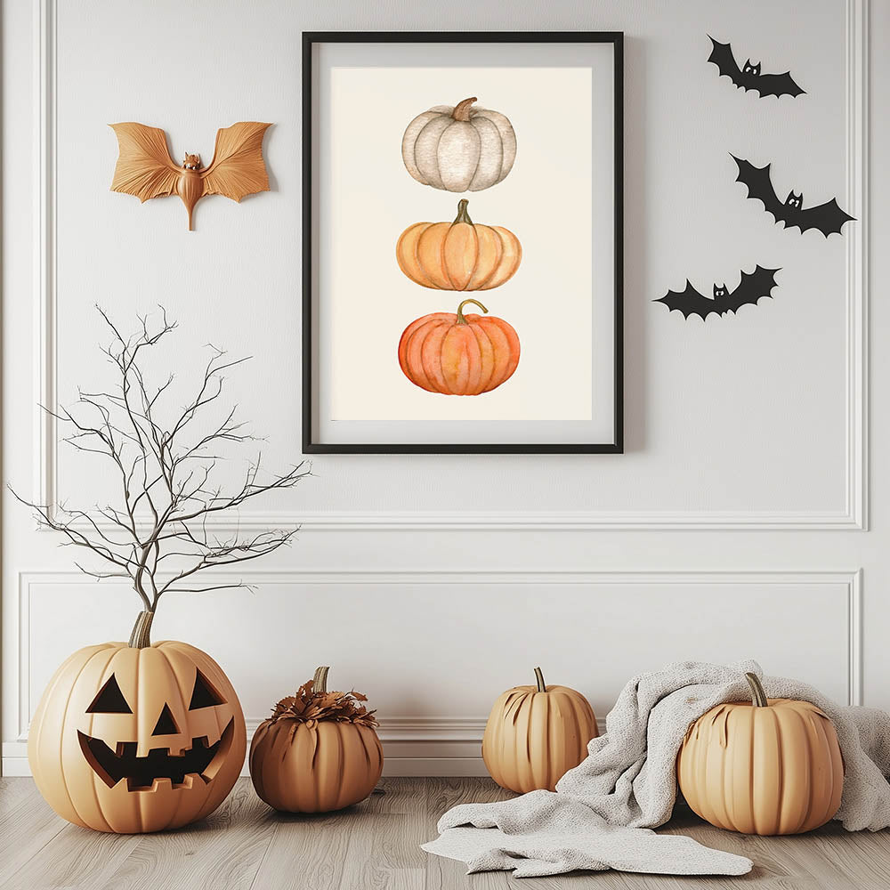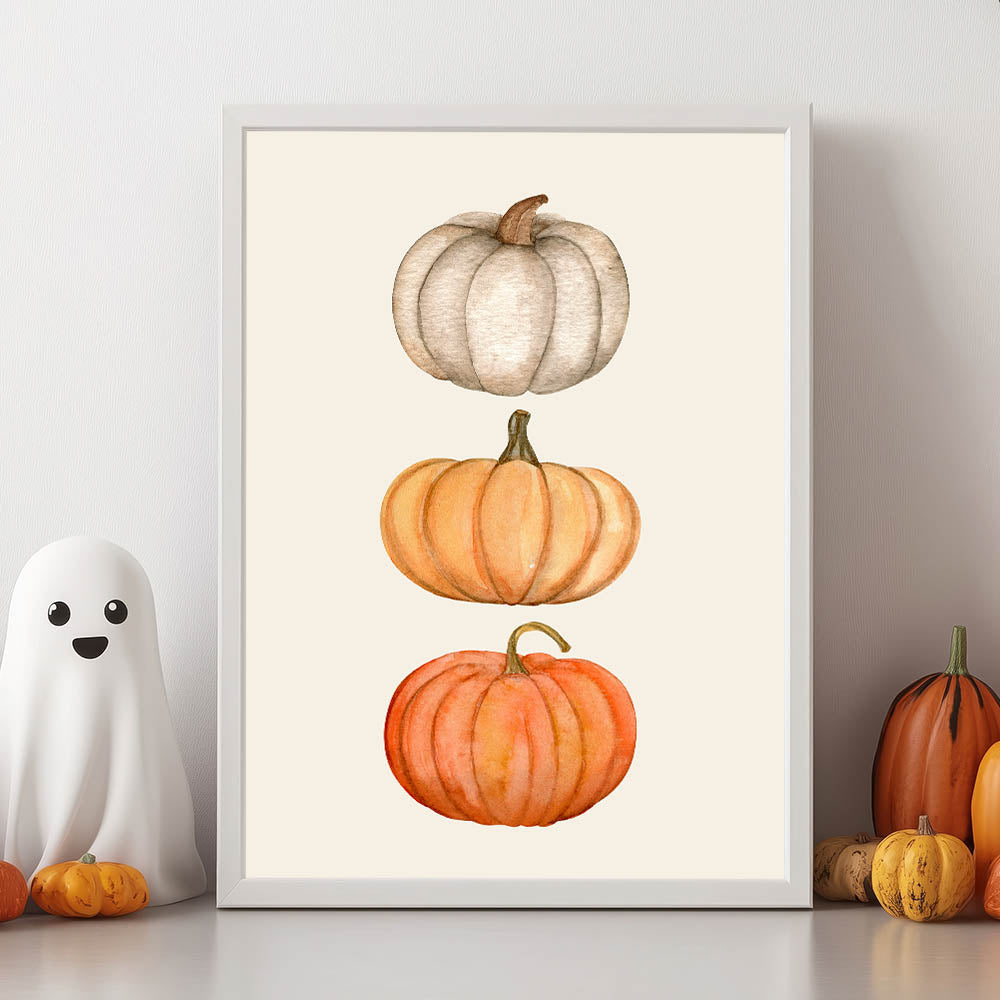 Add a touch of festive charm to your home with this Stacked Pumpkins Halloween Wall Art. Featuring three beautifully illustrated pumpkins in shades of white, beige, and orange, this artwork brings a cozy and seasonal feel to your space. Perfect for Halloween wall decor, this design blends rustic elegance with autumnal warmth.