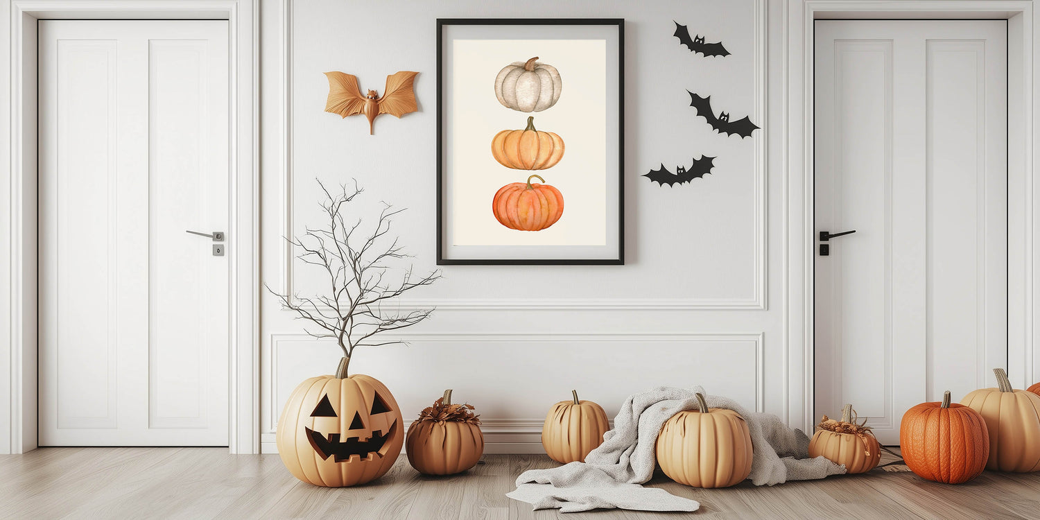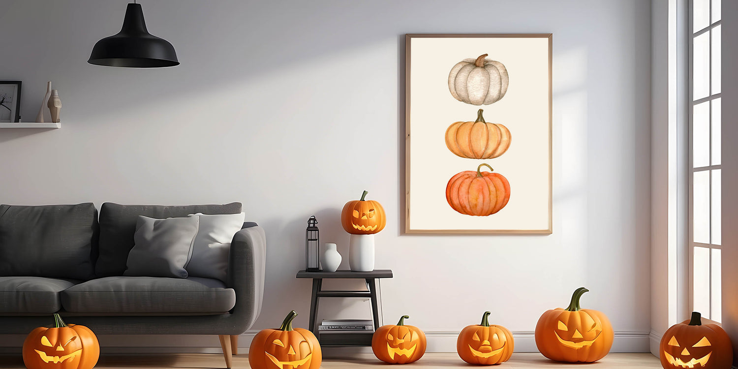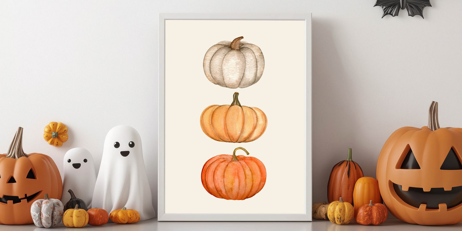 Add a touch of festive charm to your home with this Stacked Pumpkins Halloween Wall Art. Featuring three beautifully illustrated pumpkins in shades of white, beige, and orange, this artwork brings a cozy and seasonal feel to your space. Perfect for Halloween wall decor, this design blends rustic elegance with autumnal warmth.