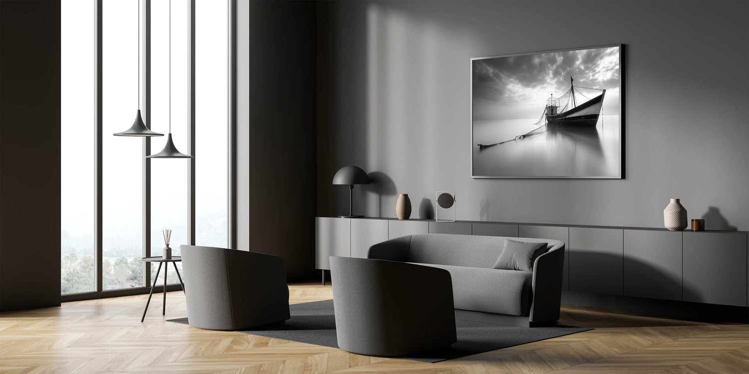 This black-and-white harbor artwork brings a touch of elegance and calm to your decor, making it a versatile addition to various interior styles. Choose your preferred format and let this piece transform your space with its quiet beauty.