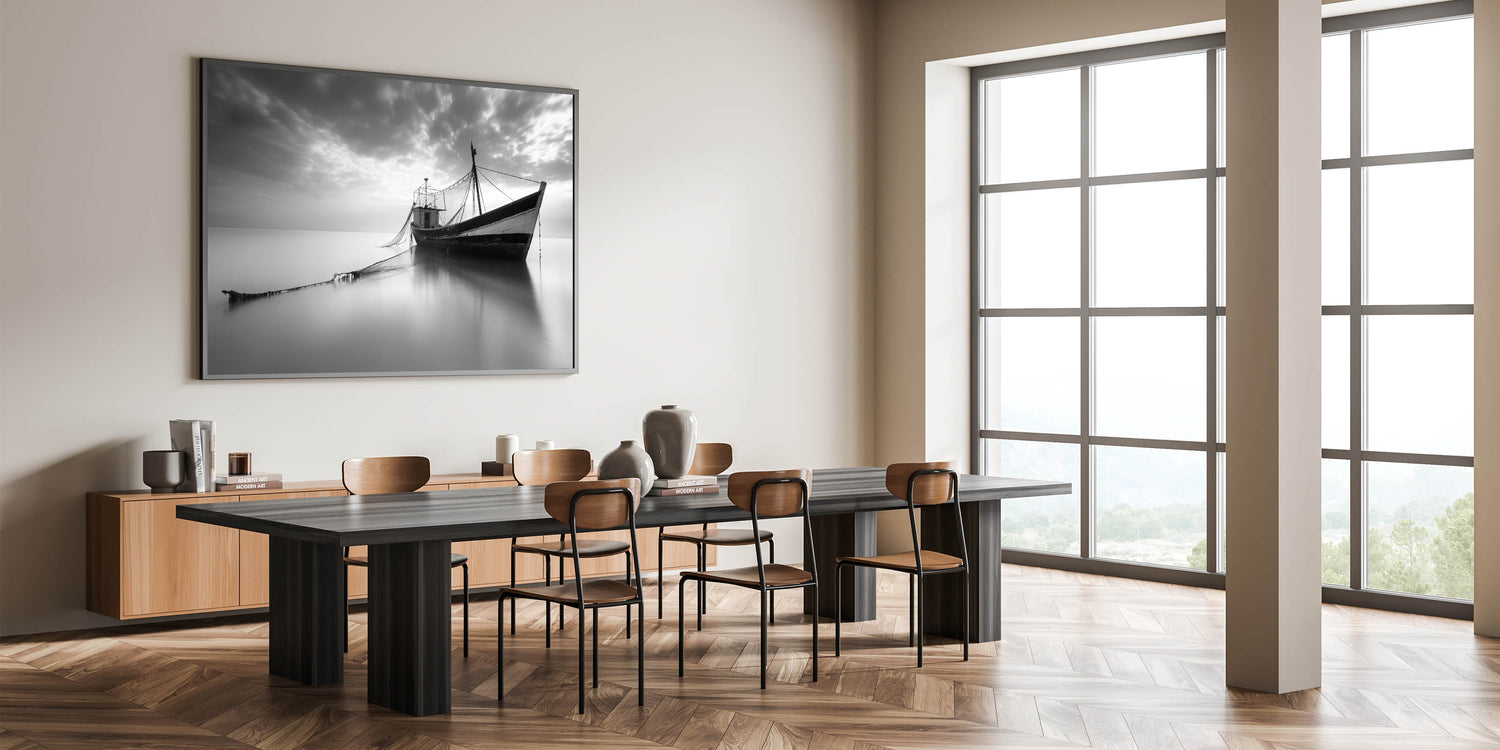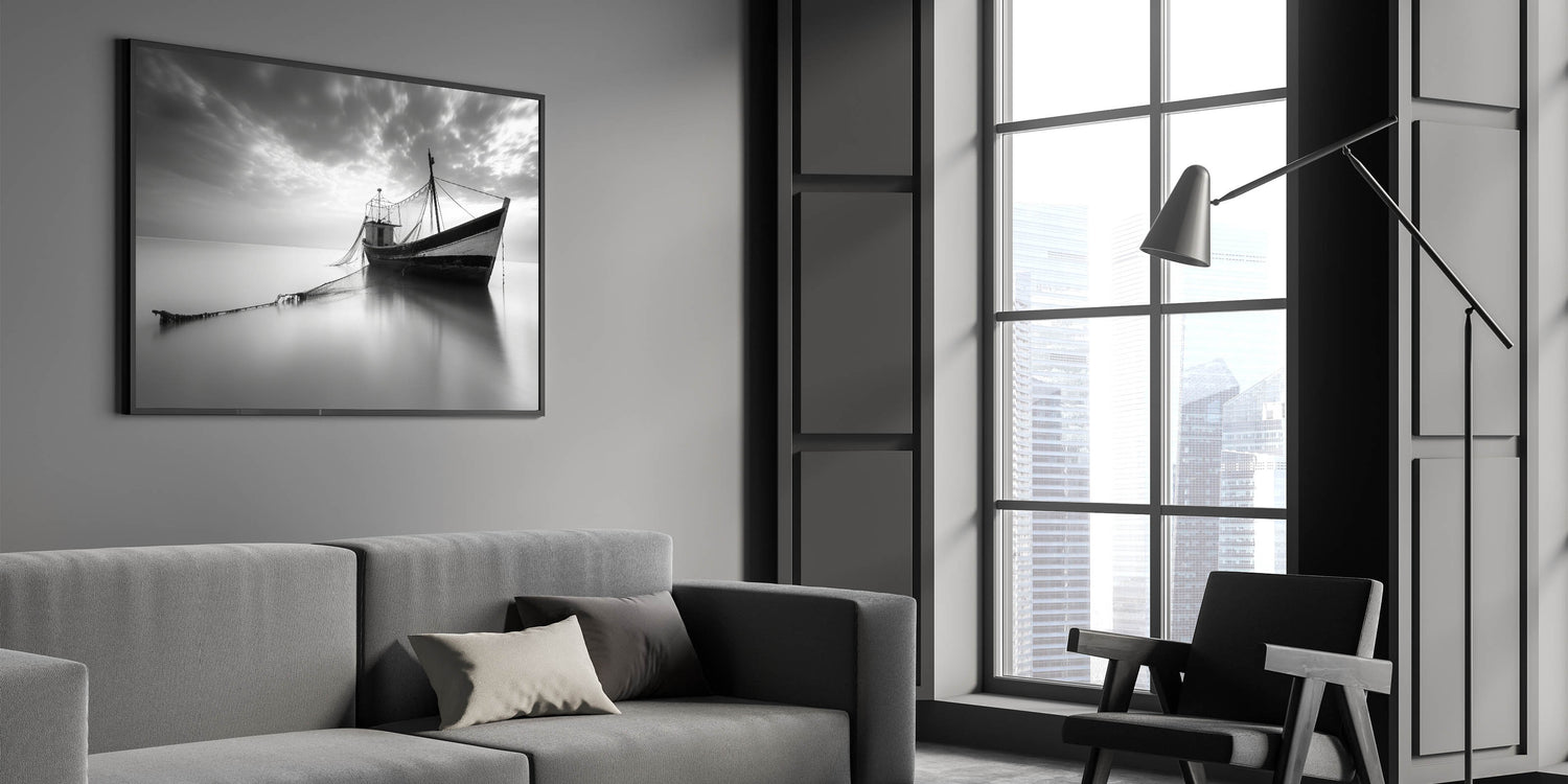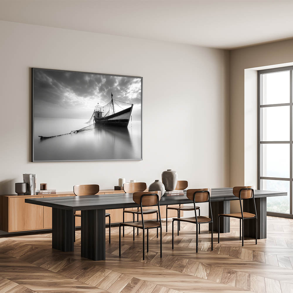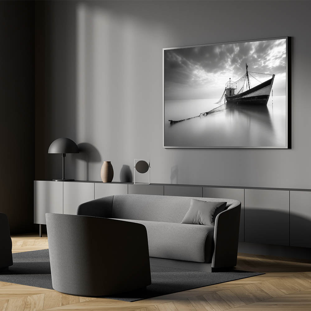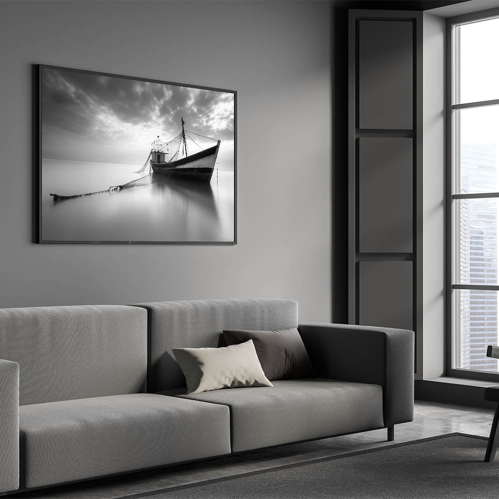 Capture the tranquility of a lone fishing boat resting in calm waters with this stunning black-and-white harbor photography piece. The artwork exudes a sense of peace and solitude, with the boat’s silhouette softly blending into the serene water, creating an ethereal atmosphere. The gentle play of light and shadows across the sky adds depth and emotion, making this a perfect focal point for any room with a modern or minimalist aesthetic.