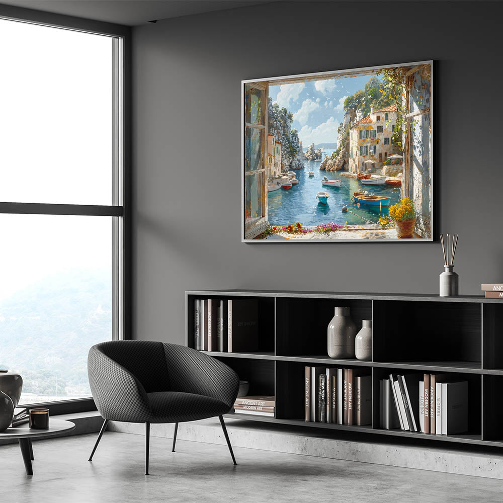 Experience the serene beauty of a coastal harbor with this stunning wall art piece. Captured in exquisite detail, this artwork brings the peacefulness of a seaside harbor right into your home. The image showcases a charming harbor scene with colorful boats gently floating on the calm waters, surrounded by picturesque cliffs and rustic buildings. Perfect for adding a touch of nautical elegance to any room, this piece is ideal for those who love the ocean and coastal living.