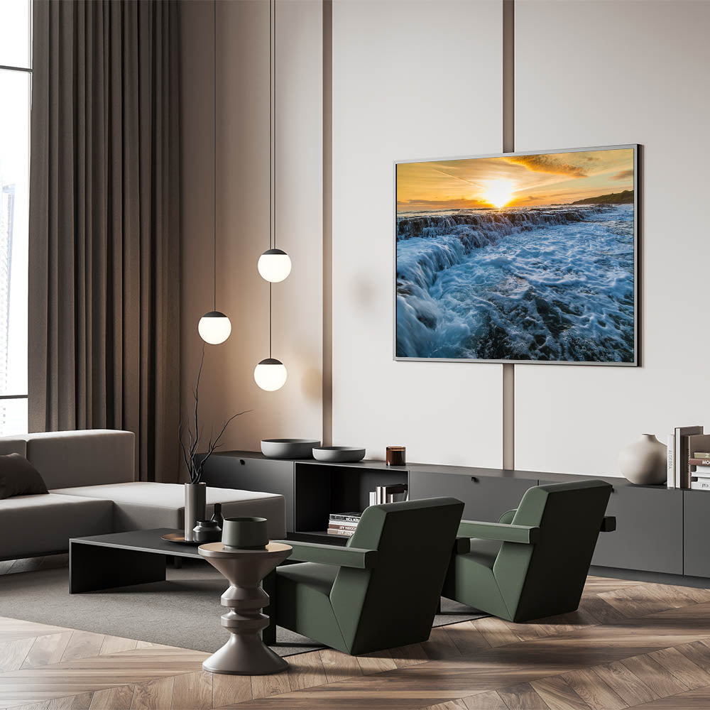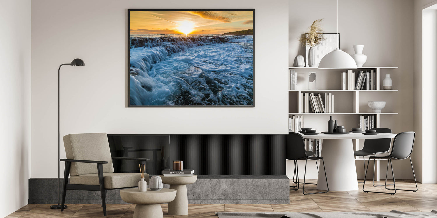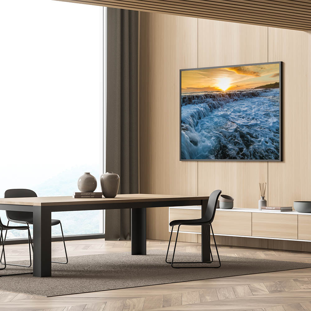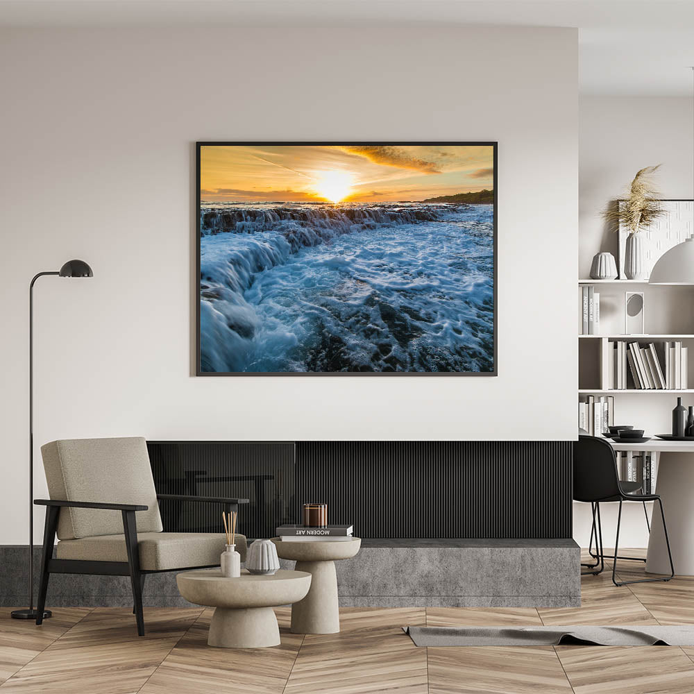 Enhance your home with this Kauai wall decor, featuring the dramatic flow of ocean waves against the backdrop of a glowing sunset, offering a sense of tranquility and natural beauty.