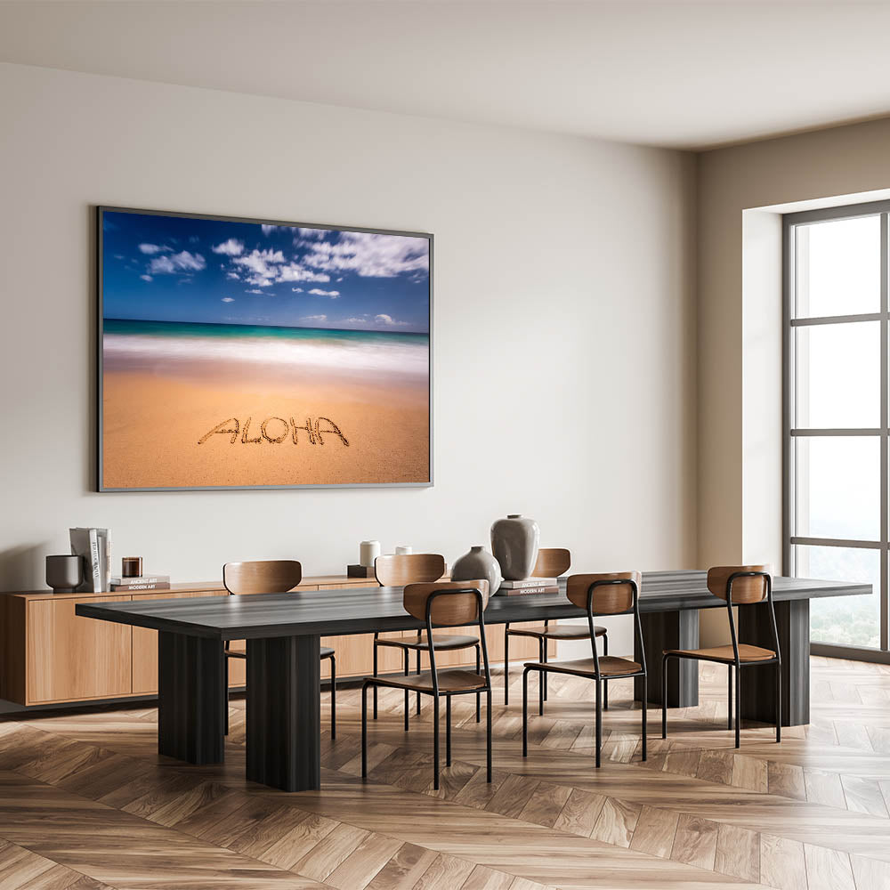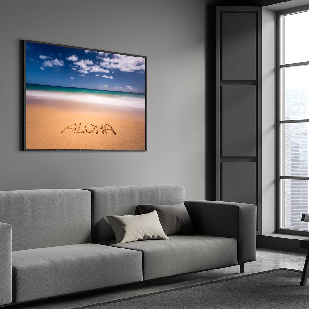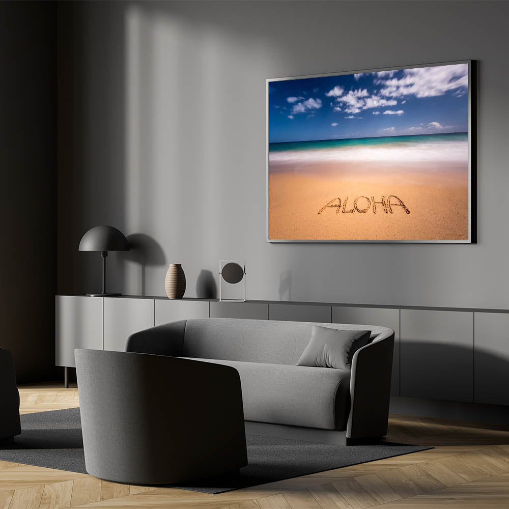 Embrace the spirit of Hawaii with this charming Kauai scenic art featuring the word “Aloha” written in the sand, framed by the turquoise waters and clear skies of Kauai’s pristine beaches. This stunning Kauai photography captures the laid-back vibe of island life, perfect for adding a touch of tropical paradise to any room in your home.