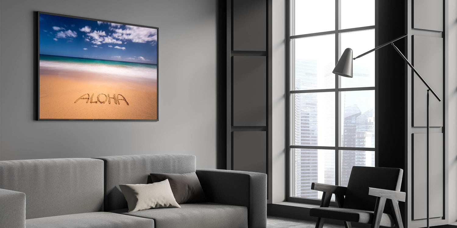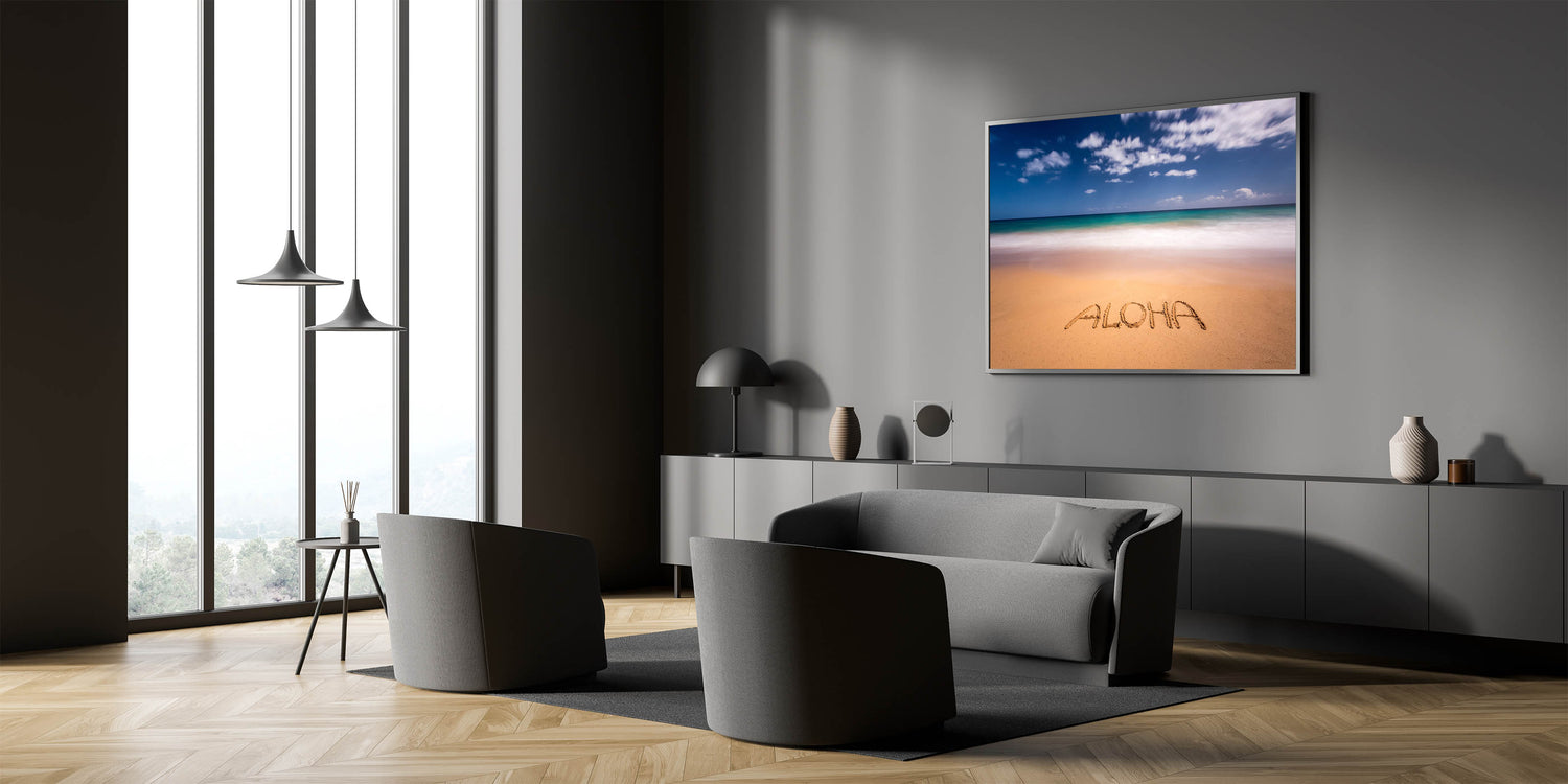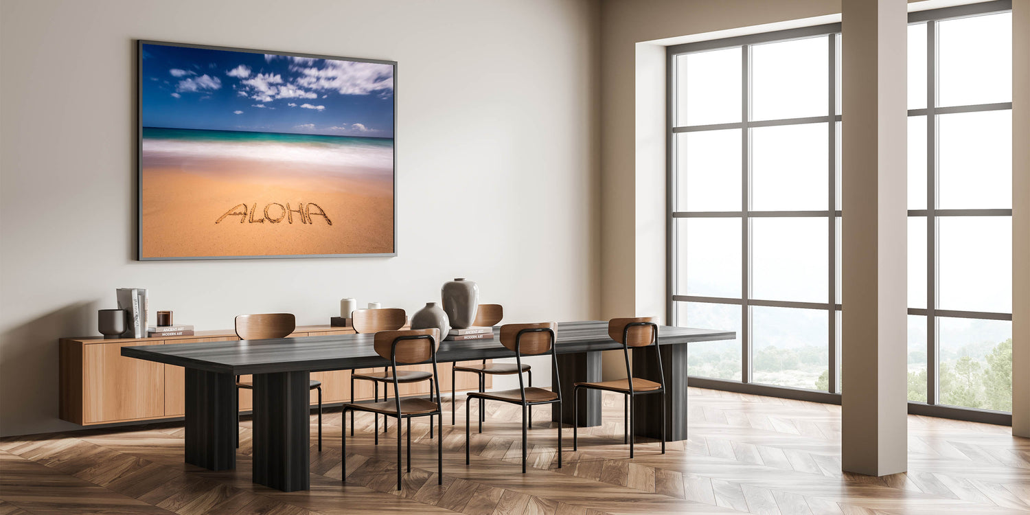 Embrace the spirit of Hawaii with this charming Kauai scenic art featuring the word “Aloha” written in the sand, framed by the turquoise waters and clear skies of Kauai’s pristine beaches. This stunning Kauai photography captures the laid-back vibe of island life, perfect for adding a touch of tropical paradise to any room in your home.