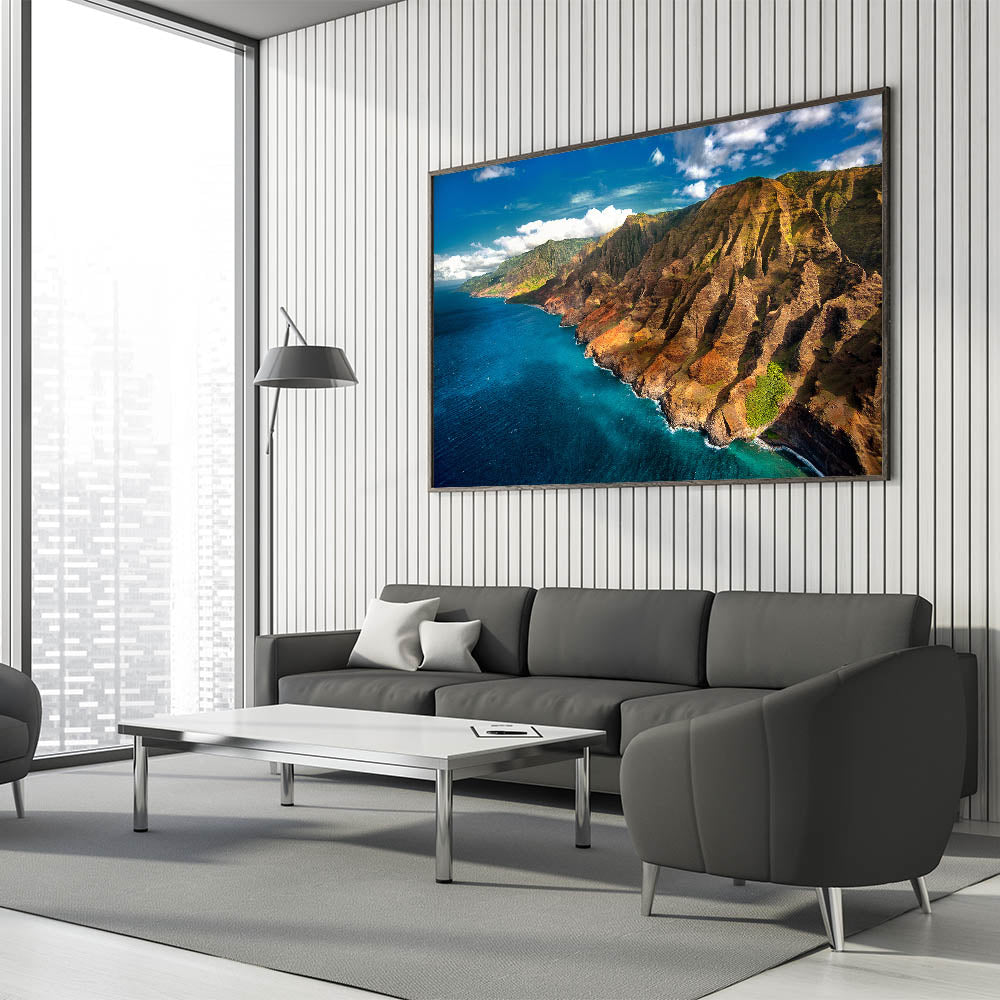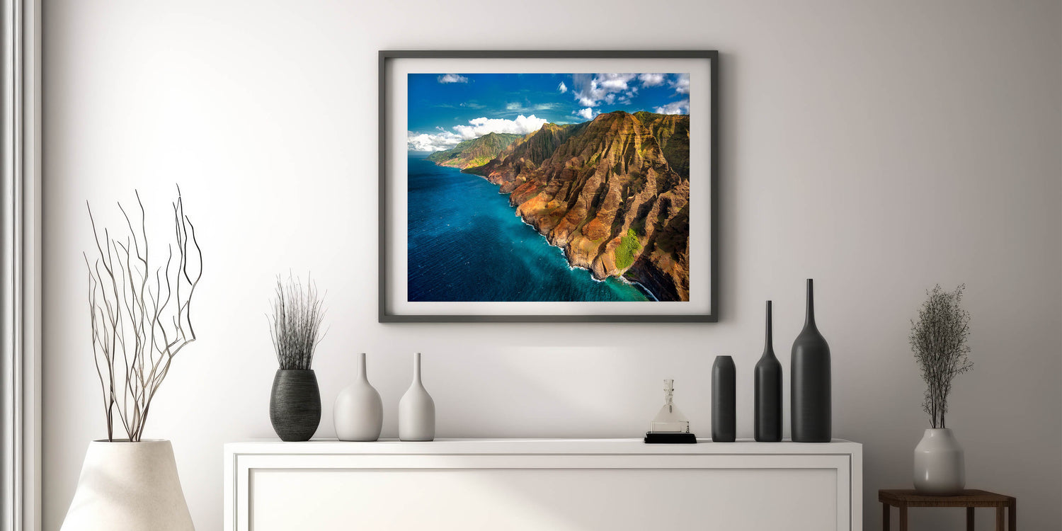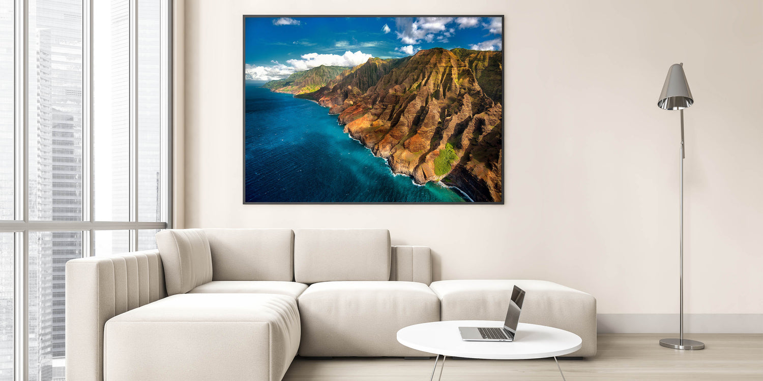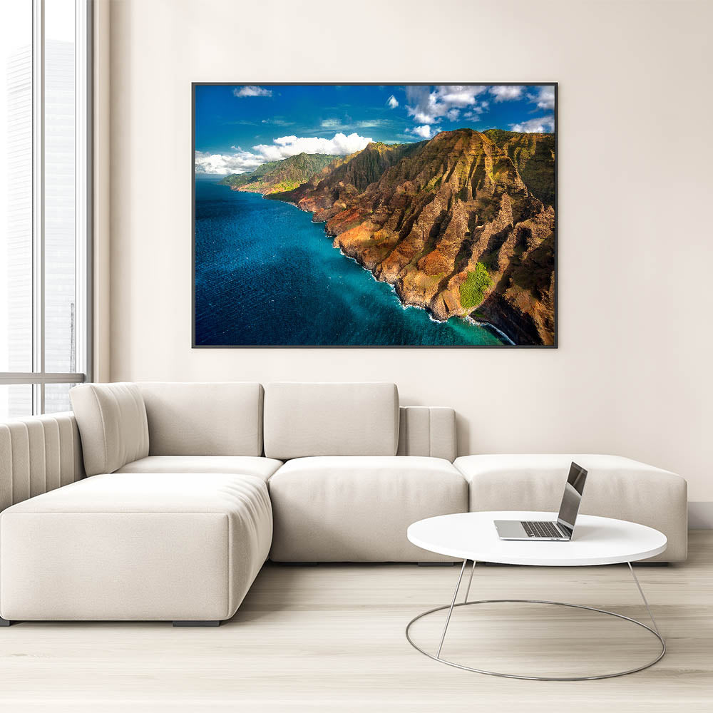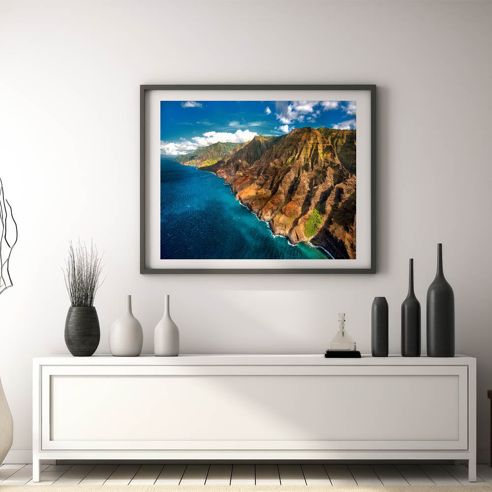 Immerse yourself in the dramatic beauty of Hawaii’s Na Pali Coast with this stunning Kauai wall art. This breathtaking aerial view captures the towering cliffs, vibrant green valleys, and deep blue ocean, showcasing one of the most iconic landscapes on the island. Perfect for any space, this high-quality Kauai photography will transport you to the rugged beauty of the Na Pali Coast.