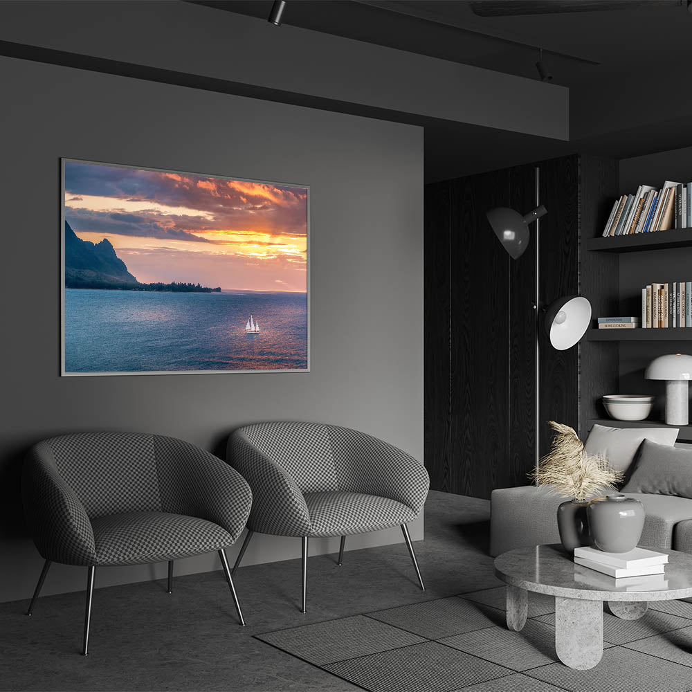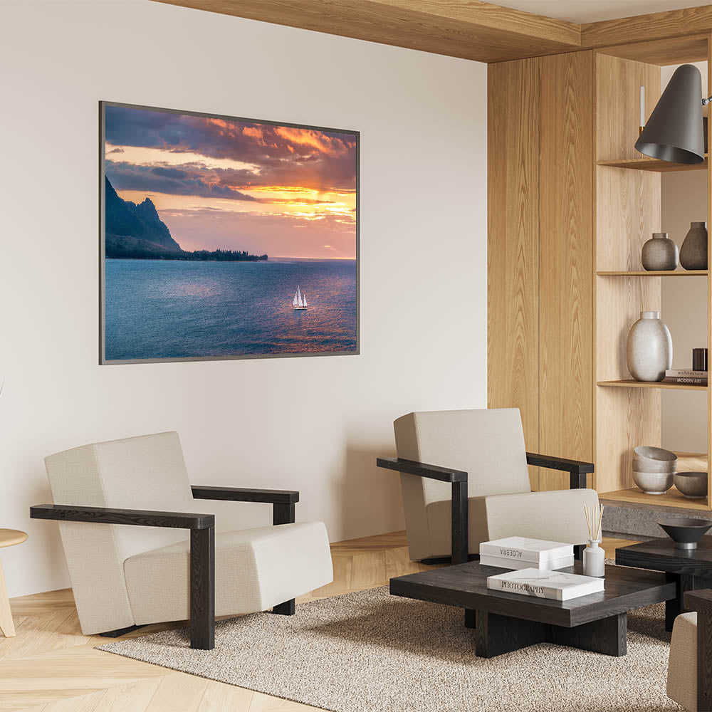 Sail into the tranquility of a Kauai sunset with this stunning Na Pali Coast art. Featuring a serene sailboat gliding across the calm waters as the vibrant colors of the sunset illuminate the sky, this high-quality Kauai photography brings the beauty and peace of Hawaii’s coastline into your home. Perfect for creating a relaxing, tropical atmosphere in any room.