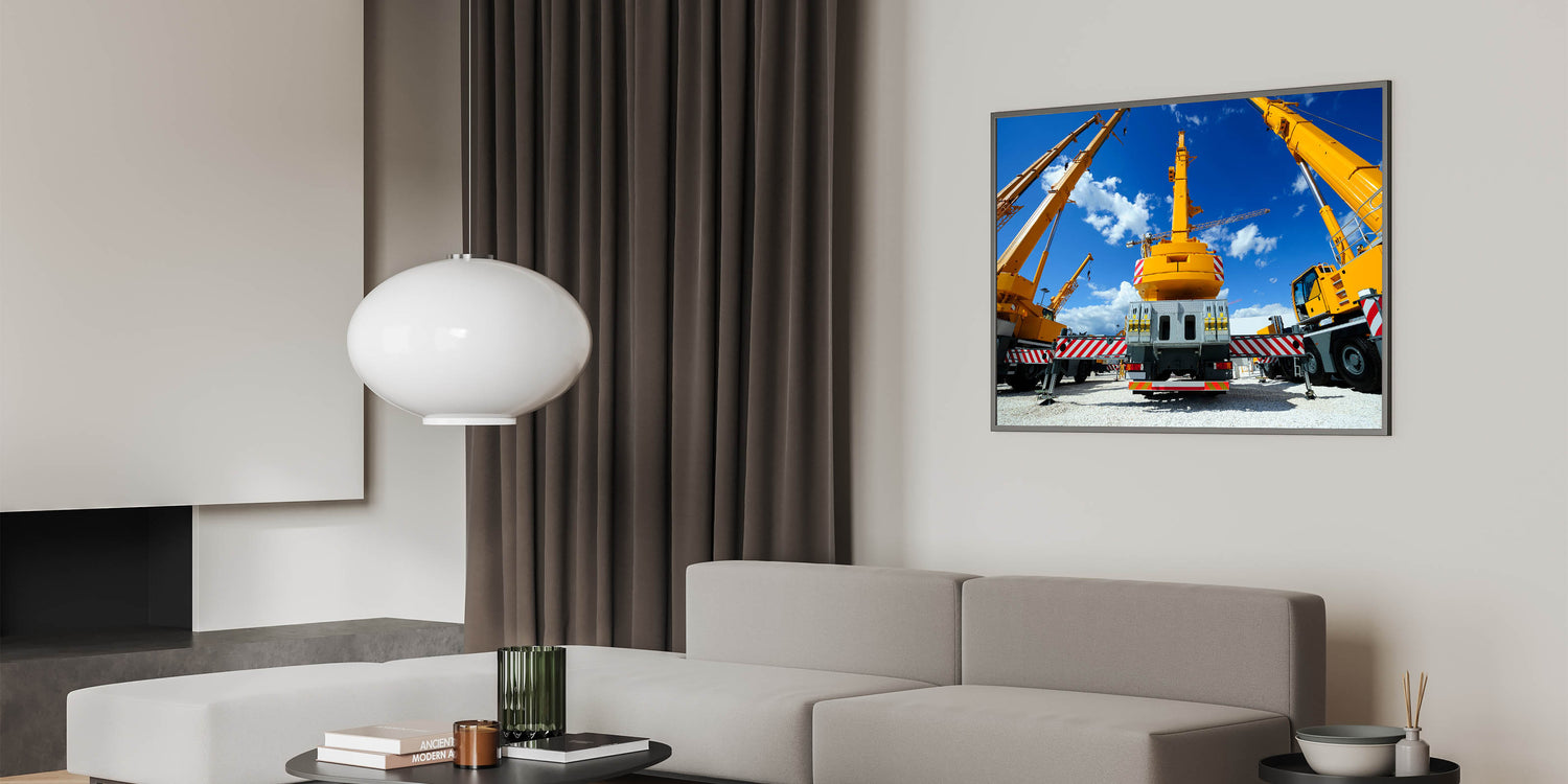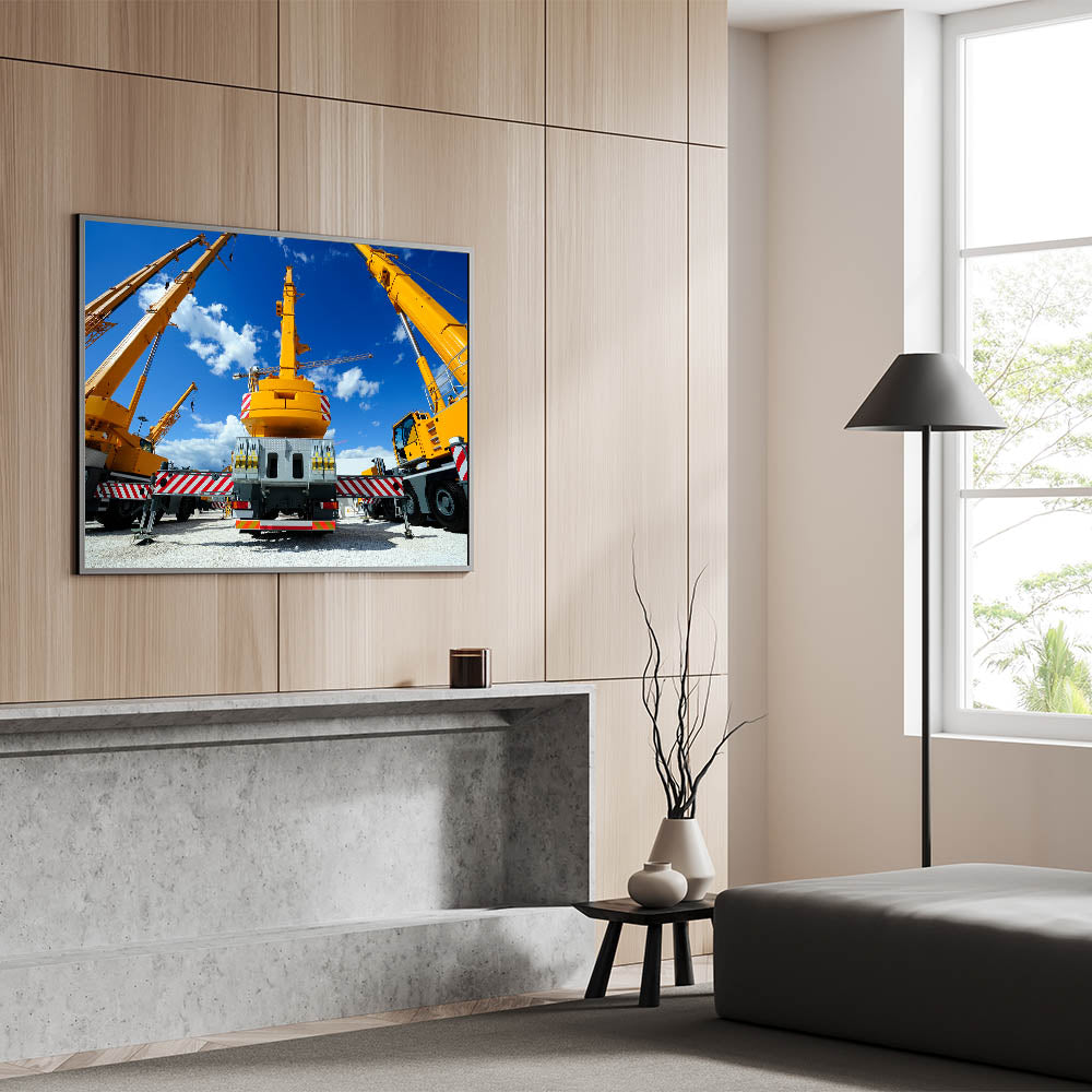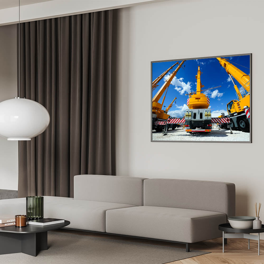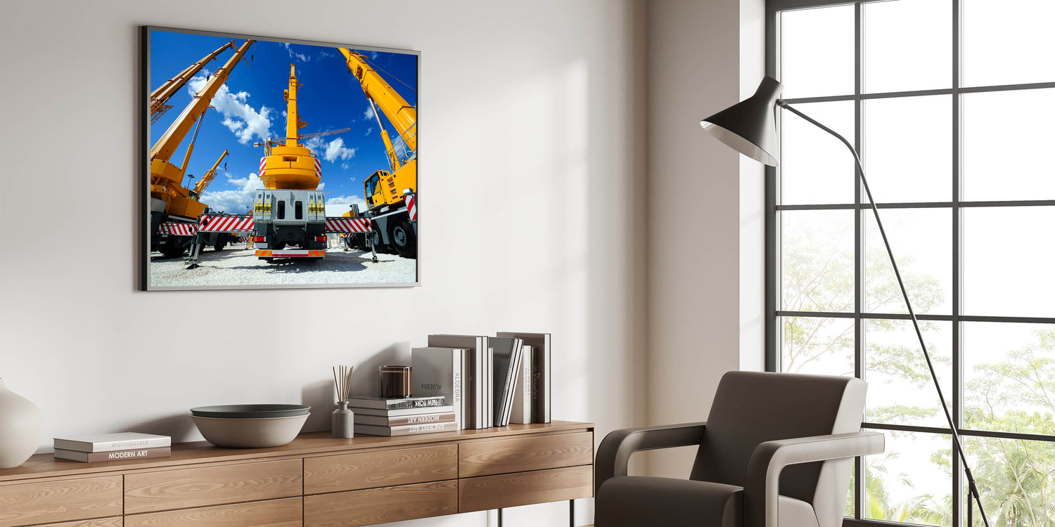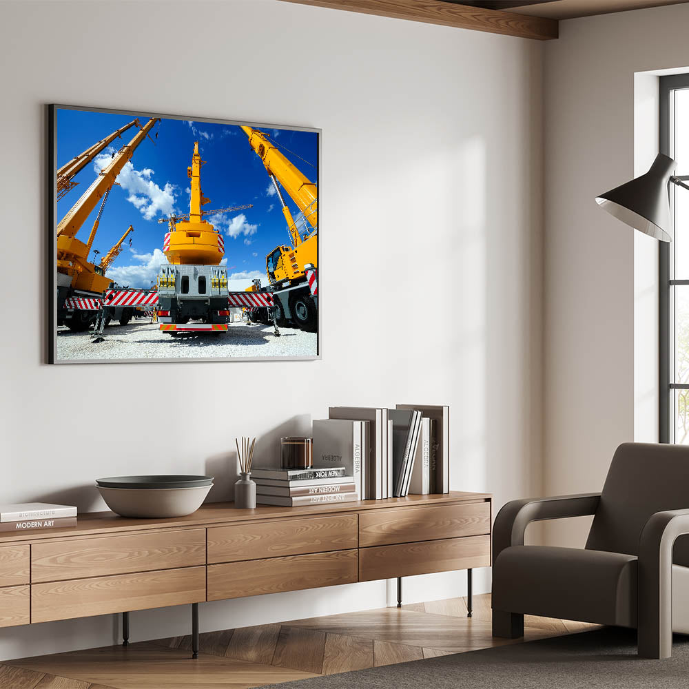 Elevate your space with the dynamic energy of our Construction Cranes Wall Art. This vibrant piece captures the impressive scale and precision of heavy-duty construction cranes against a backdrop of clear blue skies. Perfect for those who admire the engineering marvels of construction sites, this artwork brings a powerful industrial vibe to any room. Whether you’re a construction professional, an engineer, or simply a fan of heavy machinery, this print will make a bold statement in your decor.