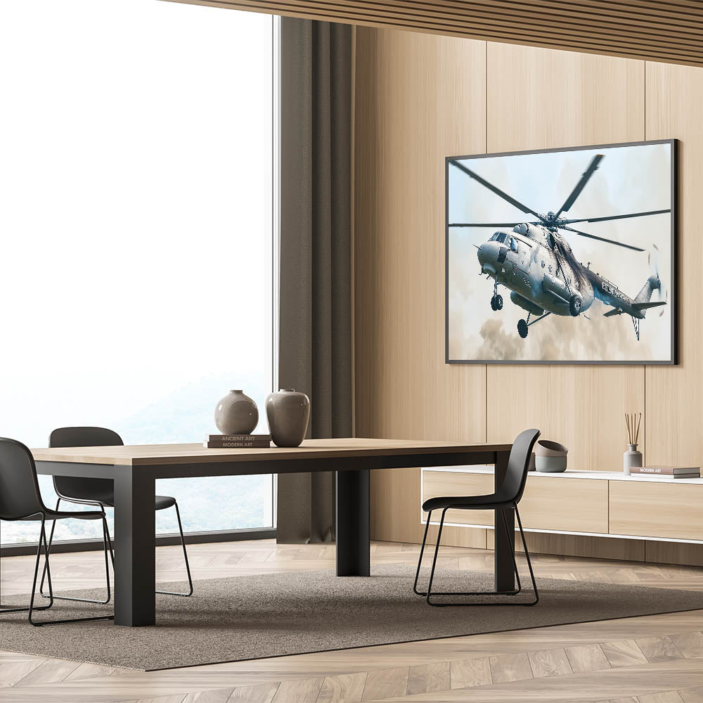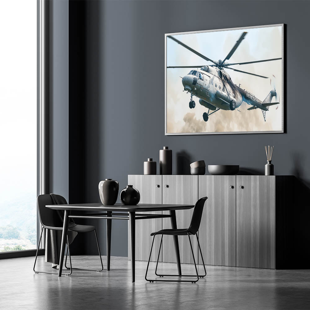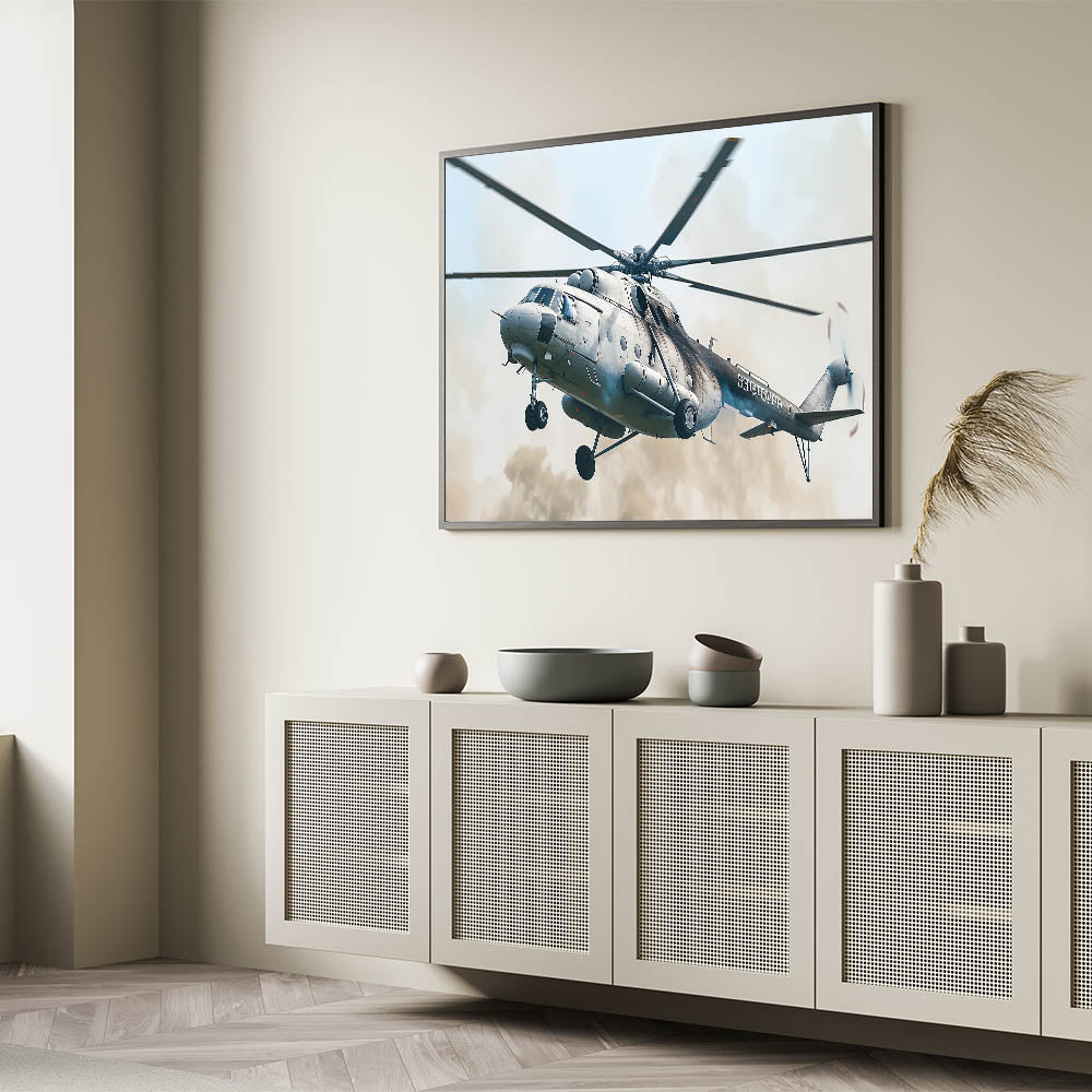 Capture the essence of military power with this bold helicopter in flight wall art. This striking artwork features a military helicopter in action, soaring through the sky with precision and strength. The detailed depiction of the helicopter, combined with its powerful stance, makes this piece an ideal addition for anyone who appreciates the might of aviation technology and military prowess.