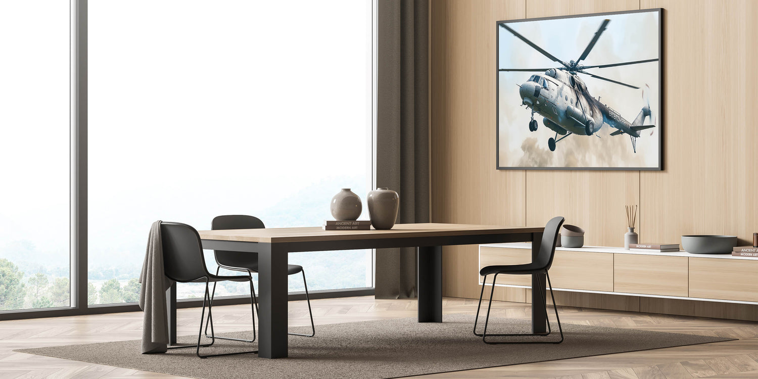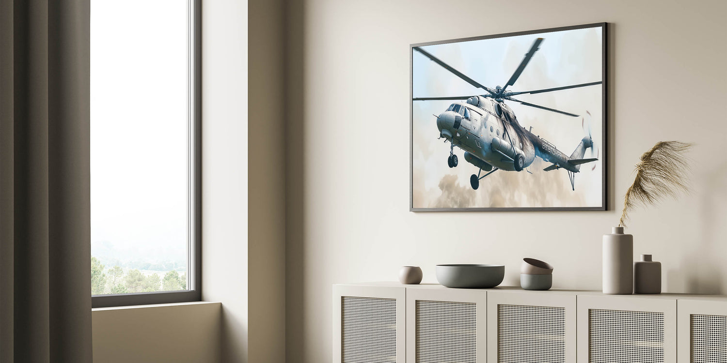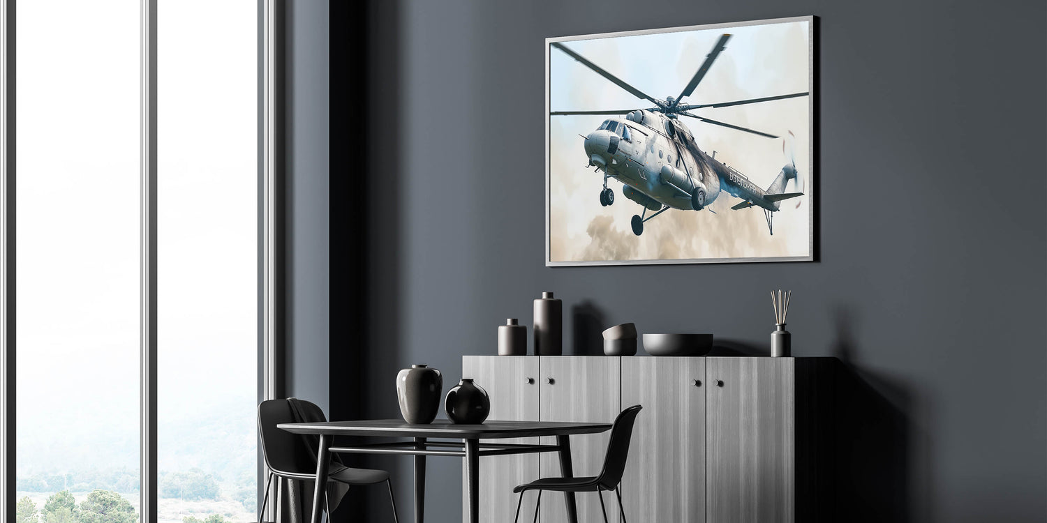 Capture the essence of military power with this bold helicopter in flight wall art. This striking artwork features a military helicopter in action, soaring through the sky with precision and strength. The detailed depiction of the helicopter, combined with its powerful stance, makes this piece an ideal addition for anyone who appreciates the might of aviation technology and military prowess.