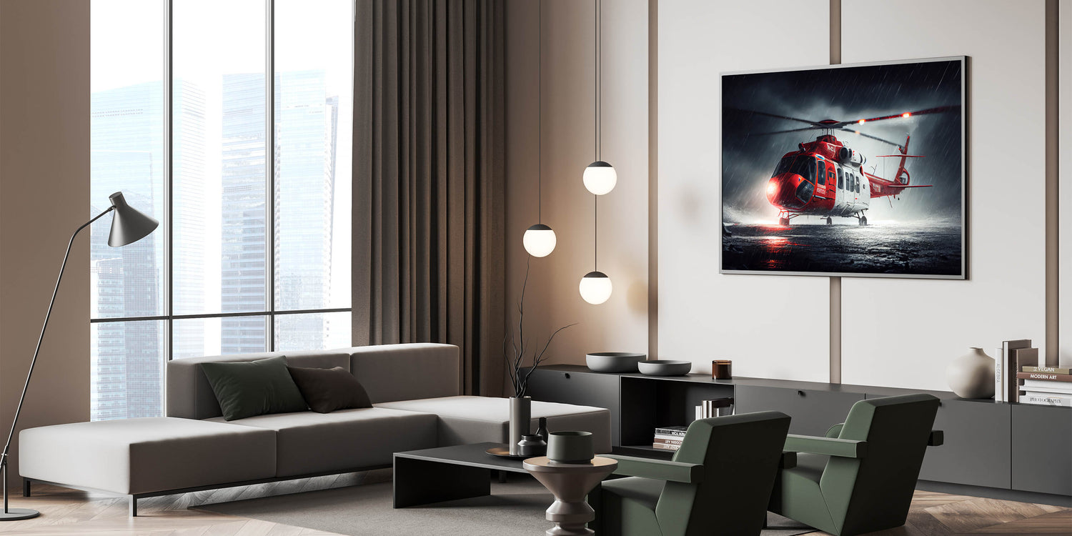 Elevate your living space with this striking helicopter wall art, perfect for aviation enthusiasts and those with a passion for modern design. This captivating piece captures a sleek helicopter in mid-flight against a dramatic sunset backdrop, making it an eye-catching addition to any room. Printed on high-quality materials, this helicopter artwork is available in multiple formats, including stretched canvas, framed canvas, acrylic glass, and framed print, ensuring you can find the perfect fit for your decor style.