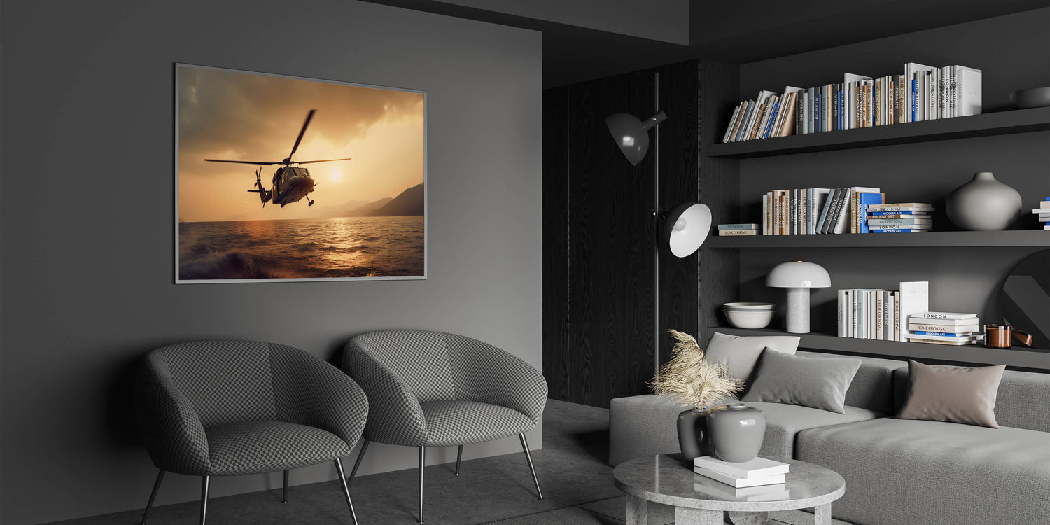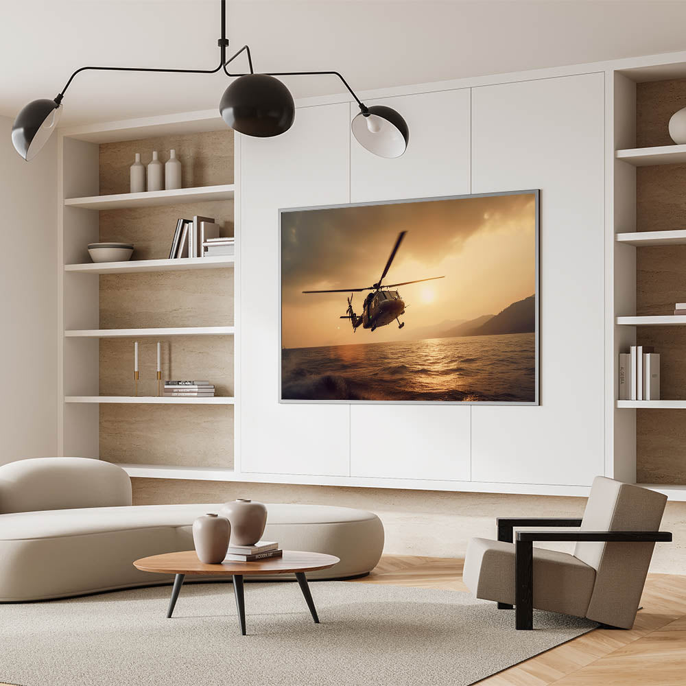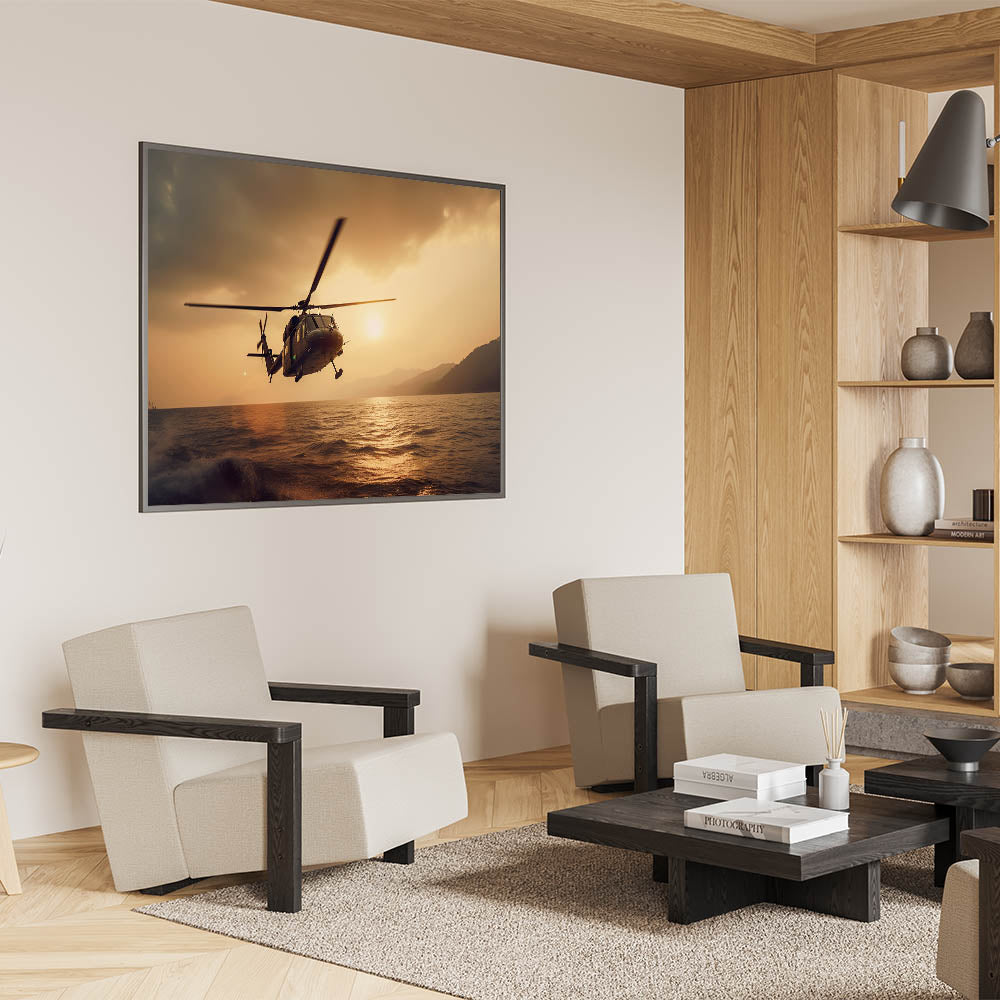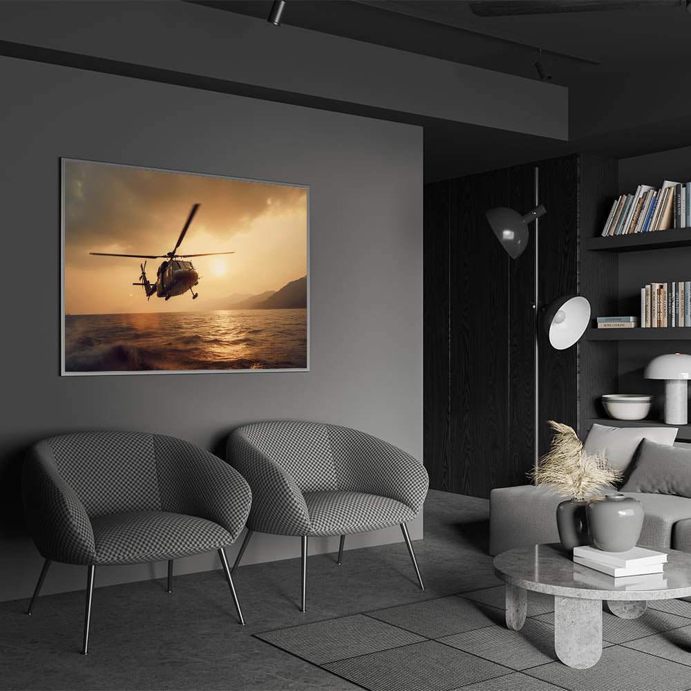 Capture the serene beauty of aviation with this breathtaking sunset helicopter wall art. This artwork features a helicopter soaring over calm waters as the sun dips below the horizon, casting a golden glow across the scene. The warm tones of the sunset paired with the sleek silhouette of the helicopter create a captivating visual experience, perfect for adding a touch of elegance to any room.