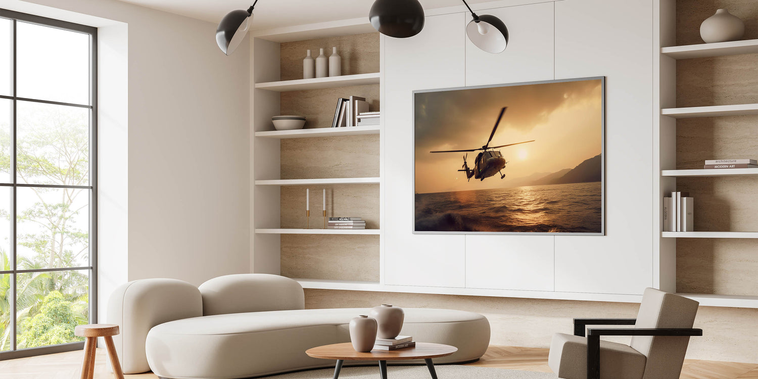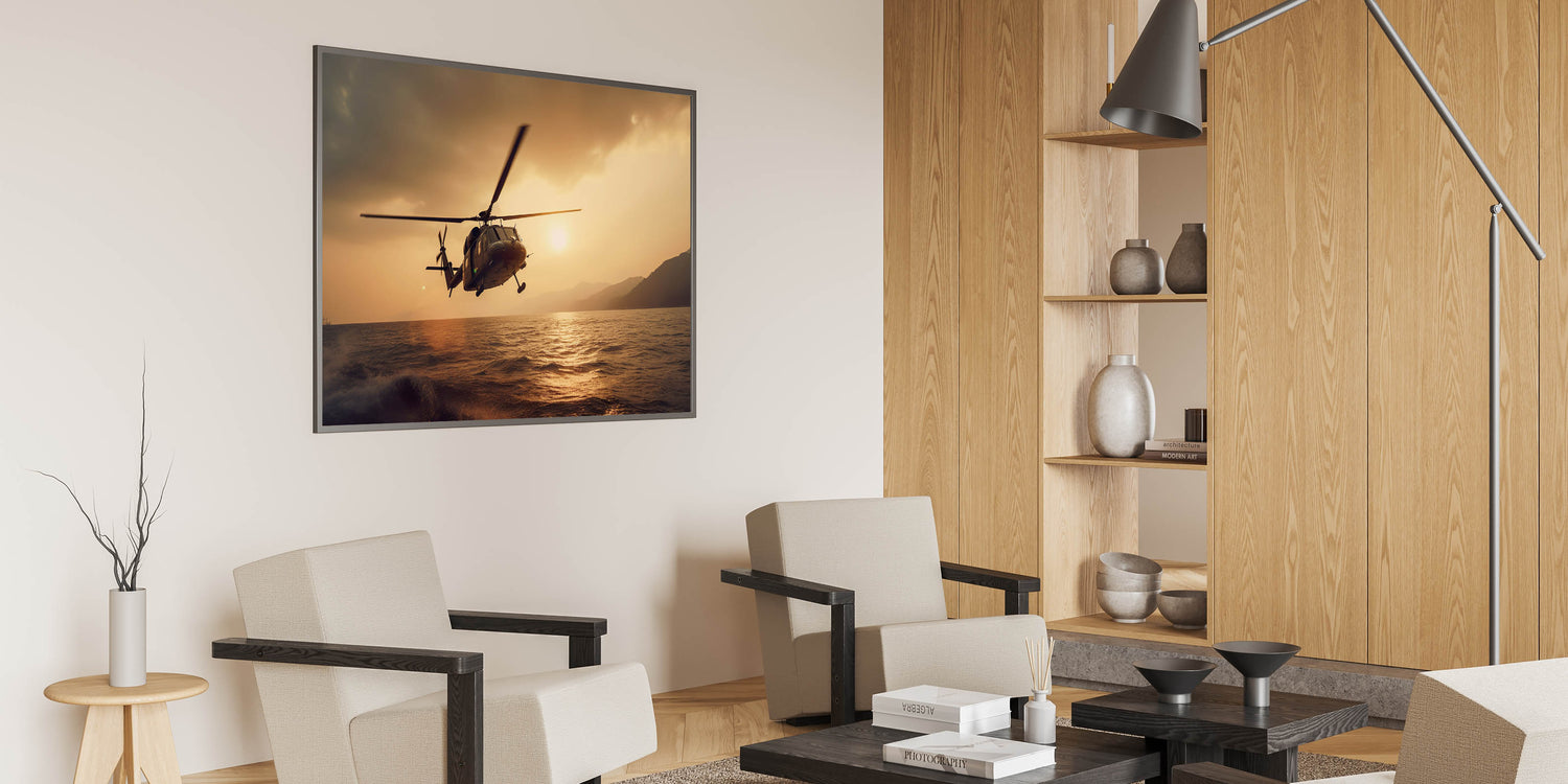 This piece is perfect for those who appreciate the subtle blend of technology and nature, making it a versatile addition to both modern and traditional decor. Whether you're looking for aviation-themed wall decor or a unique transportation print for your living room, this sunset helicopter artwork is sure to impress. Elevate your space with this timeless depiction of flight and nature's beauty.