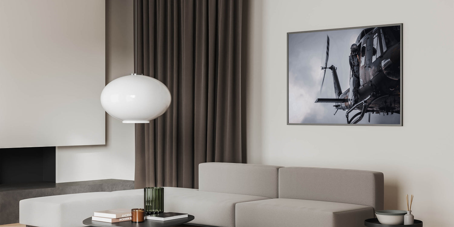 Elevate your living space with this striking helicopter wall art, perfect for aviation enthusiasts and those with a passion for modern design. This captivating piece captures a sleek helicopter in mid-flight against a dramatic sunset backdrop, making it an eye-catching addition to any room. Printed on high-quality materials, this helicopter artwork is available in multiple formats, including stretched canvas, framed canvas, acrylic glass, and framed print, ensuring you can find the perfect fit for your decor style.