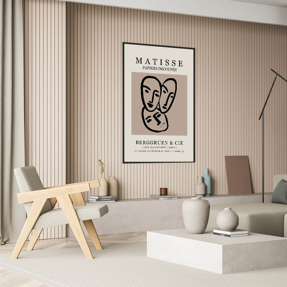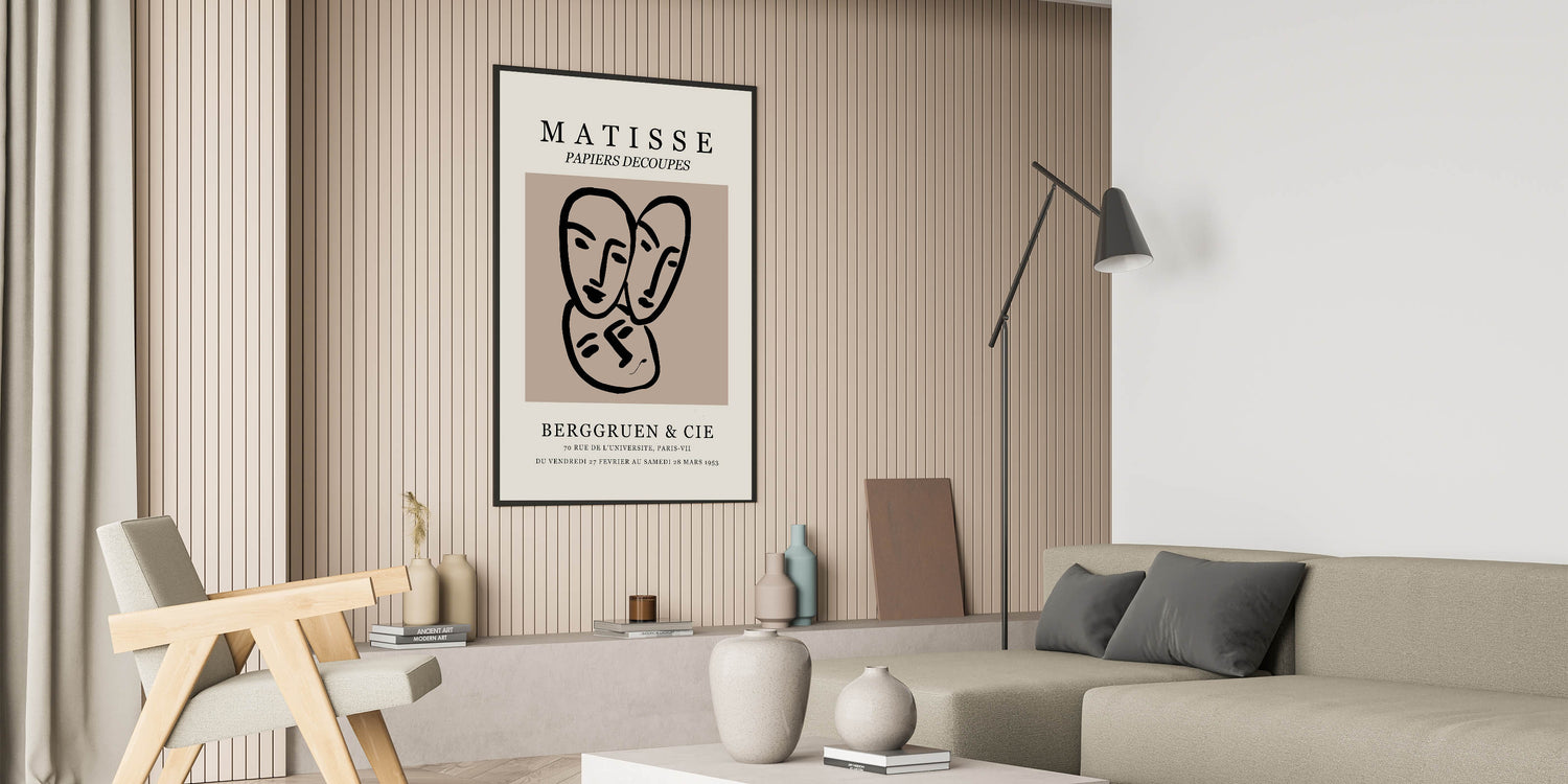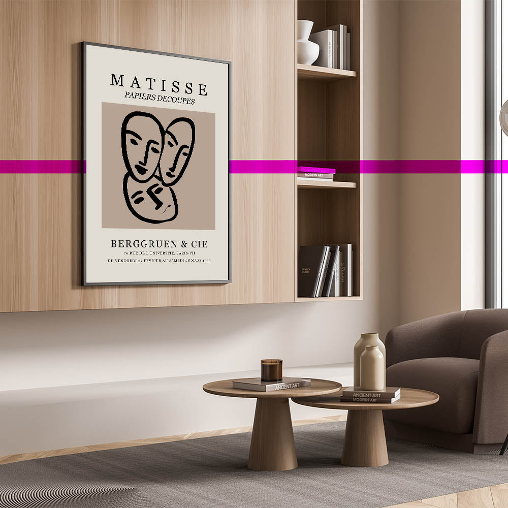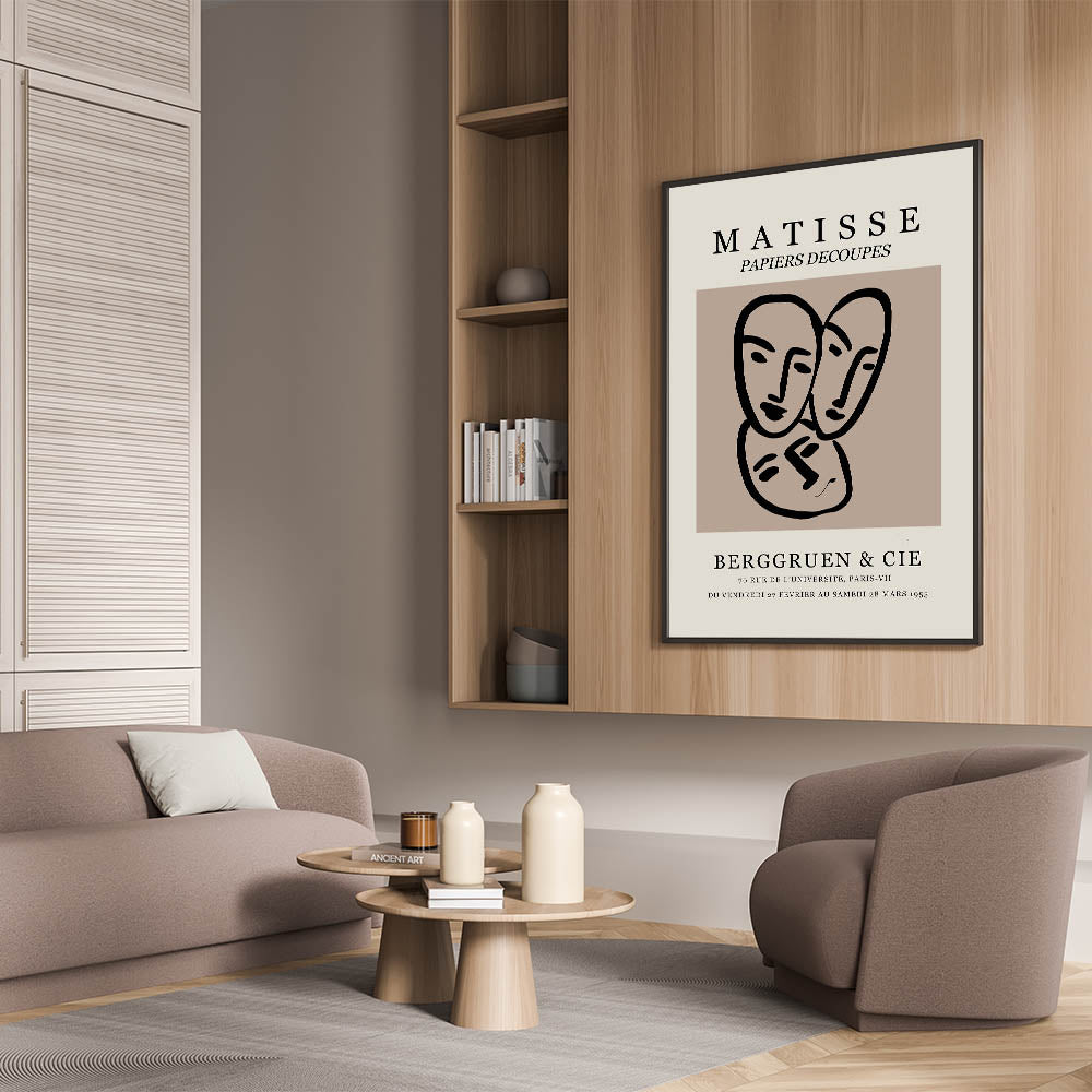 Experience the minimalist beauty of Henri Matisse’s "Papiers Decoupes," a striking example of his cut-out technique that defined his later years. This artwork captures Matisse’s mastery of form through the simplicity of line and shape. With clean, bold strokes, the piece features abstracted human faces, creating an evocative composition that speaks to Matisse’s ability to distill emotion and expression with minimal detail. The earthy, neutral background emphasizes the stark black lines, making this artwork a captivating piece that effortlessly blends modernist sensibilities with timeless elegance.