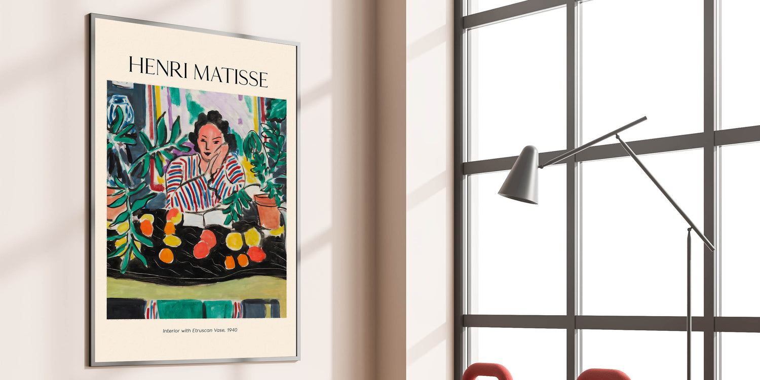 Bring the vibrant energy of Matisse’s Interior with Etruscan Vase, 1940 into your living space. This Fauvism-inspired art print showcases Matisse's mastery of vibrant color and expressive shapes. The composition blends deep greens, warm oranges, and bold blacks, evoking Matisse's distinctive art style. With a focus on decorative elements like the Etruscan vase and lush plants, this artwork reflects the Modernism influence that defined much of Matisse’s work as a celebrated French painter.