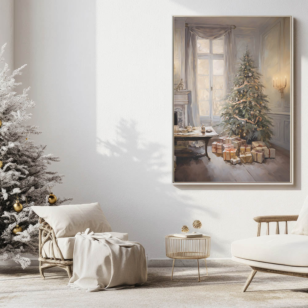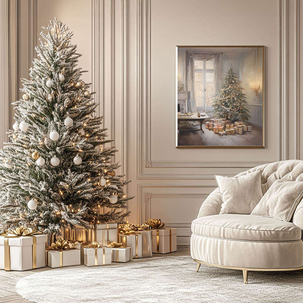 Create a timeless holiday atmosphere with this beautifully detailed Christmas Canvas Art, featuring an elegant Christmas tree adorned with delicate golden ornaments and wrapped in a soft, glowing garland. The luxurious interior, complete with classic furnishings and beautifully wrapped gifts, evokes a sophisticated festive charm, making this artwork a perfect addition to your seasonal decor. Whether displayed in your living room, dining area, or entryway, this piece brings a refined holiday elegance to your home.