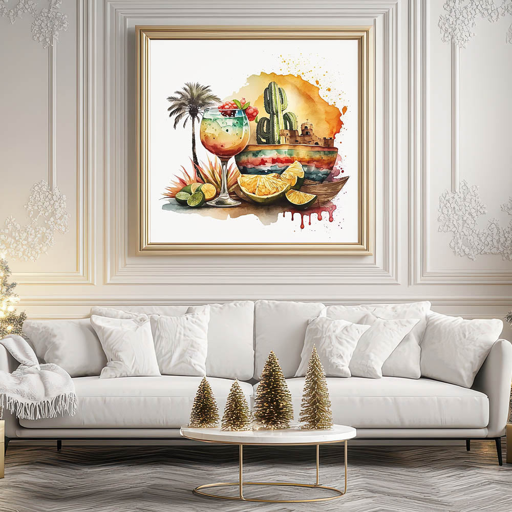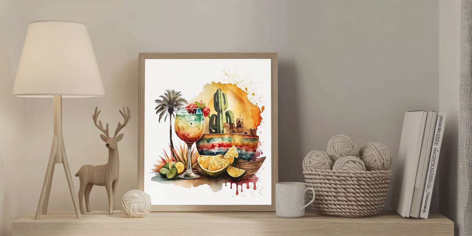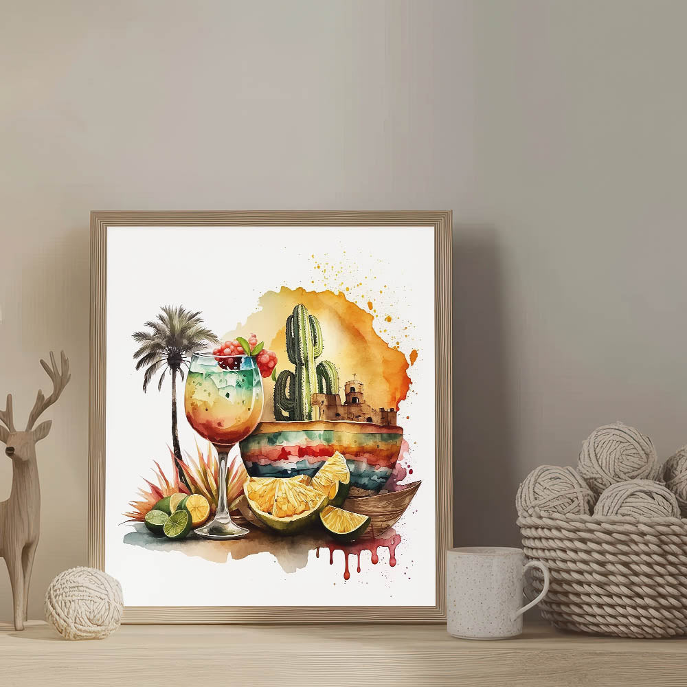 Bring the spirit of Mexico into your home with this stunning Mexican Fiesta Cinco de Mayo Decor, featuring a vibrant watercolor scene of a refreshing cocktail, juicy citrus fruits, a traditional ceramic bowl, and a majestic cactus. With its rich colors and festive details, this Mexican Party Wall Art perfectly captures the essence of Cinco de Mayo celebrations and Mexican culture. Whether you’re decorating for a party or adding flair to your kitchen or bar, this artwork will brighten any space.