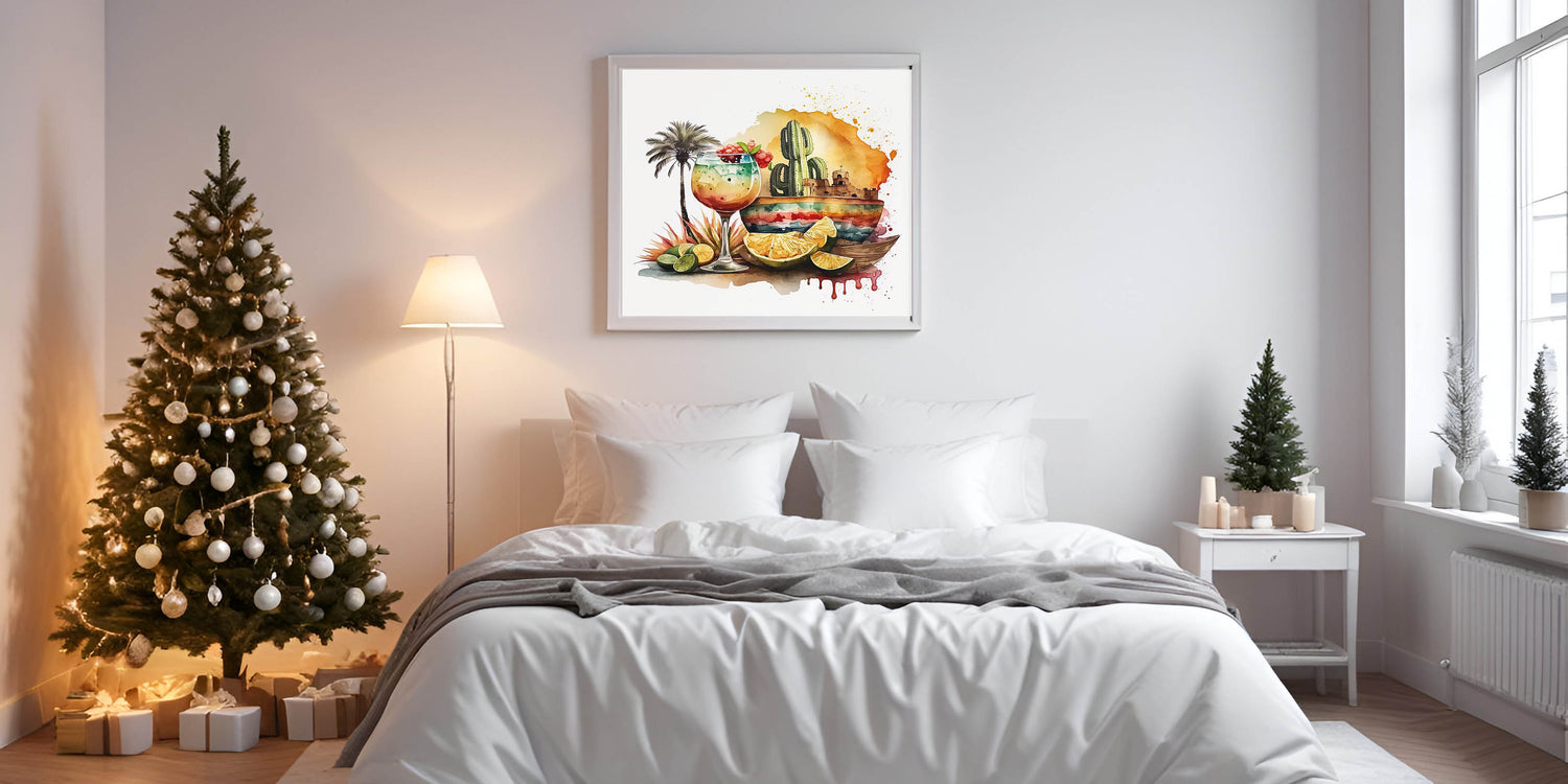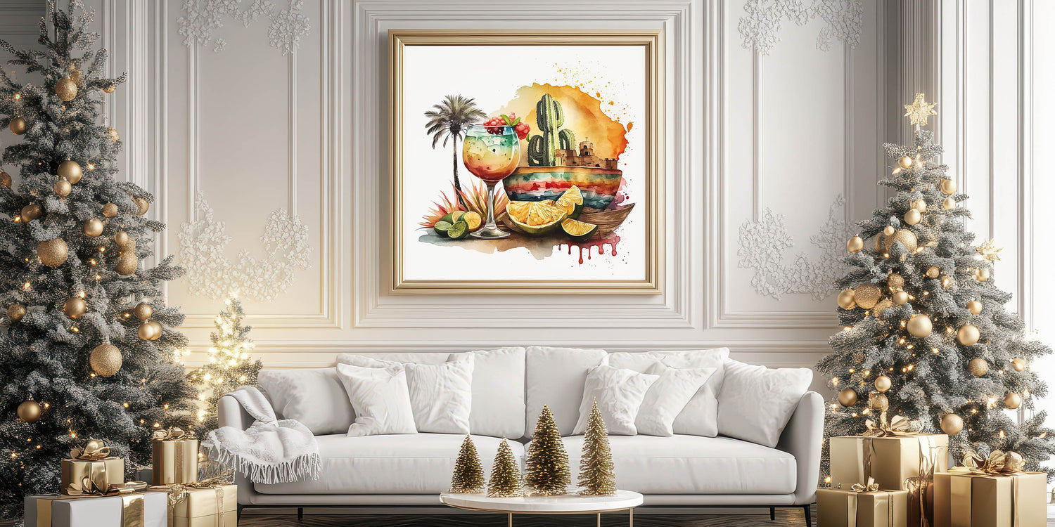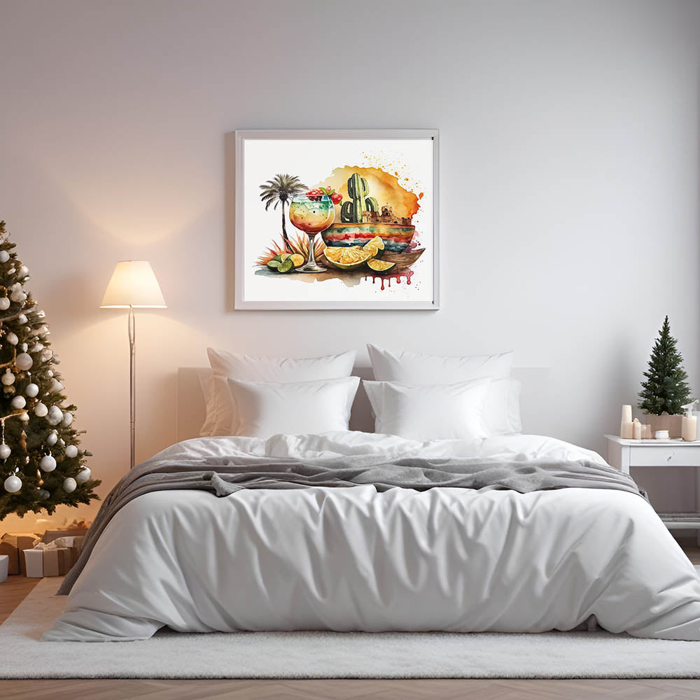 Bring the spirit of Mexico into your home with this stunning Mexican Fiesta Cinco de Mayo Decor, featuring a vibrant watercolor scene of a refreshing cocktail, juicy citrus fruits, a traditional ceramic bowl, and a majestic cactus. With its rich colors and festive details, this Mexican Party Wall Art perfectly captures the essence of Cinco de Mayo celebrations and Mexican culture. Whether you’re decorating for a party or adding flair to your kitchen or bar, this artwork will brighten any space.
