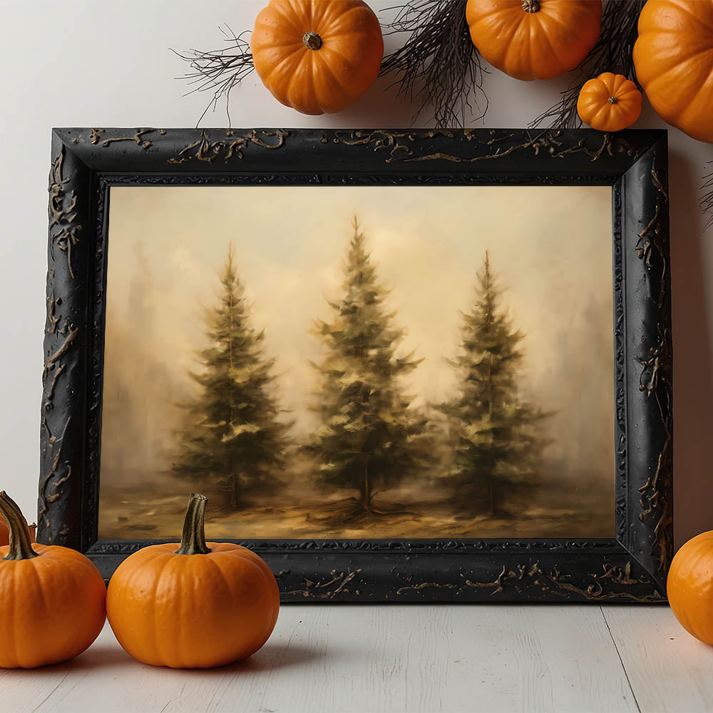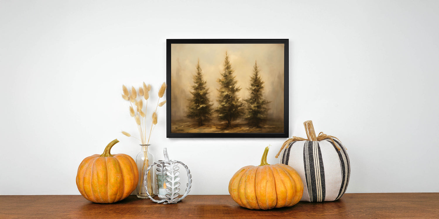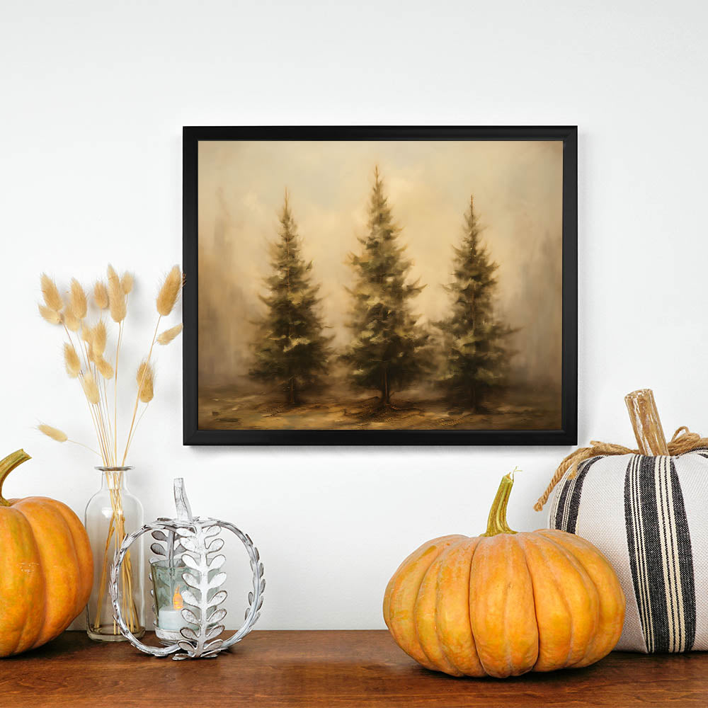 Embrace the beauty of nature with this stunning Thanksgiving Wall Hanging, featuring a trio of rustic pine trees set against a misty autumn backdrop. The earthy tones and soft textures create a peaceful, inviting atmosphere, making this artwork an ideal addition to any seasonal decor.