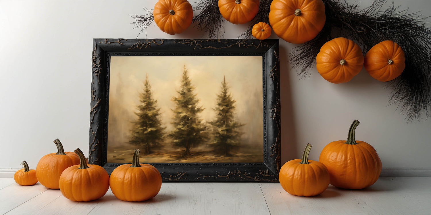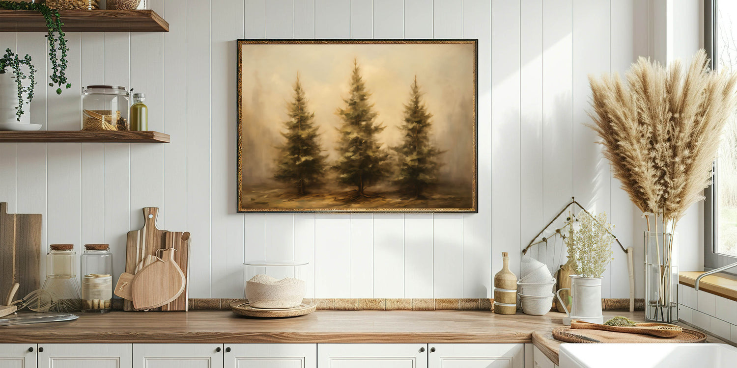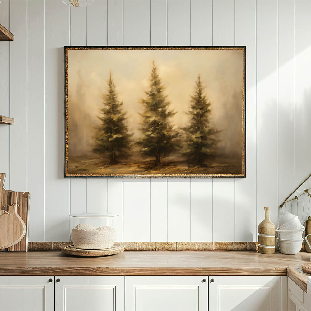 Embrace the beauty of nature with this stunning Thanksgiving Wall Hanging, featuring a trio of rustic pine trees set against a misty autumn backdrop. The earthy tones and soft textures create a peaceful, inviting atmosphere, making this artwork an ideal addition to any seasonal decor.