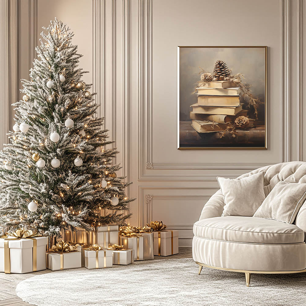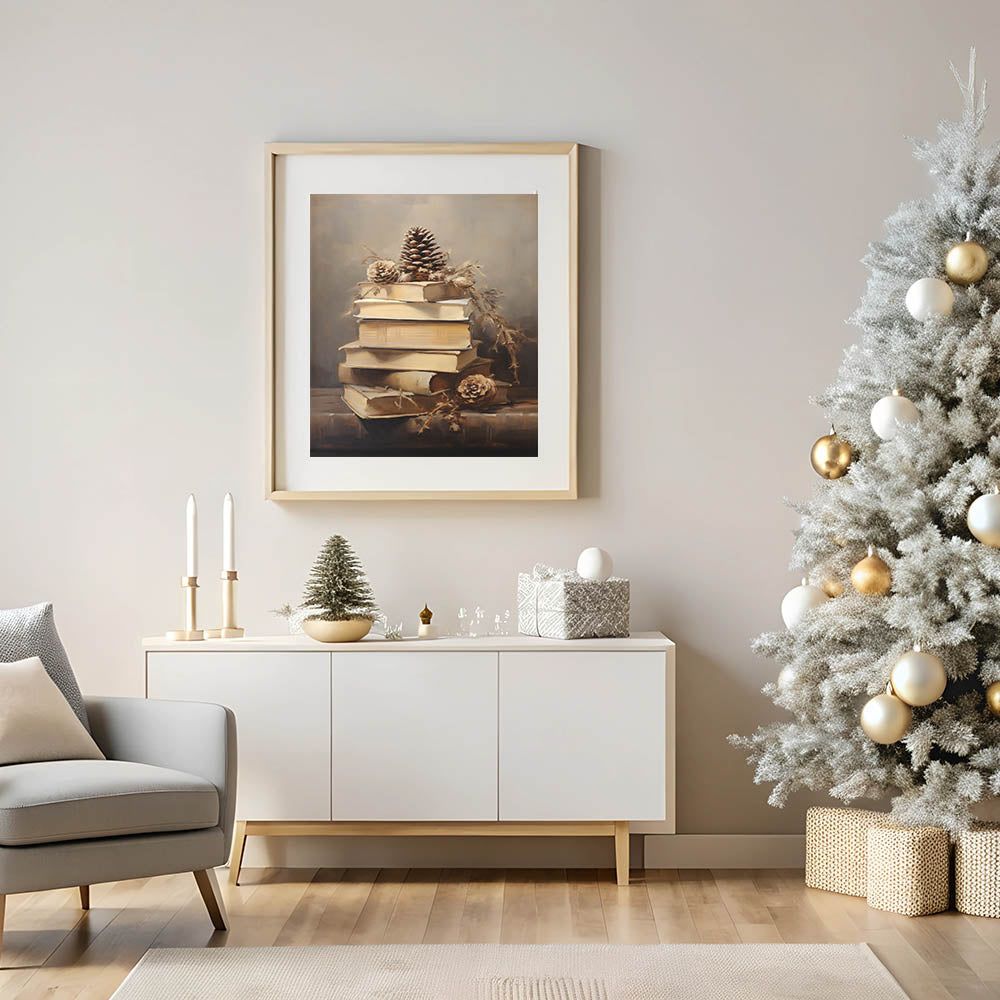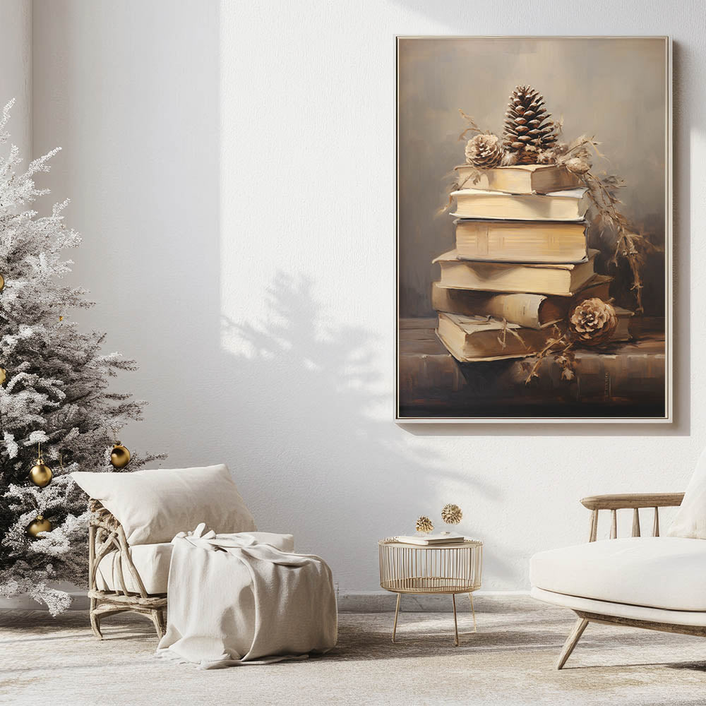 Add a touch of vintage holiday charm to your home with this elegant Christmas Wall Hangings piece, featuring a beautifully stacked collection of antique books decorated with pinecones and dried winter foliage. The warm beige and brown tones, soft shadows, and delicate brushstrokes create a cozy and timeless atmosphere, making this artwork a perfect addition to your seasonal decor. Whether displayed in a library, living room, or study, this piece adds a sophisticated festive touch to your space.