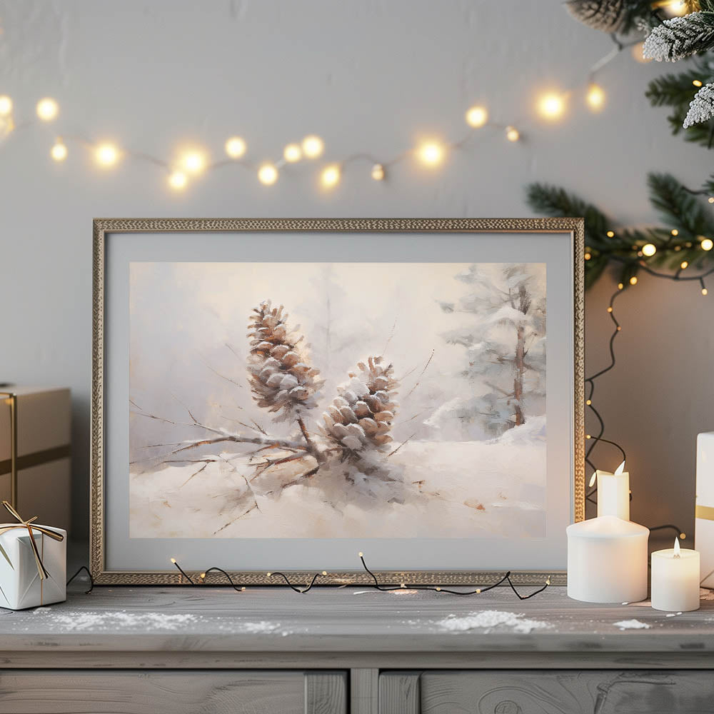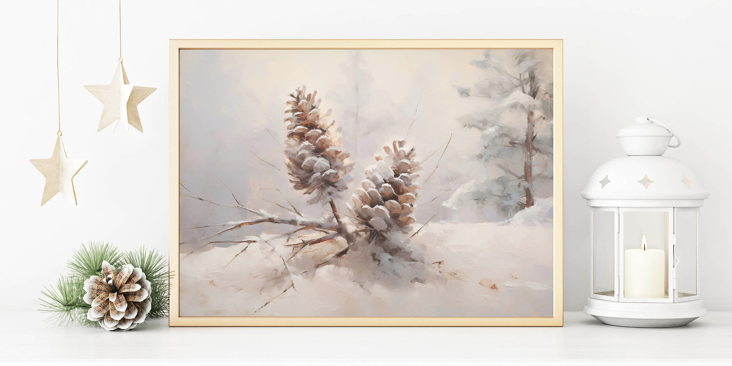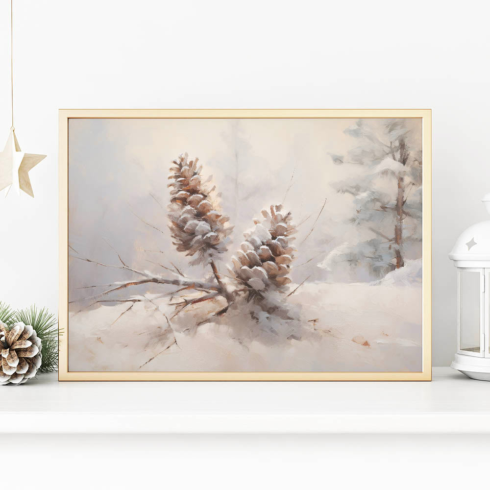 Embrace the serene beauty of winter with this stunning Christmas Wall Art, featuring a pair of snow-covered pinecones resting gently on a peaceful, frosty landscape. The soft neutral tones, delicate brushstrokes, and subtle light bring a sense of tranquility, making this artwork a perfect addition to your seasonal decor. Whether displayed in your living room, hallway, or bedroom, this Christmas Canvas Art adds a refined touch of nature’s winter charm to your space.