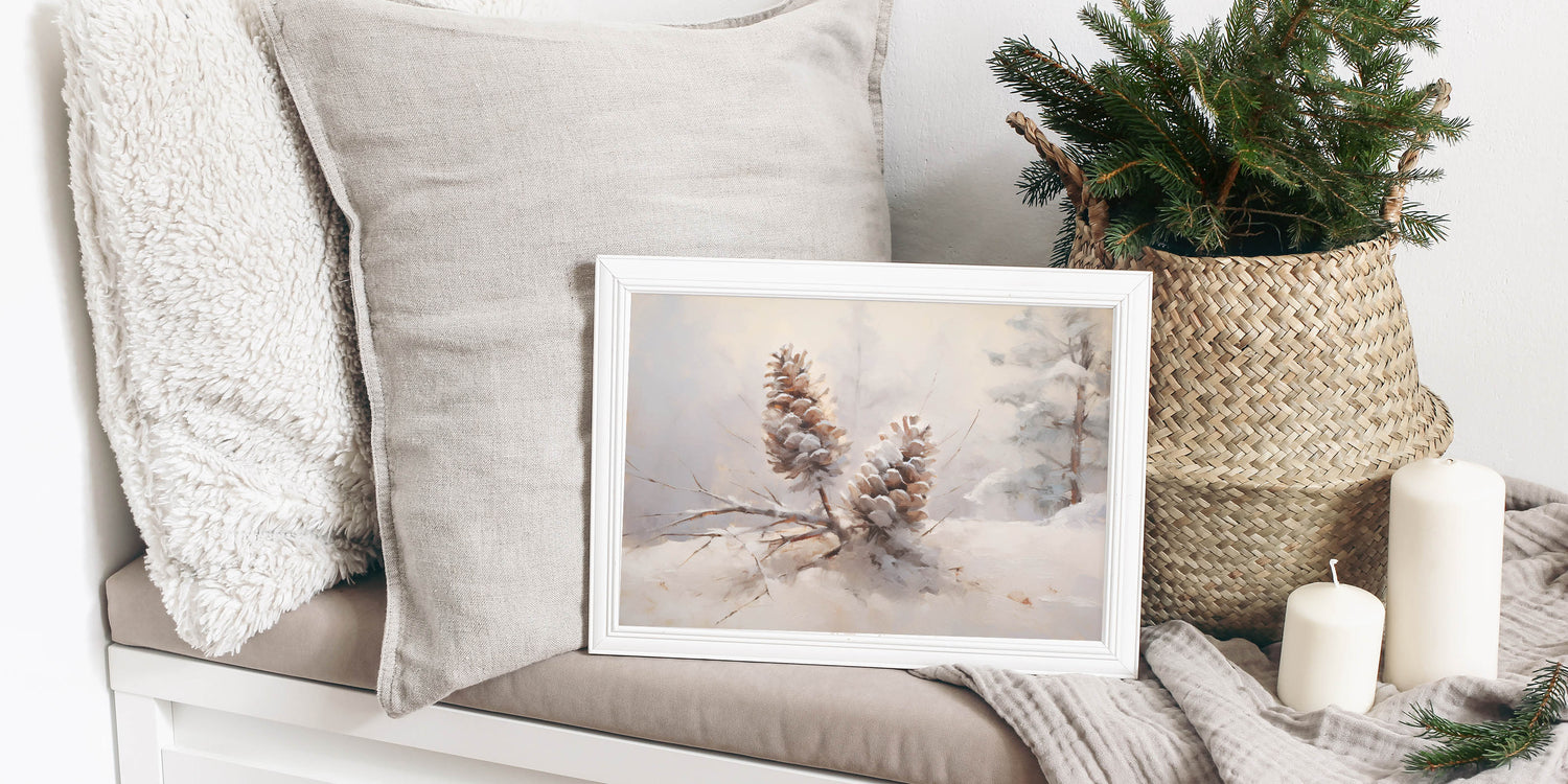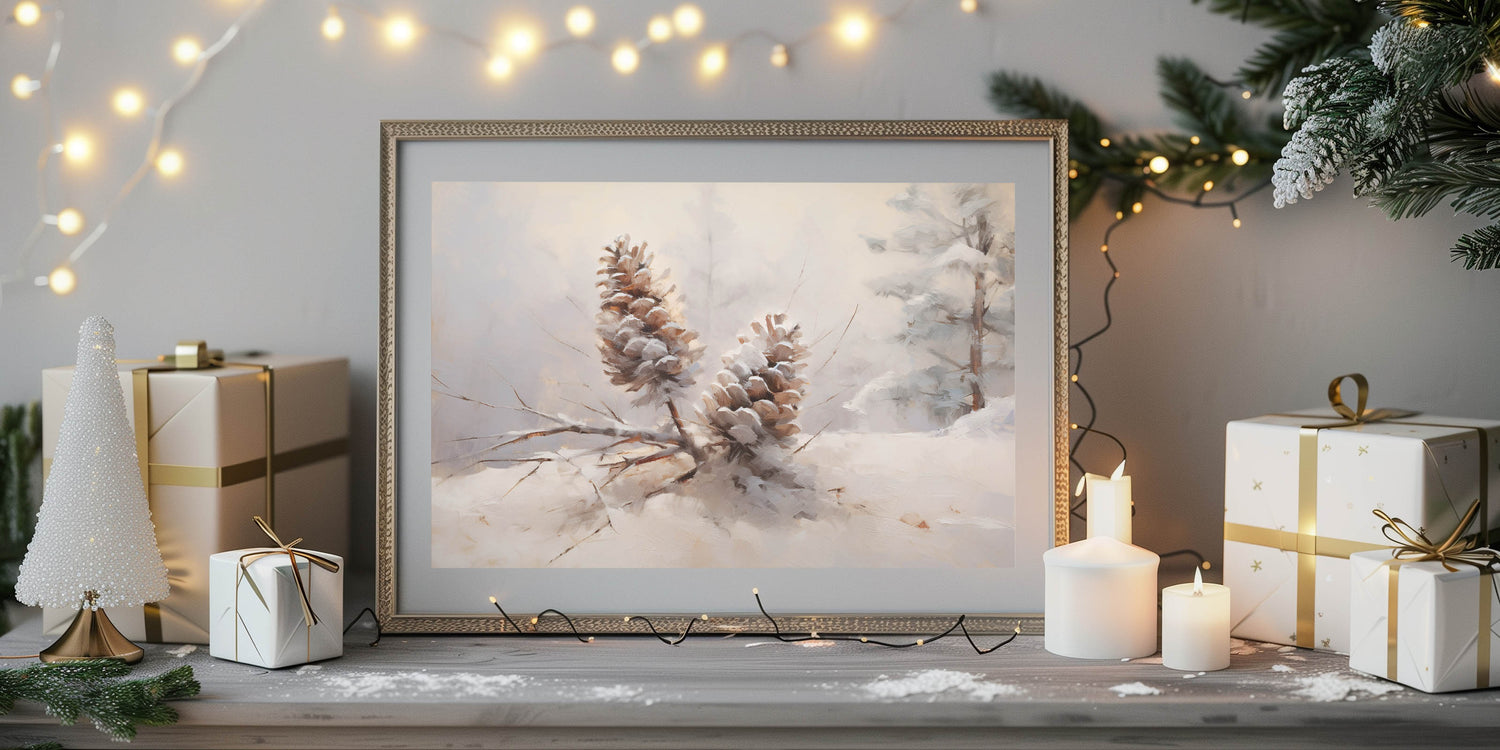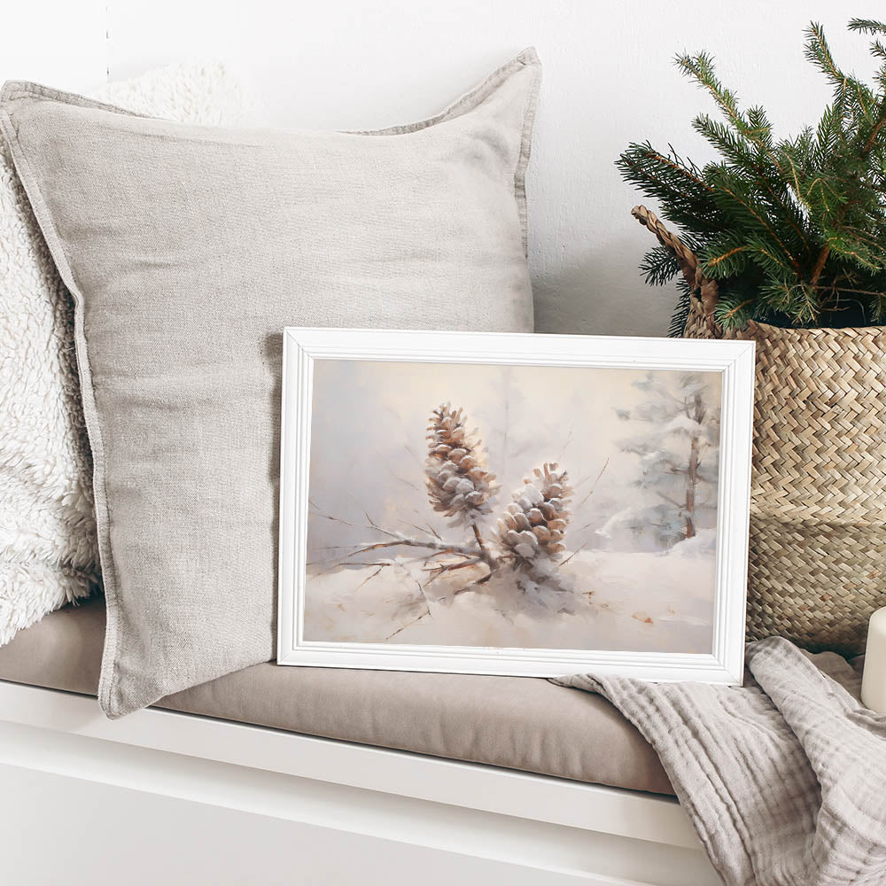 Embrace the serene beauty of winter with this stunning Christmas Wall Art, featuring a pair of snow-covered pinecones resting gently on a peaceful, frosty landscape. The soft neutral tones, delicate brushstrokes, and subtle light bring a sense of tranquility, making this artwork a perfect addition to your seasonal decor. Whether displayed in your living room, hallway, or bedroom, this Christmas Canvas Art adds a refined touch of nature’s winter charm to your space.