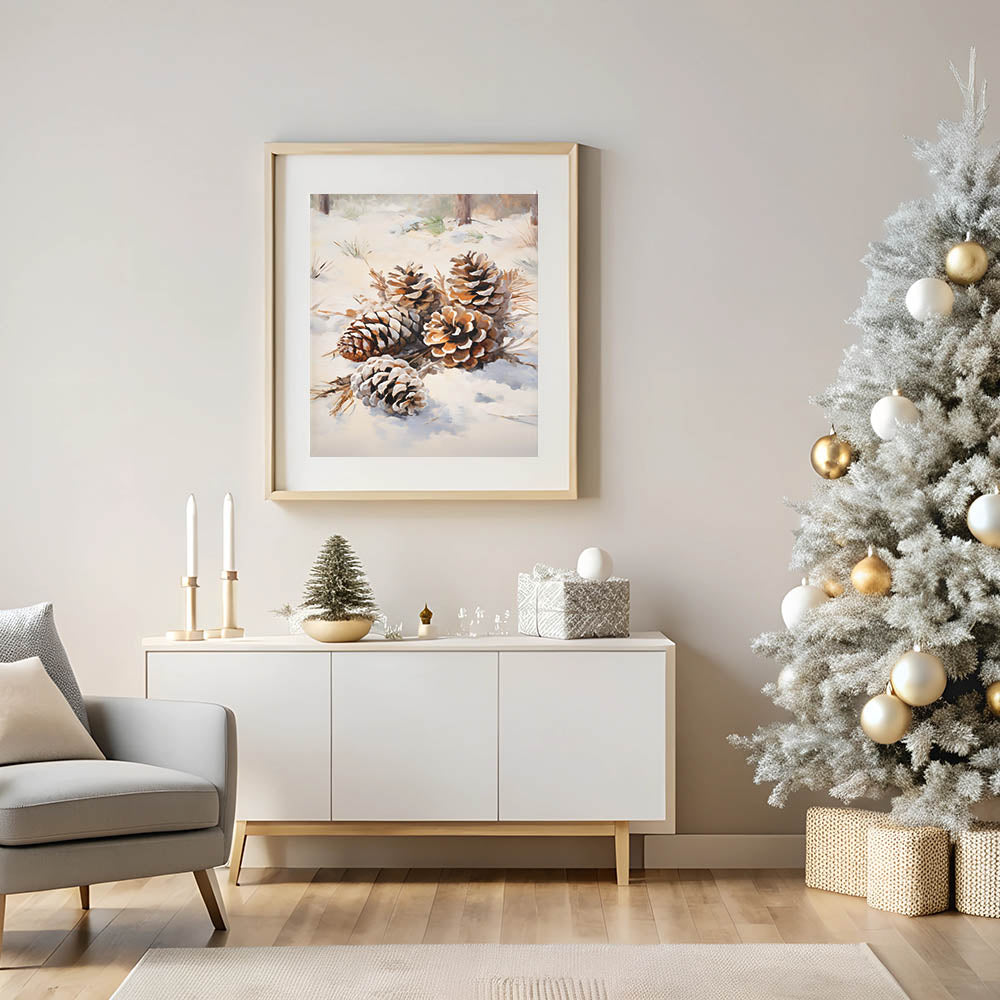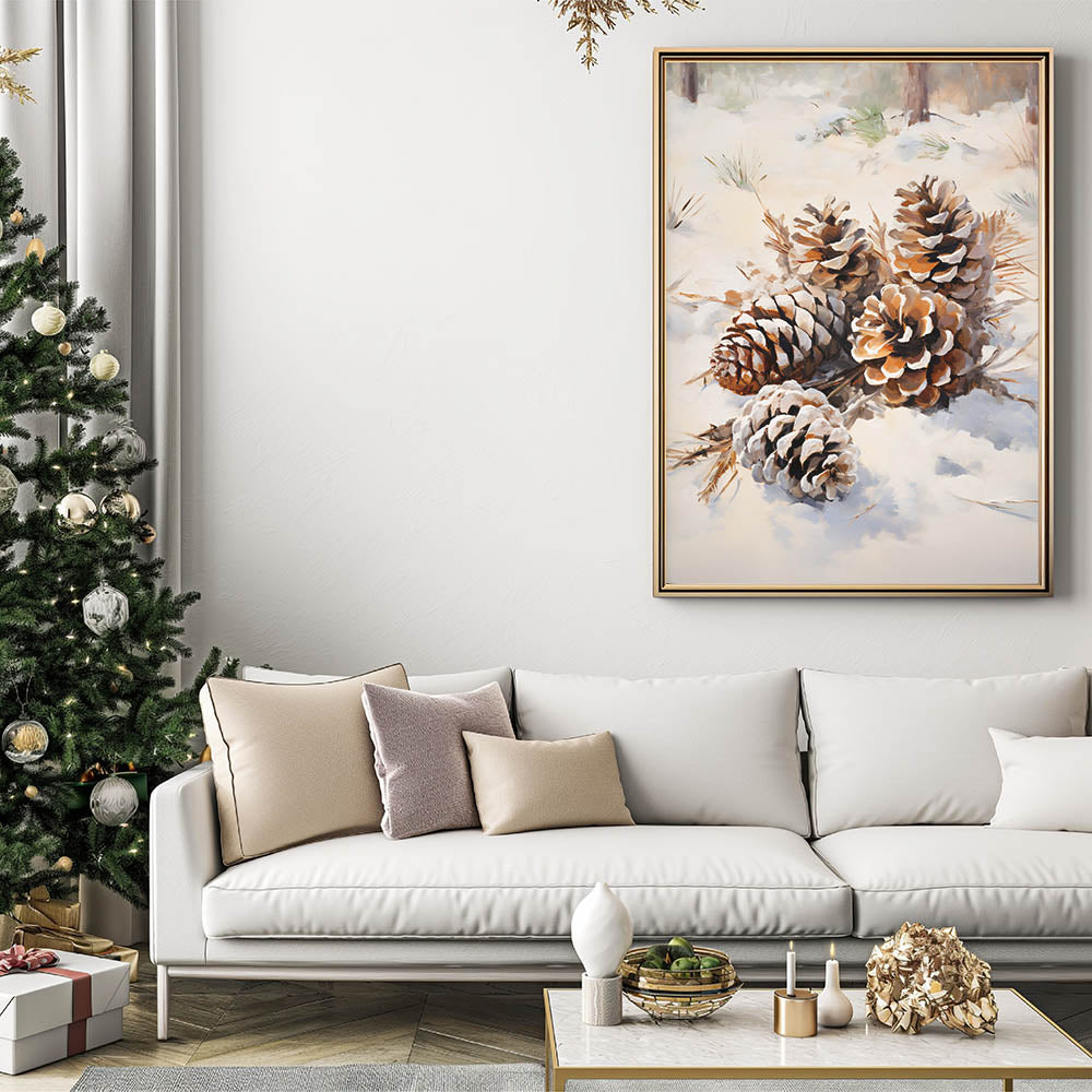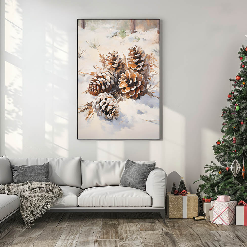 Embrace the beauty of winter with this stunning Christmas Wall Decorations piece, featuring a collection of snow-dusted pinecones resting gently on a crisp winter landscape. The soft natural tones, intricate details, and delicate snowfall create a serene and rustic holiday aesthetic, making this artwork a perfect addition to your seasonal decor. Whether displayed in your living room, cabin, or entryway, this piece brings a cozy, nature-inspired charm to your home.