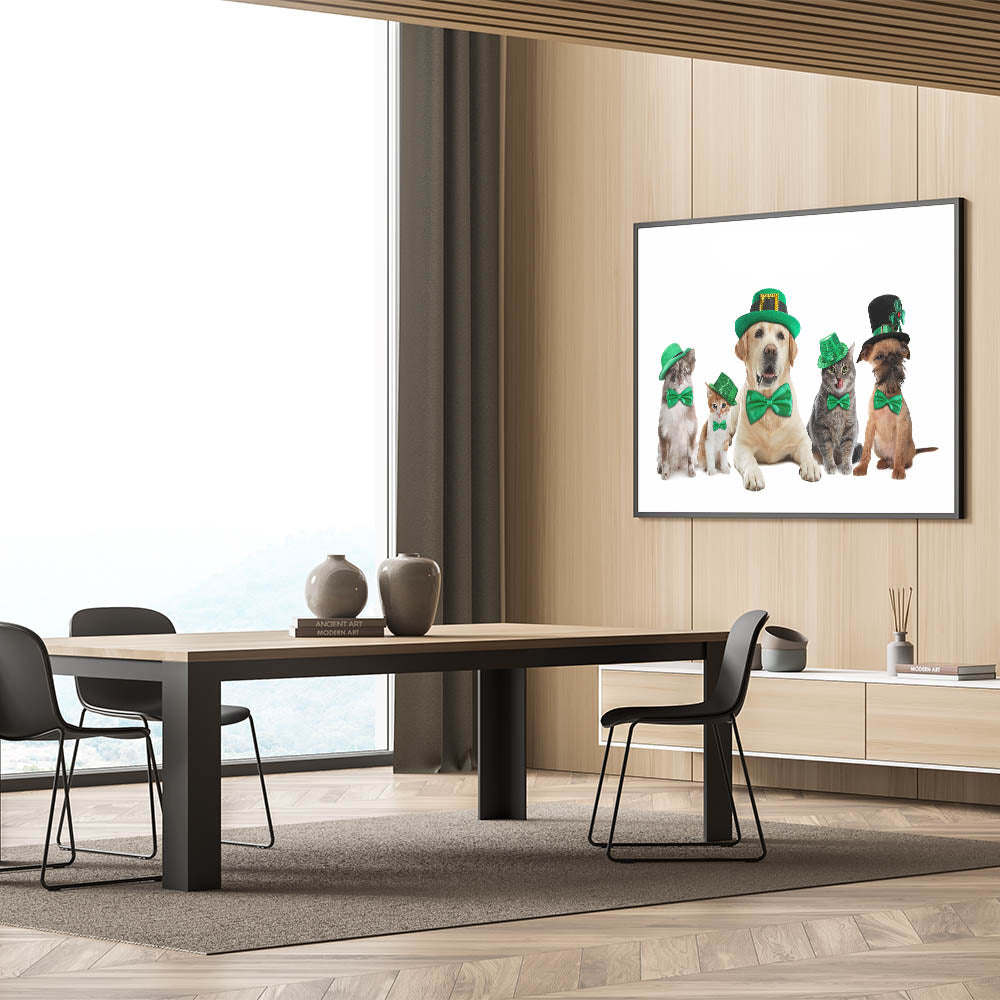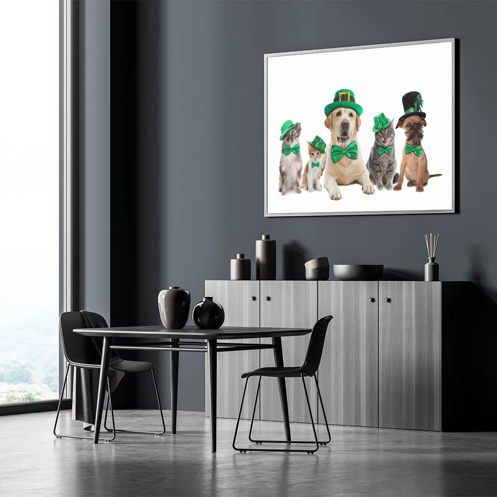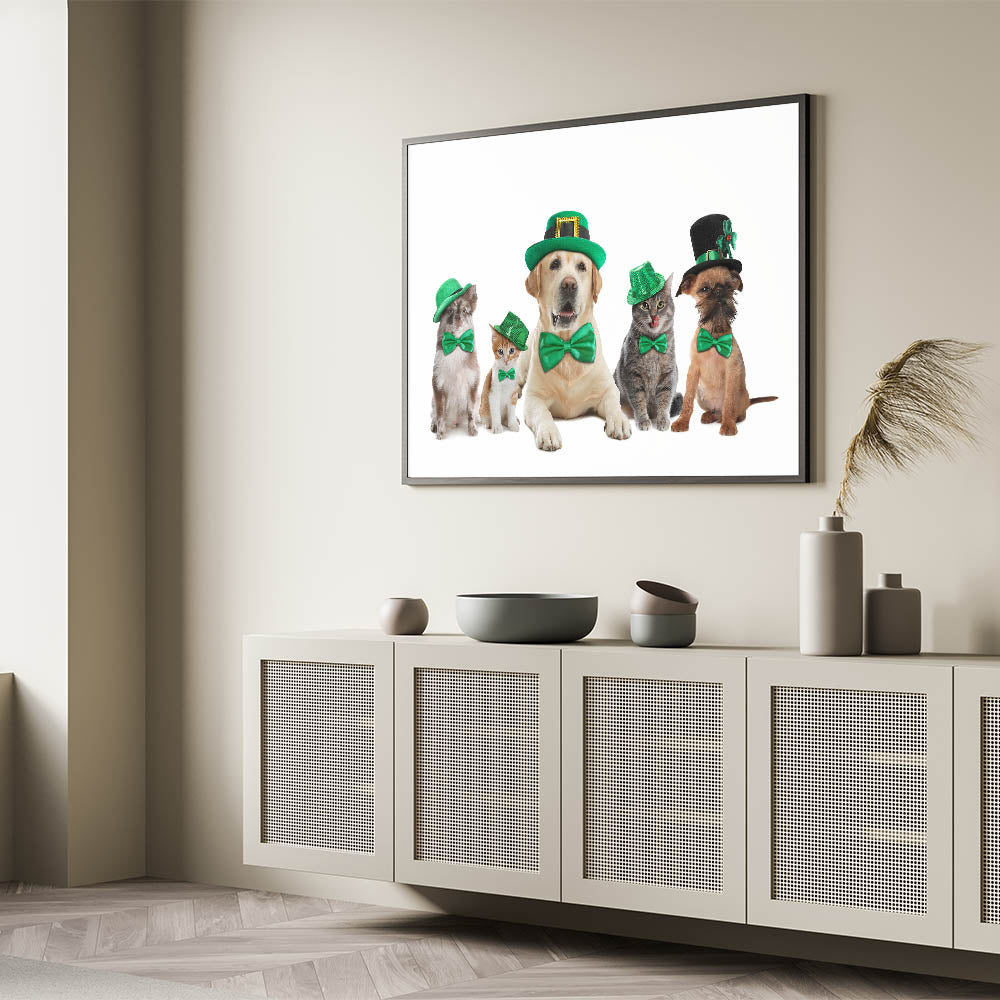Celebrate St. Patrick’s Day in the most adorable way with this St. Patrick’s Day Wall Art, featuring a charming group of pets dressed in festive leprechaun hats and bow ties. This heartwarming Irish Wall Art is perfect for pet lovers who want to add a fun and cheerful touch to their holiday decor.