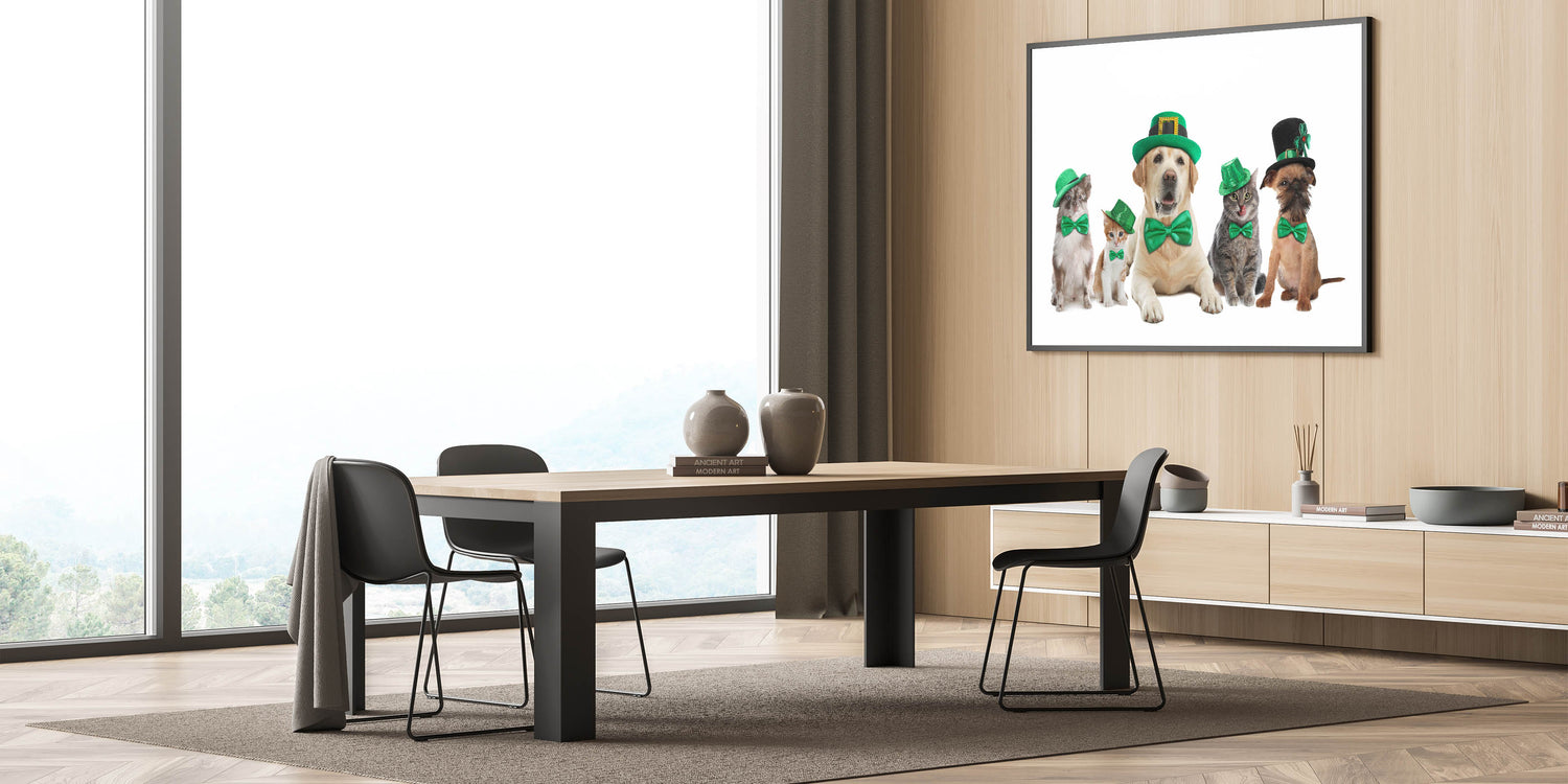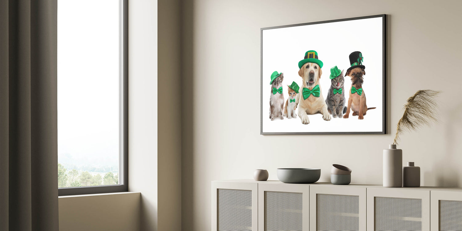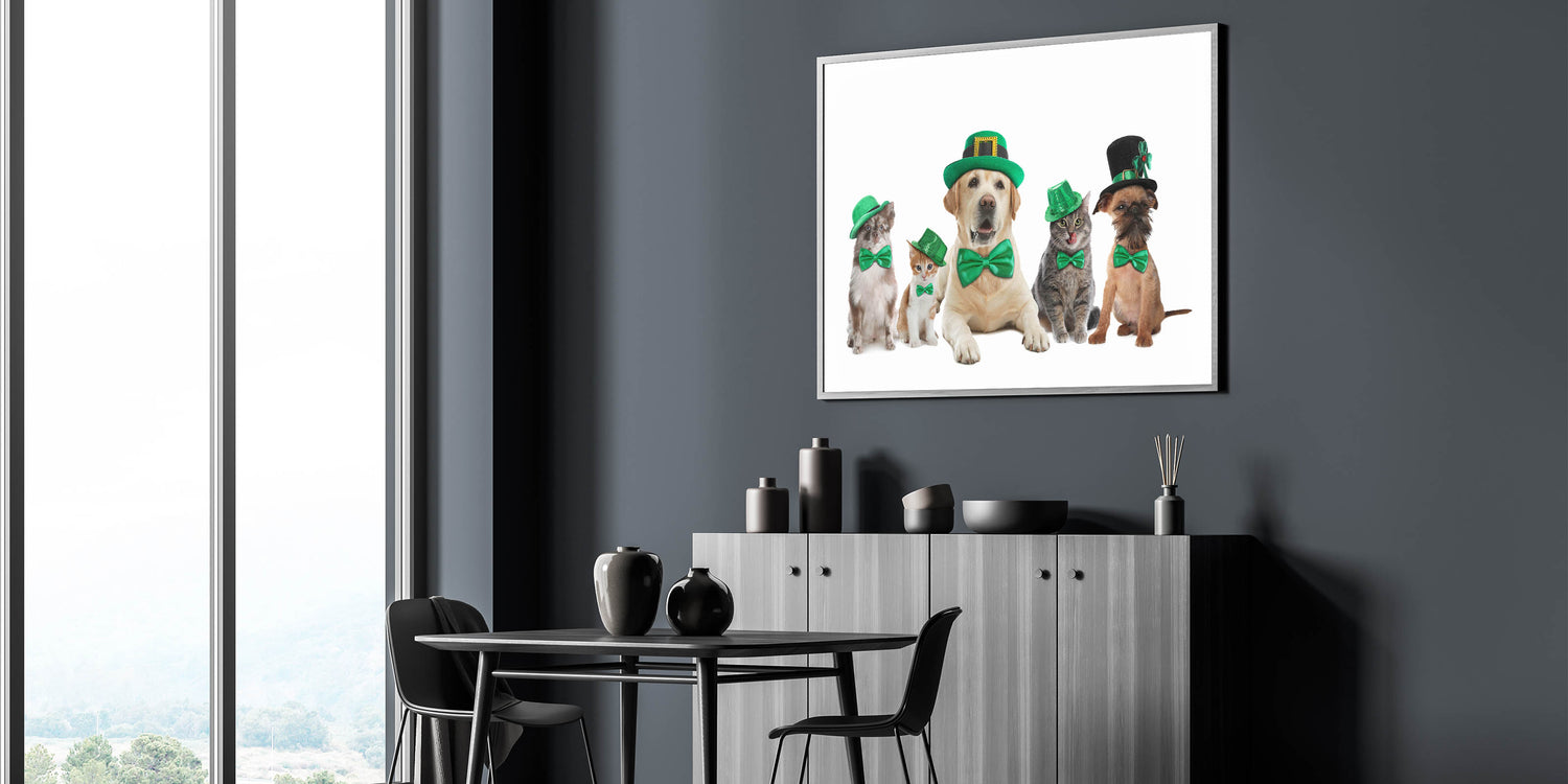 Celebrate St. Patrick’s Day in the most adorable way with this St. Patrick’s Day Wall Art, featuring a charming group of pets dressed in festive leprechaun hats and bow ties. This heartwarming Irish Wall Art is perfect for pet lovers who want to add a fun and cheerful touch to their holiday decor.