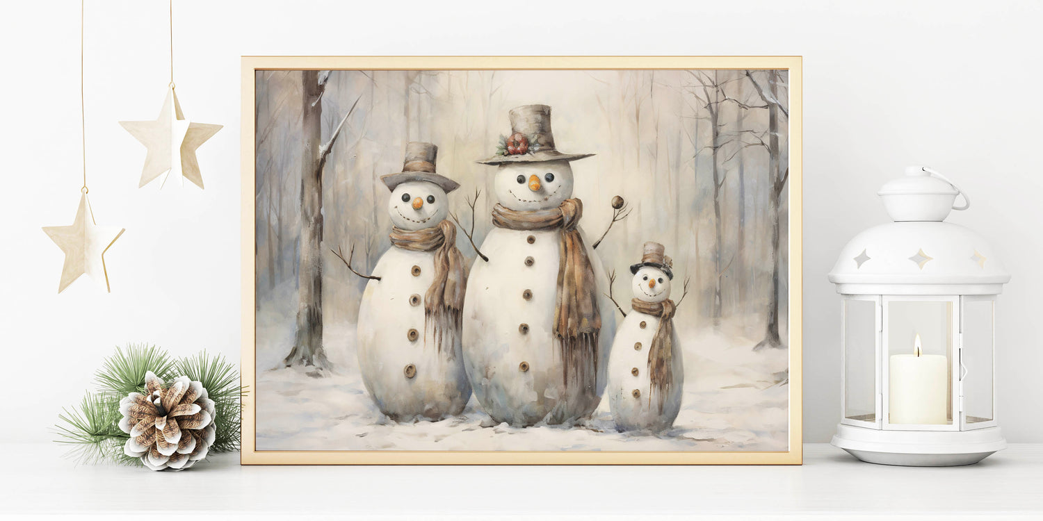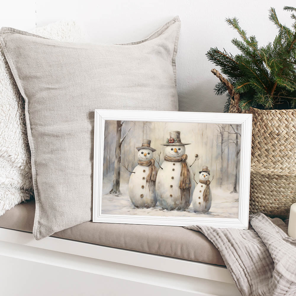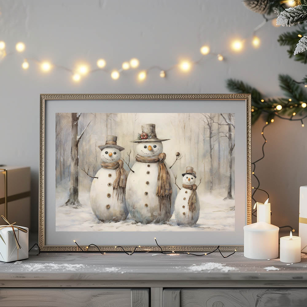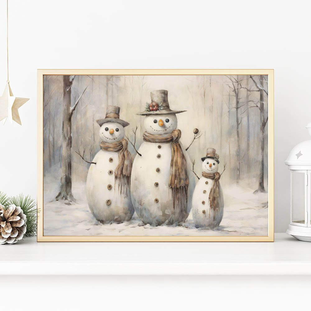 Celebrate the magic of the holiday season with this charming Christmas Art Prints design, featuring an adorable snowman family dressed in warm scarves and festive hats. The serene winter landscape, soft brushstrokes, and muted earthy tones create a cozy and nostalgic ambiance, making this artwork a perfect addition to your seasonal decor. Whether placed in your living room, hallway, or children's room, this piece brings a heartwarming festive spirit to your home.