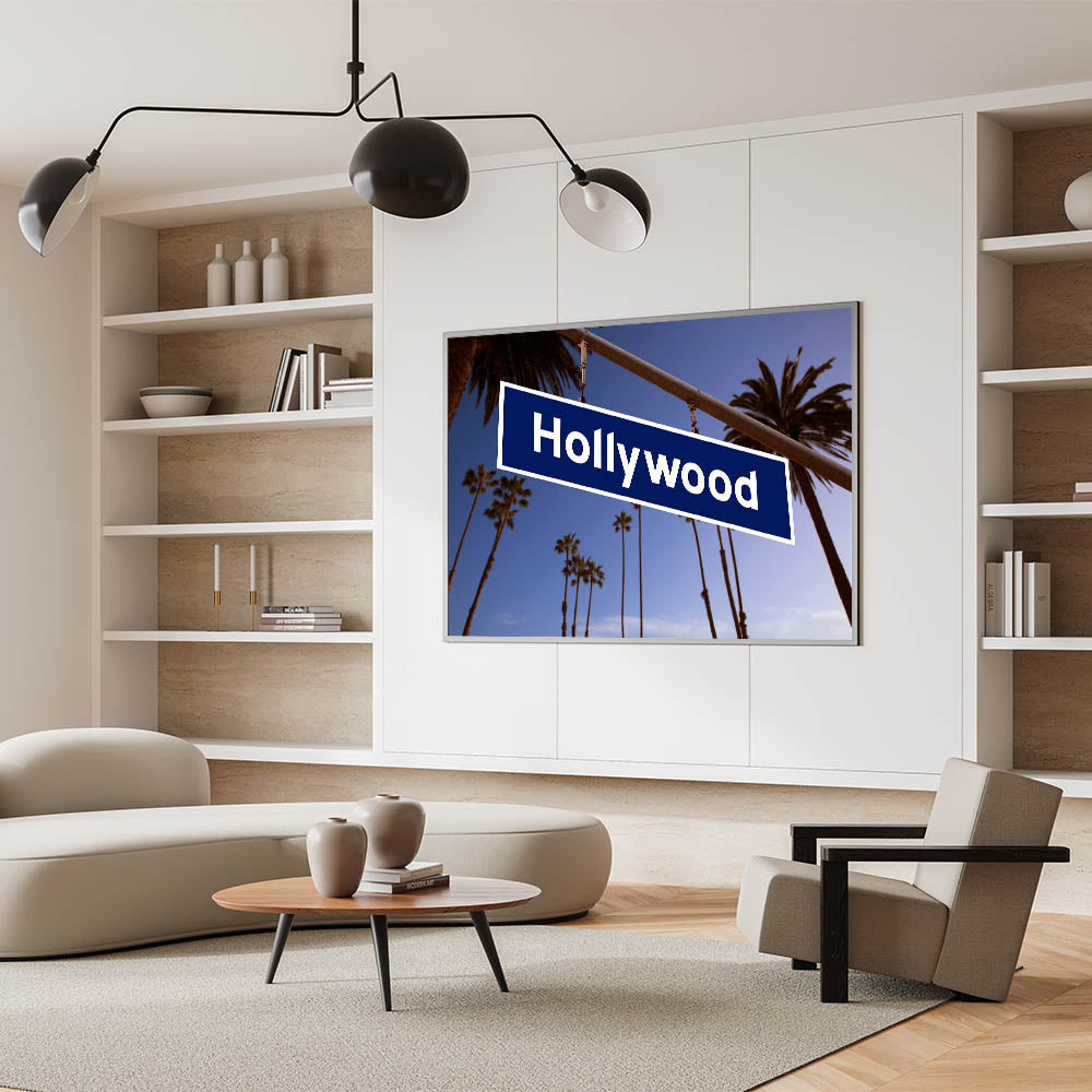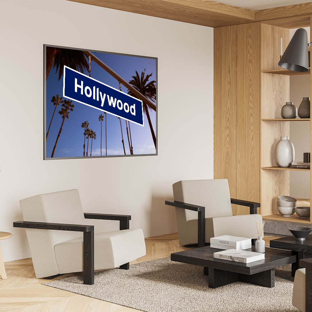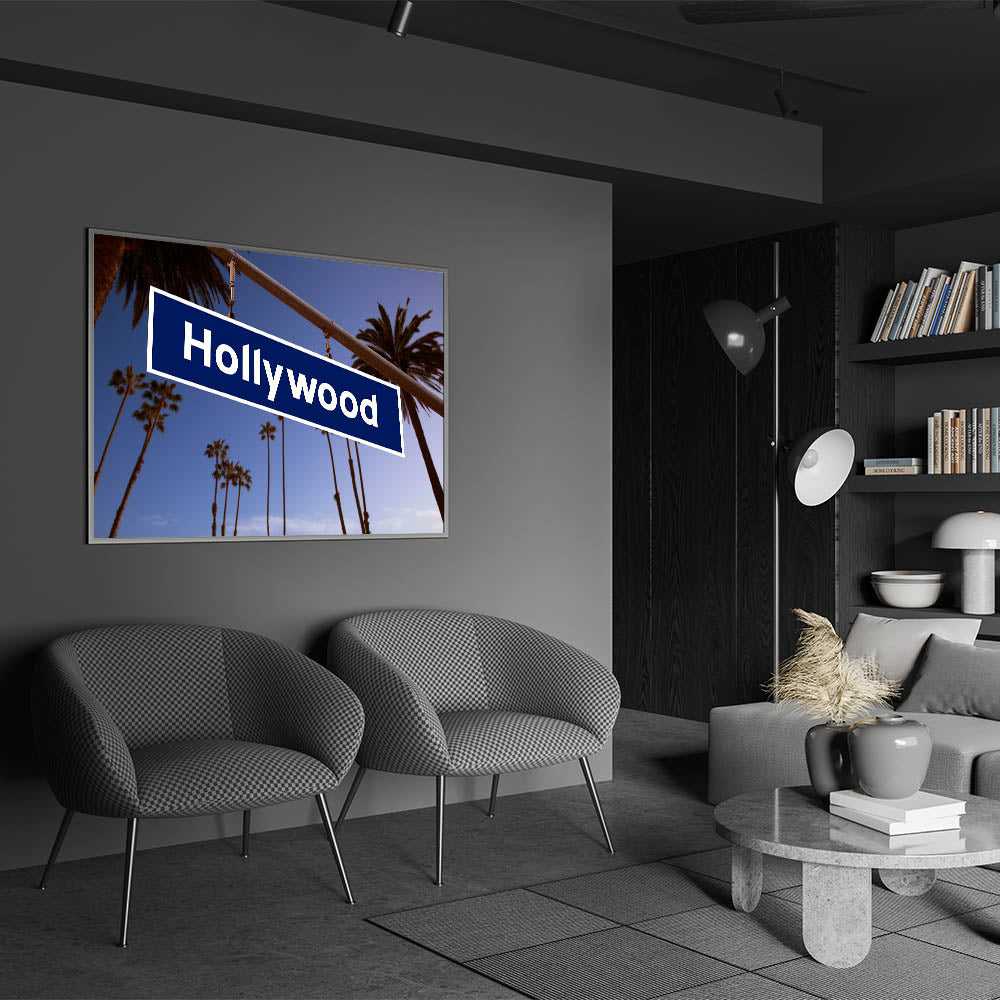 This Hollywood art for your living room brings a timeless yet modern aesthetic, celebrating one of the world's most recognizable cultural hubs. With scenic views of palm trees and a clear blue sky, this artwork offers a captivating blend of California art decor that fits any style.