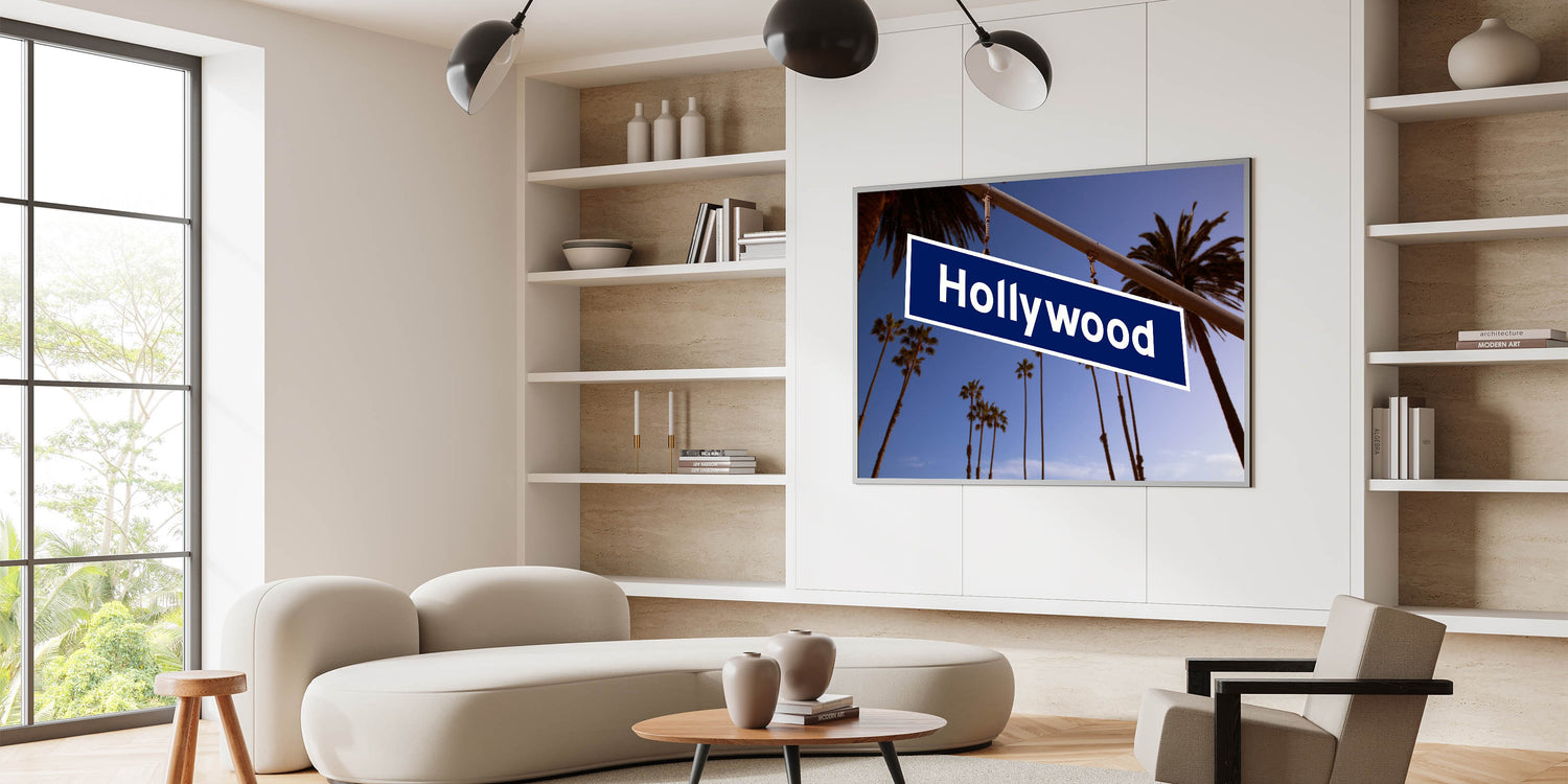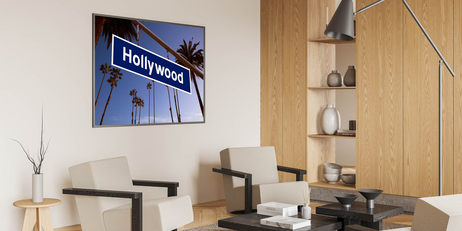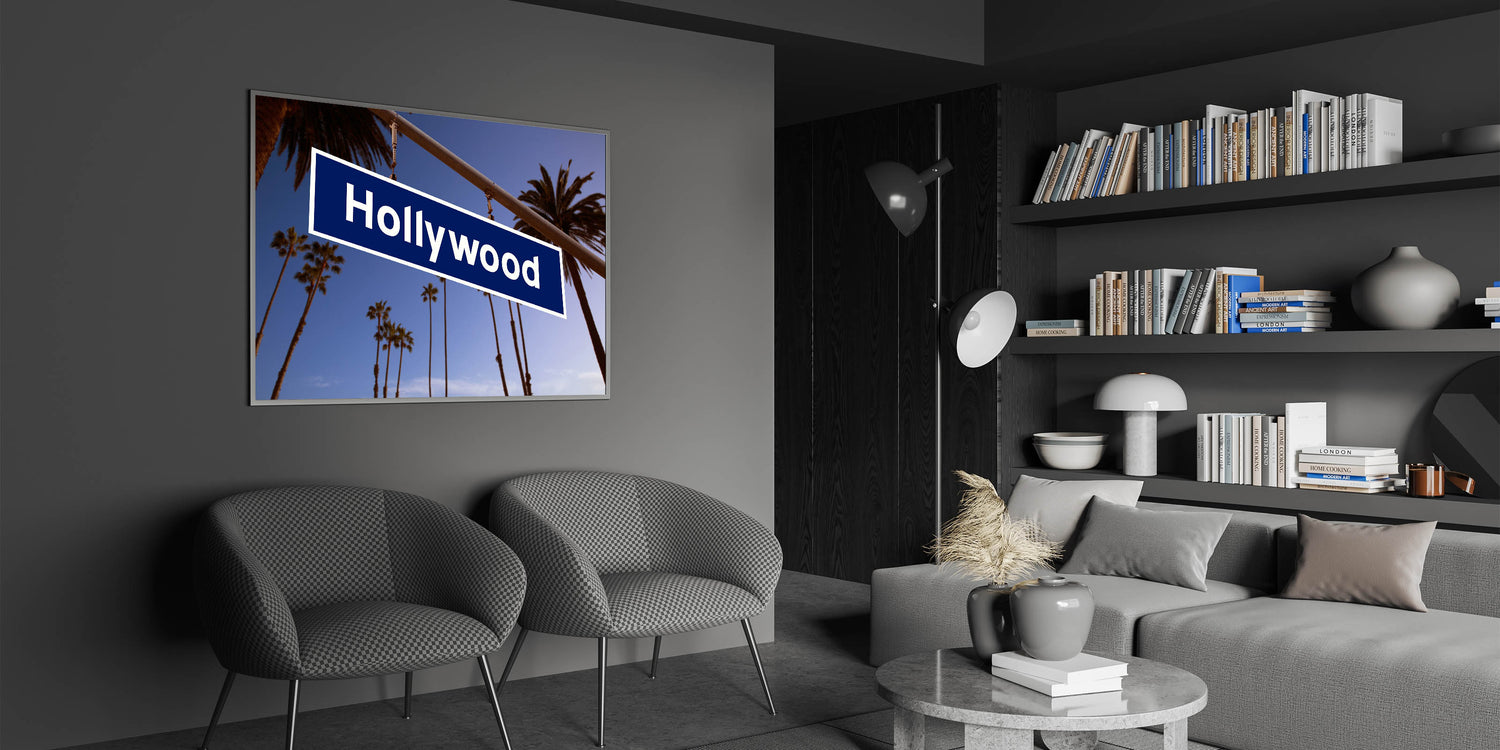 This Hollywood art for your living room brings a timeless yet modern aesthetic, celebrating one of the world's most recognizable cultural hubs. With scenic views of palm trees and a clear blue sky, this artwork offers a captivating blend of California art decor that fits any style.