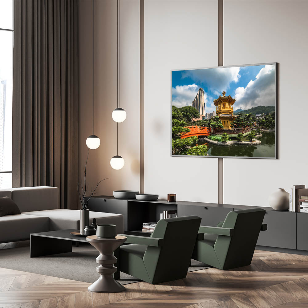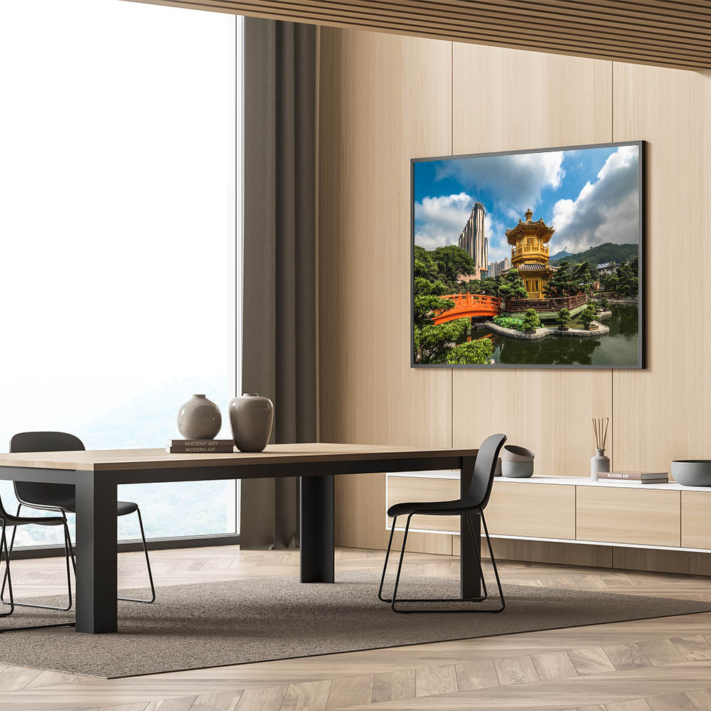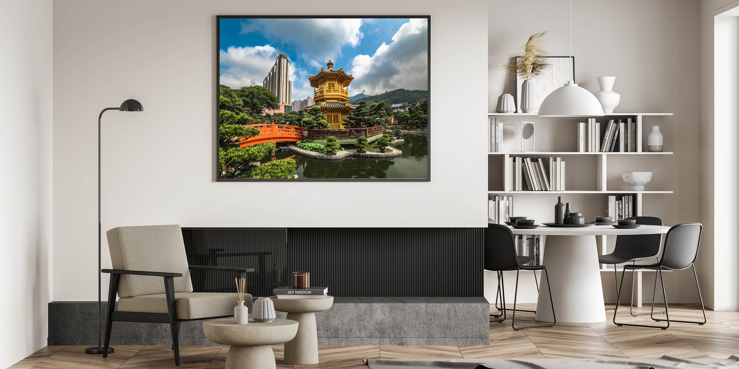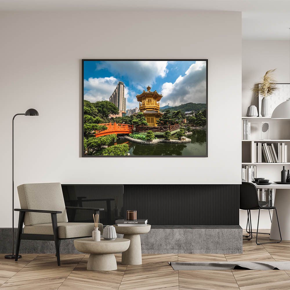 Bring the tranquil beauty of Hong Kong’s traditional architecture into your home with this stunning artwork. The detailed greenery, serene pond, and striking contrast between the pagoda and city skyline make this piece a perfect focal point for any room. Elevate your space with this harmonious fusion of old and new.