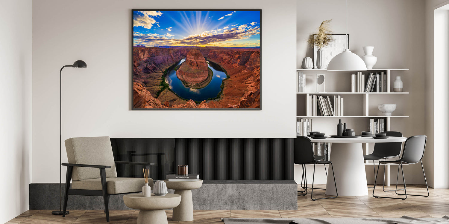 Immerse yourself in the stunning beauty of Arizona's landscape with this captivating view of Horseshoe Bend, beautifully illuminated by radiant sun rays. This scenic Horseshoe Bend print captures the grandeur of the Southwest, with the iconic curve of the Colorado River winding through the majestic red rock canyons. Perfect for any room, this nature-inspired wall art is available in multiple formats including Stretched Canvas, Framed Prints, and Acrylic Glass. The vibrant colors and intricate details make it an ideal addition to any home decor, adding a touch of Southwest charm and natural beauty.
